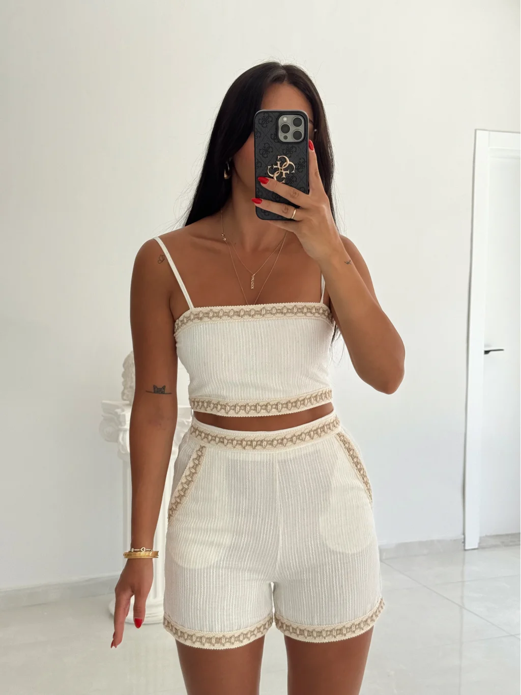 MYRA İşleme Detaylı Keten Şort - Ekru, yaz aylarında şıklığı ve rahatlığı bir arada sunar.