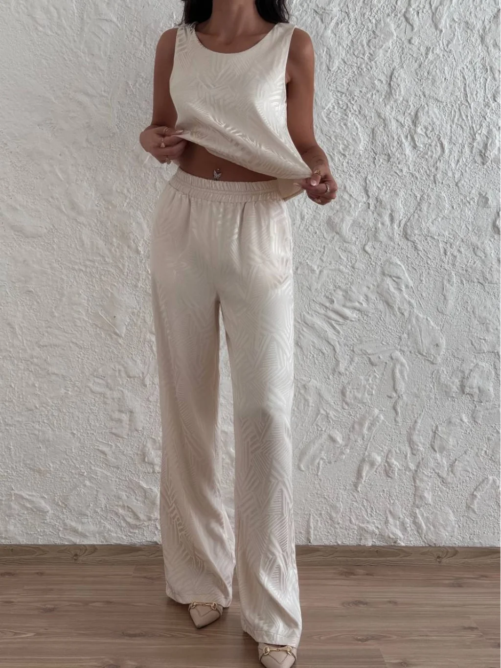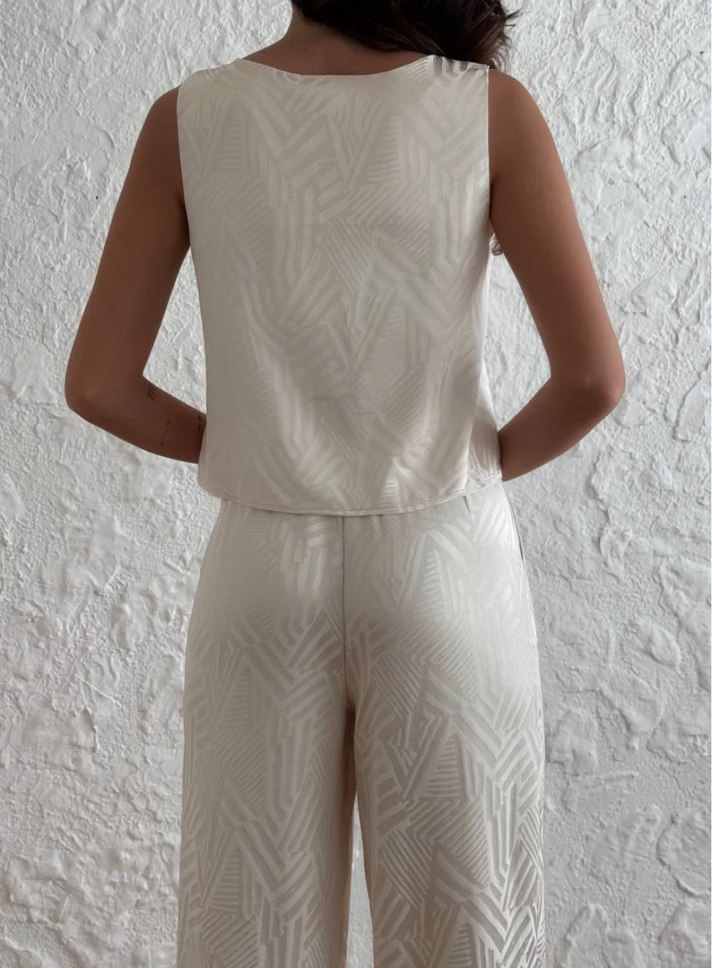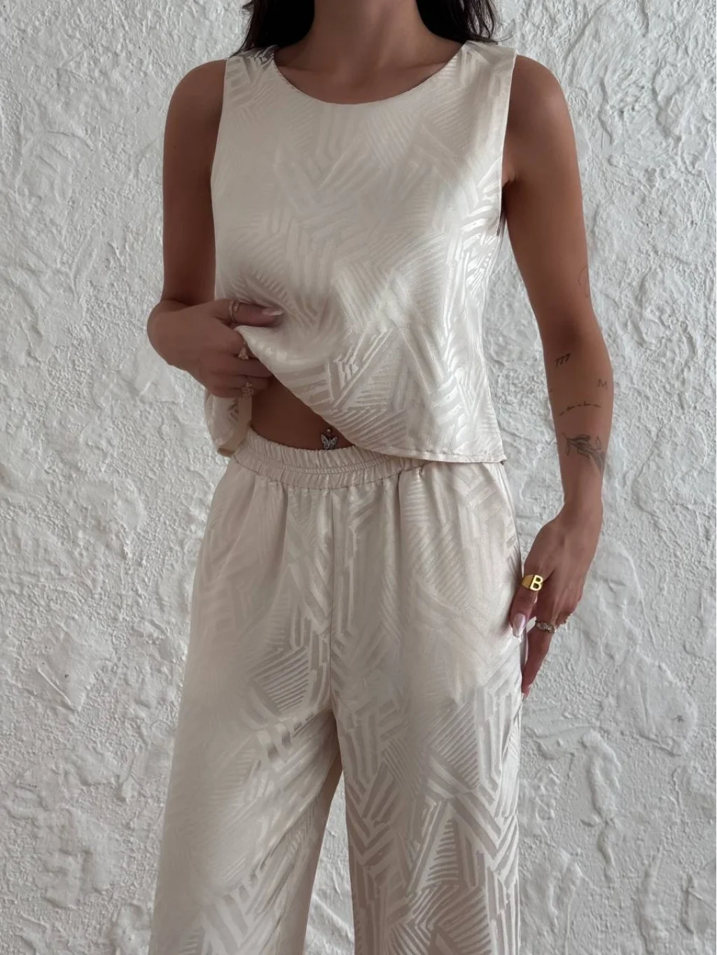 Kalın Askılı Siyah Jakarlı Saten Bluz ve Beli Lastikli Yüksek Bel Jakarlı Saten Pantolon
