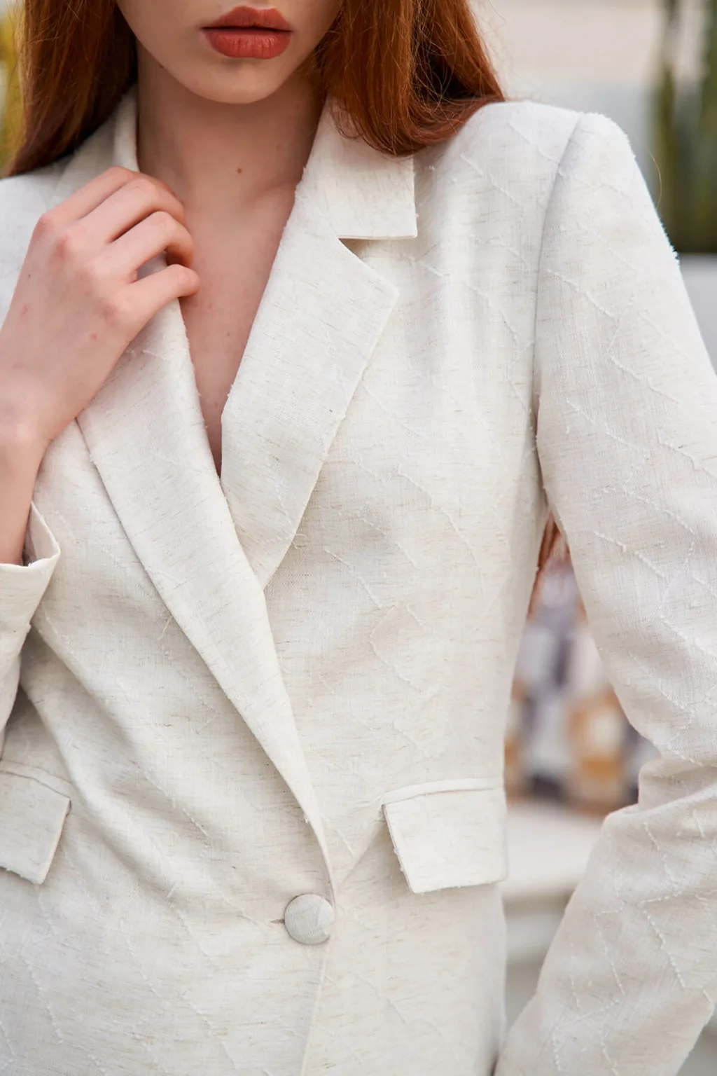 Jakarlı Tek Düğme Kapamalı Astarlı Keten Dokulu Ekru Blazer Ceket