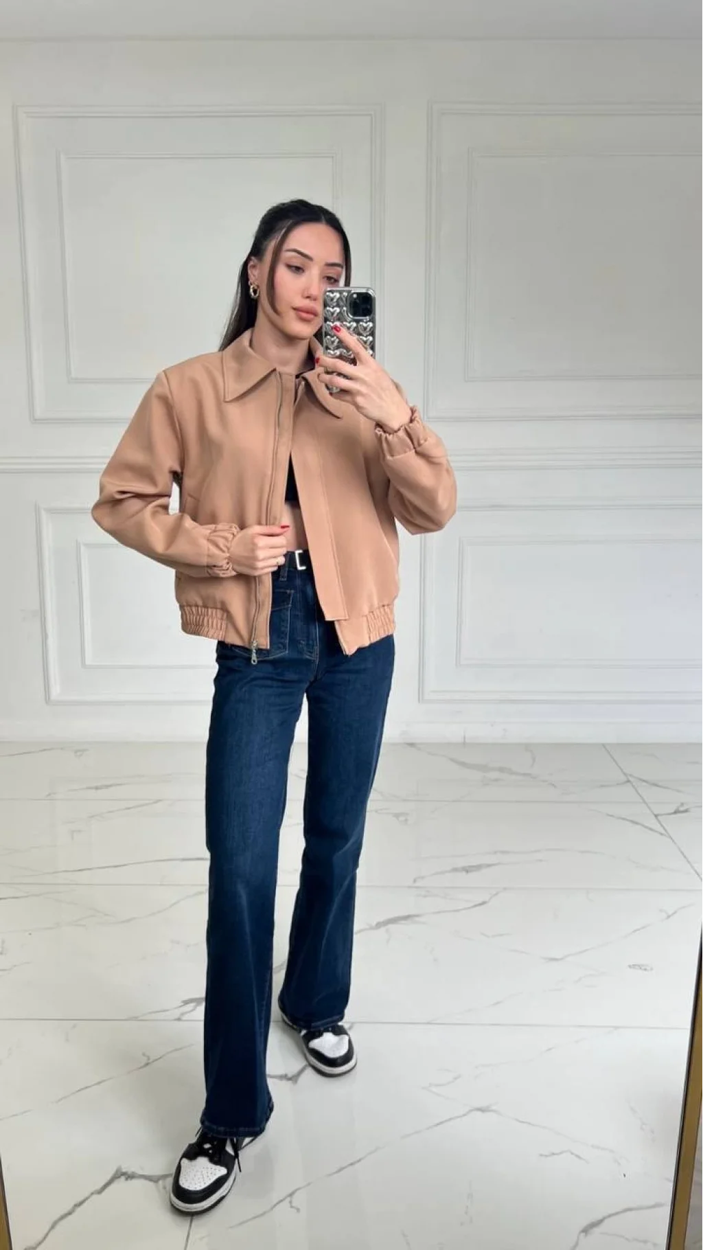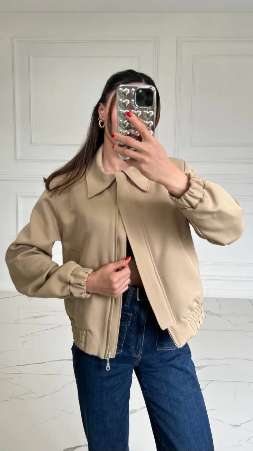 UZUN KOLLU, KATLI YAKALI, KOLU VE BELİ LASTİKLİ, ÖNÜ FERMUARLI, VATKALI BOMBER CEKET