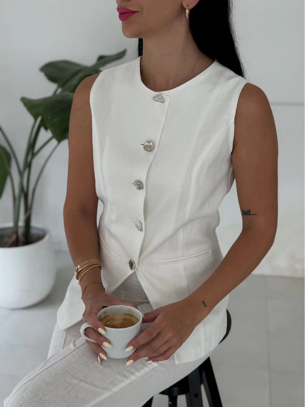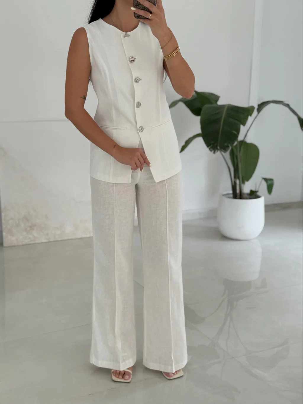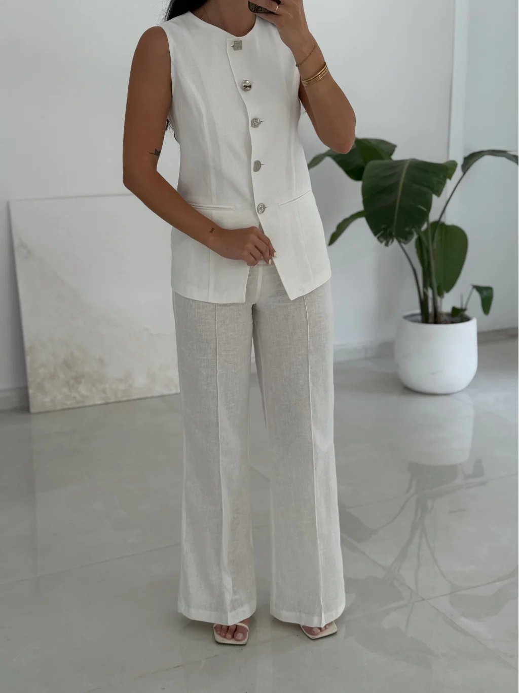 Karma Düğme Keten Yelek Pantolon Takım-Beyaz
