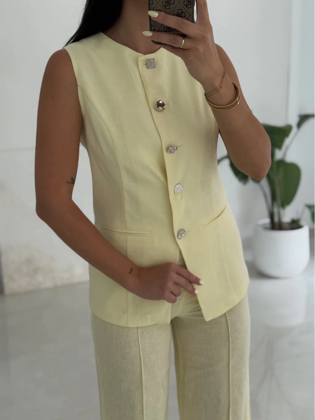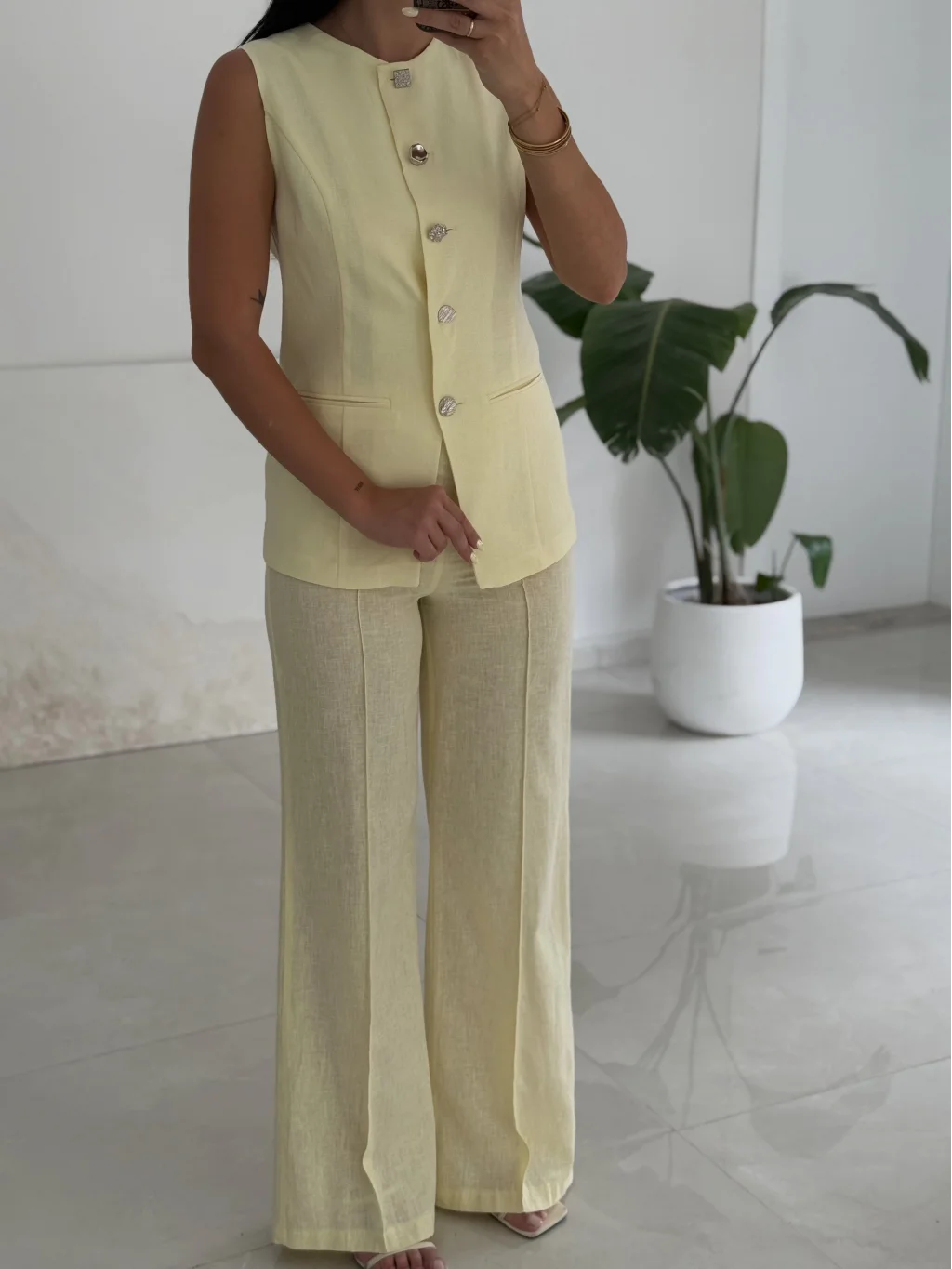 Karma Düğme Keten Yelek Pantolon Takım-Sarı