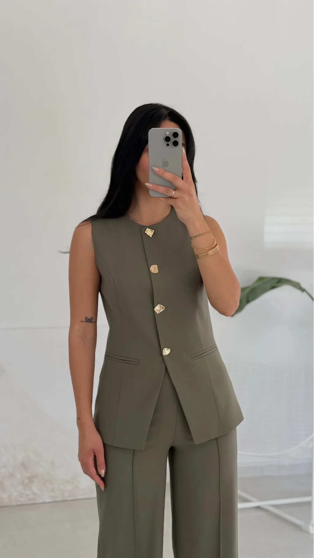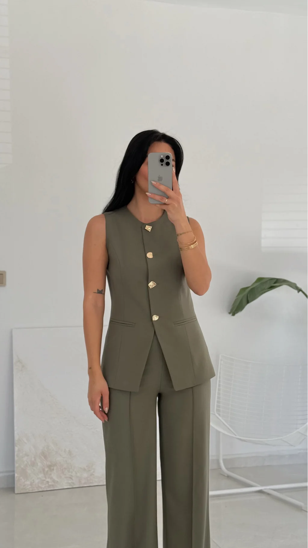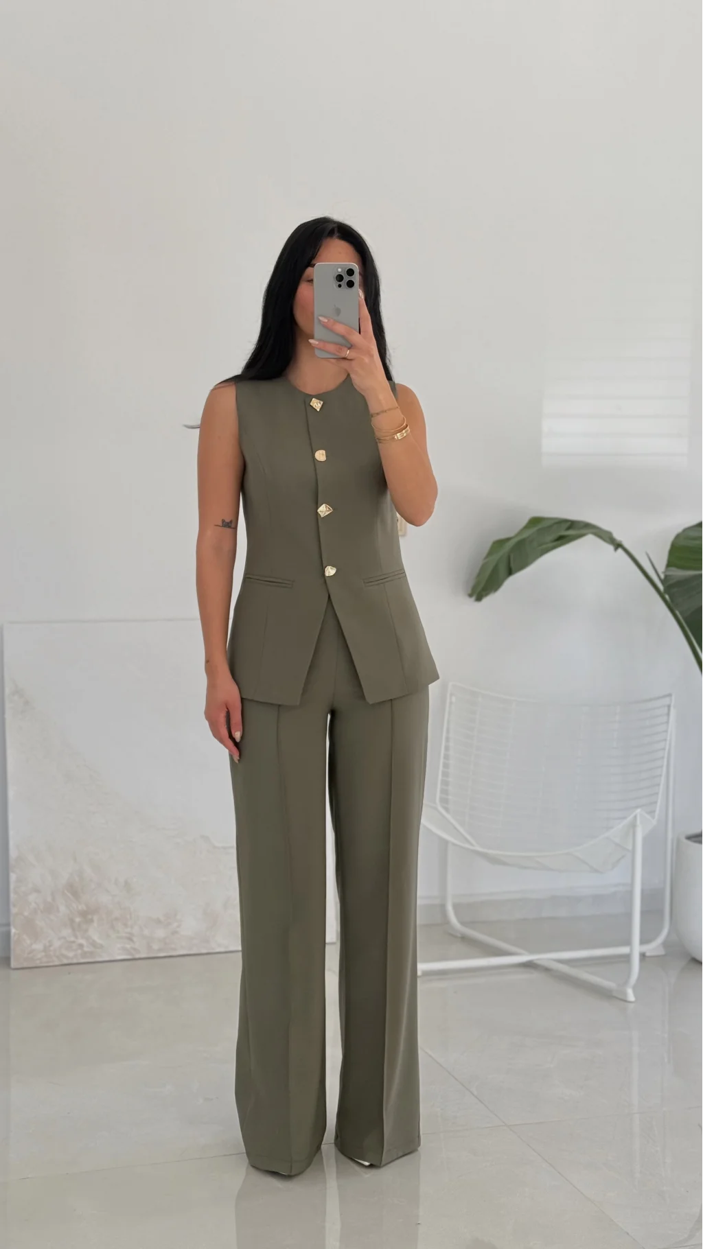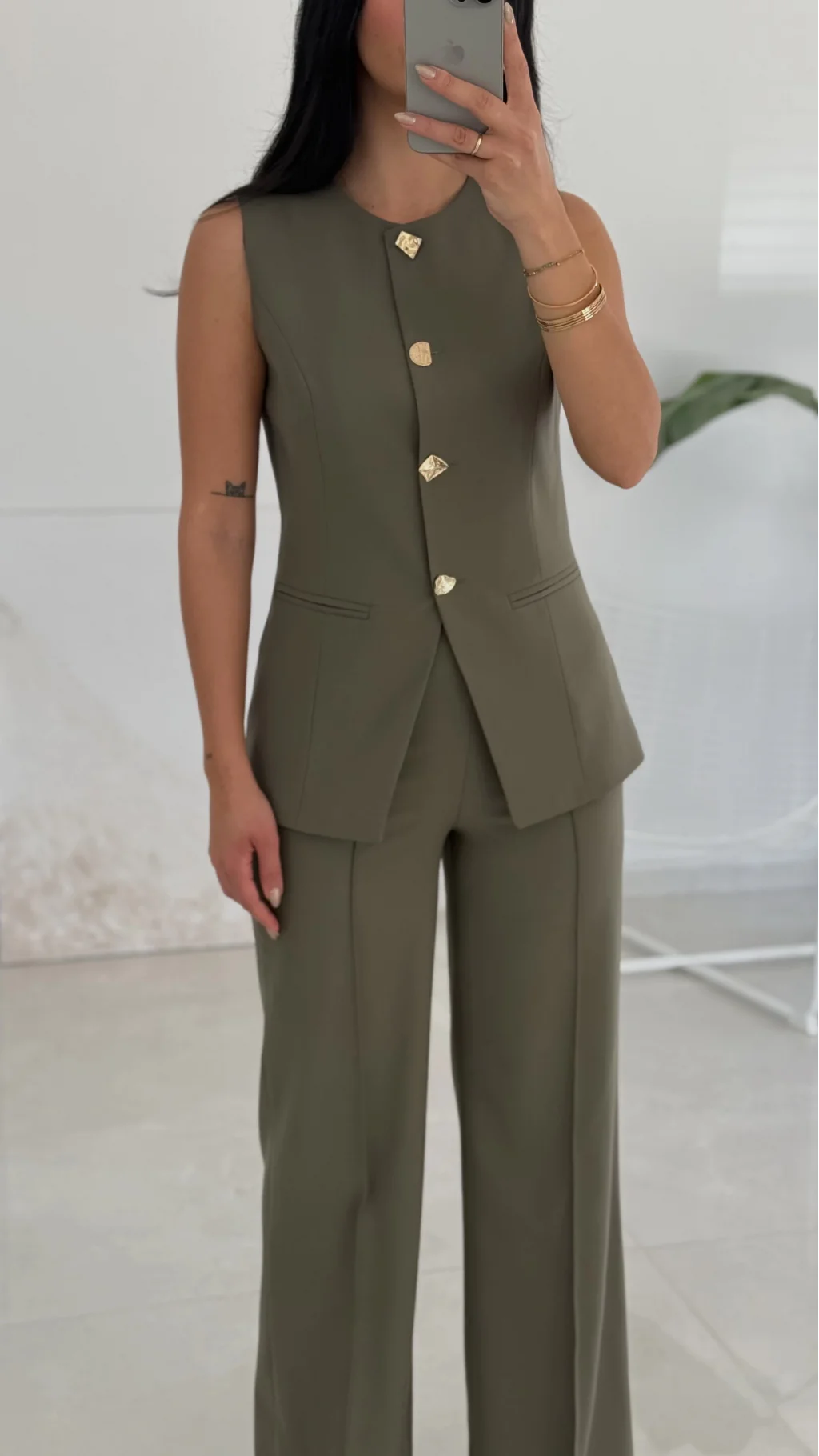 Karma Düğme Yelek Pantolon Takım - Haki