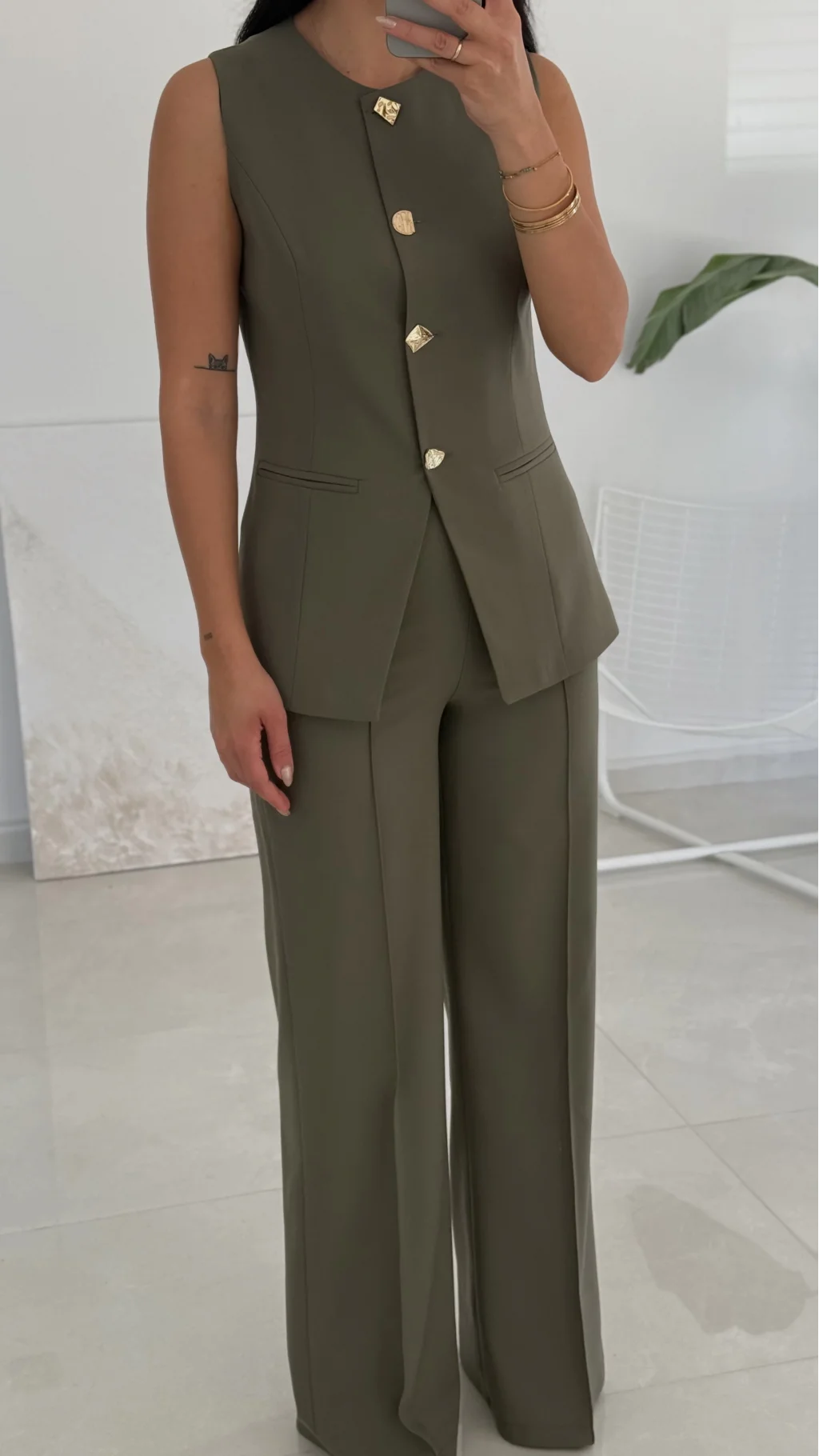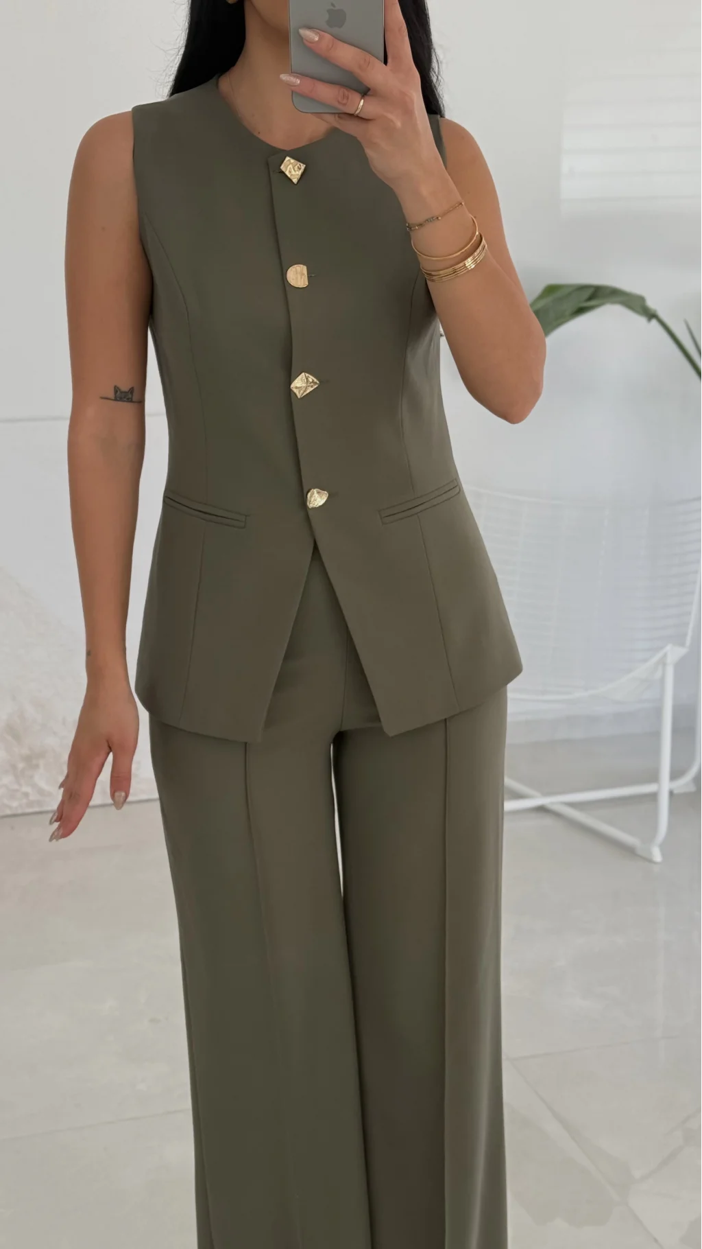 Gold Düğme Haki Yelek Pantolon Takım