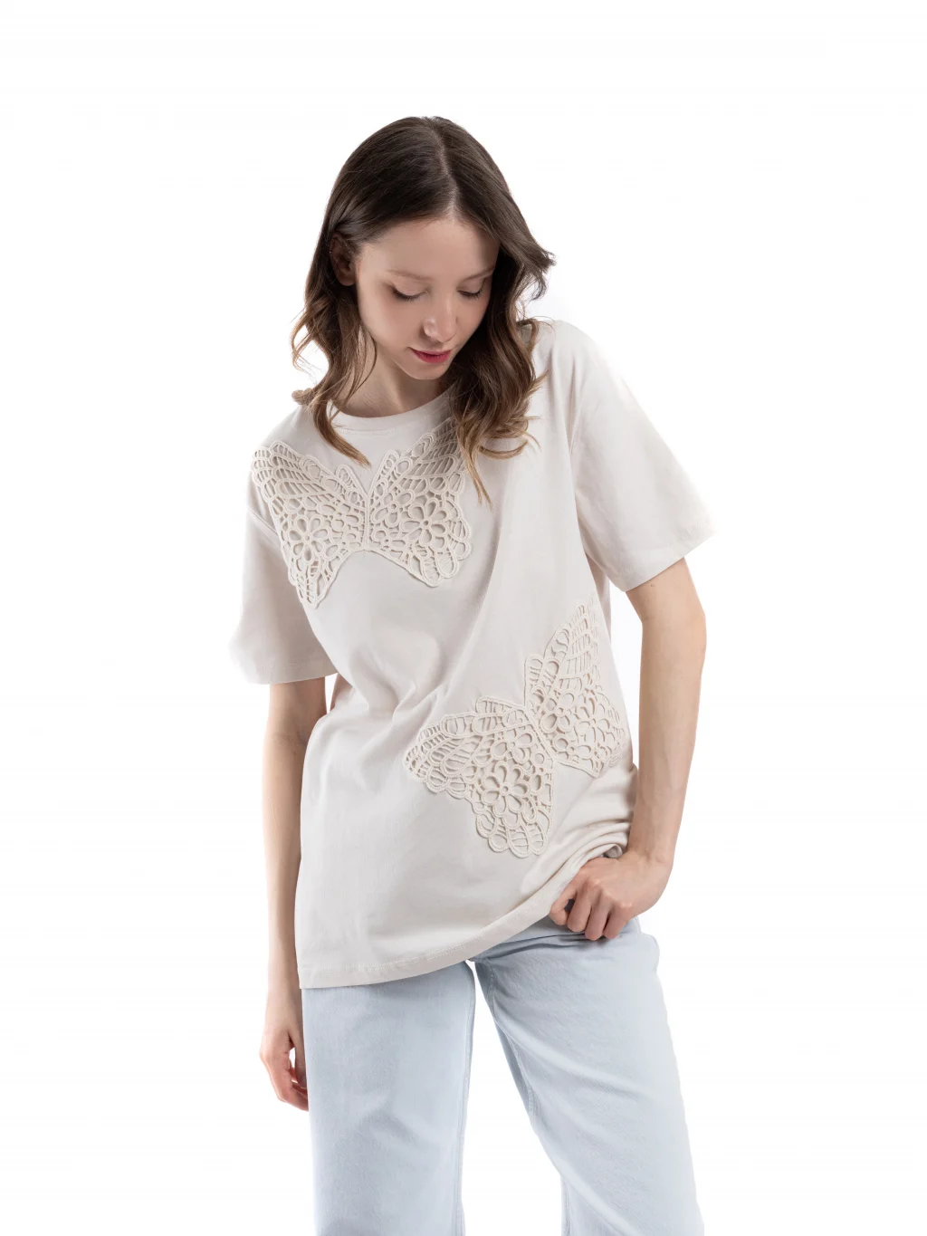 Kelebek Desenli  %100 Pamuk Krem Tişört
