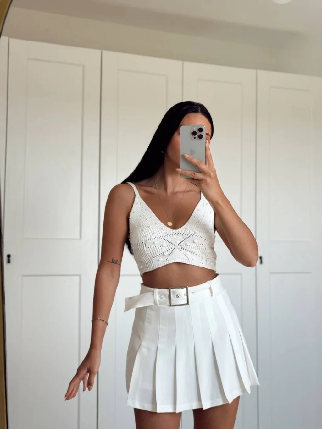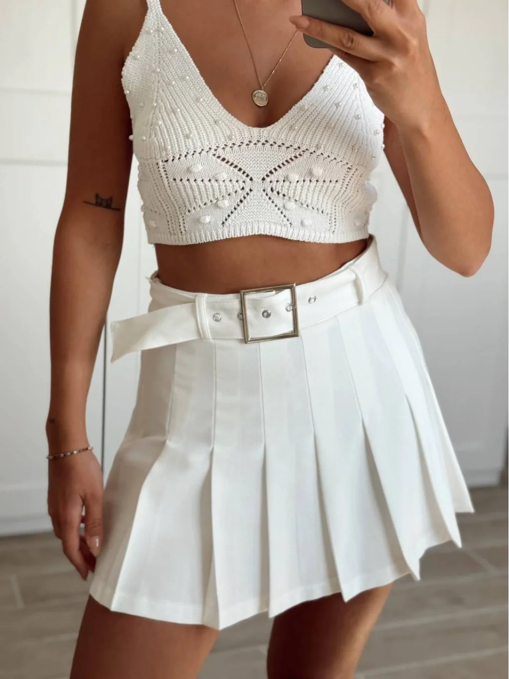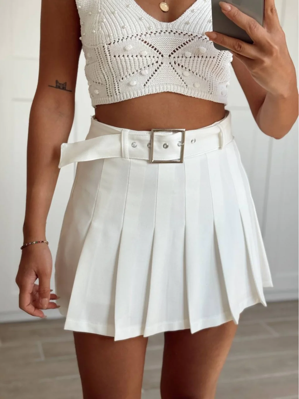 KEMER DETAYLI BEYAZ MİNİ ŞORT ETEK