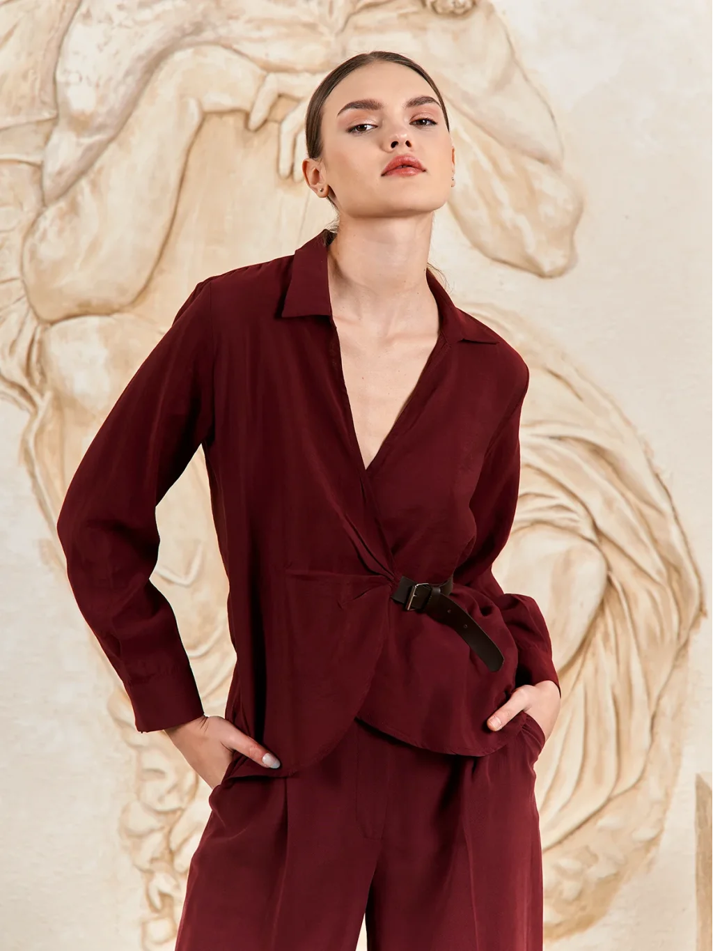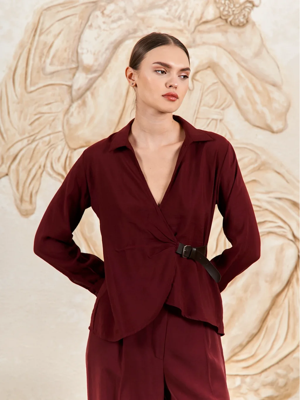 Kemer Detaylı Gömlek Görünümlü Bluz Bordo