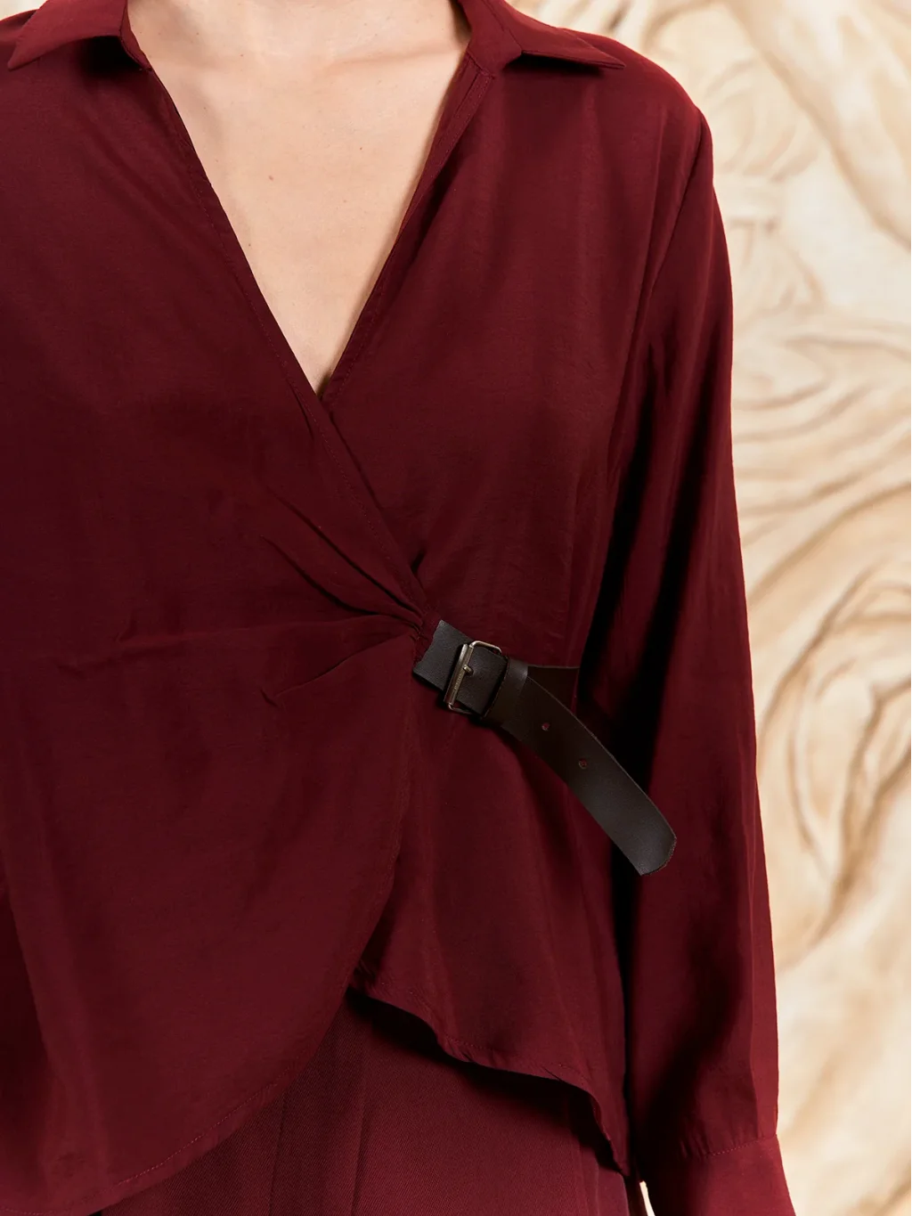 Modal Kumaş Ön Kemer Kapamalı Gömlek Bluz - Bordo