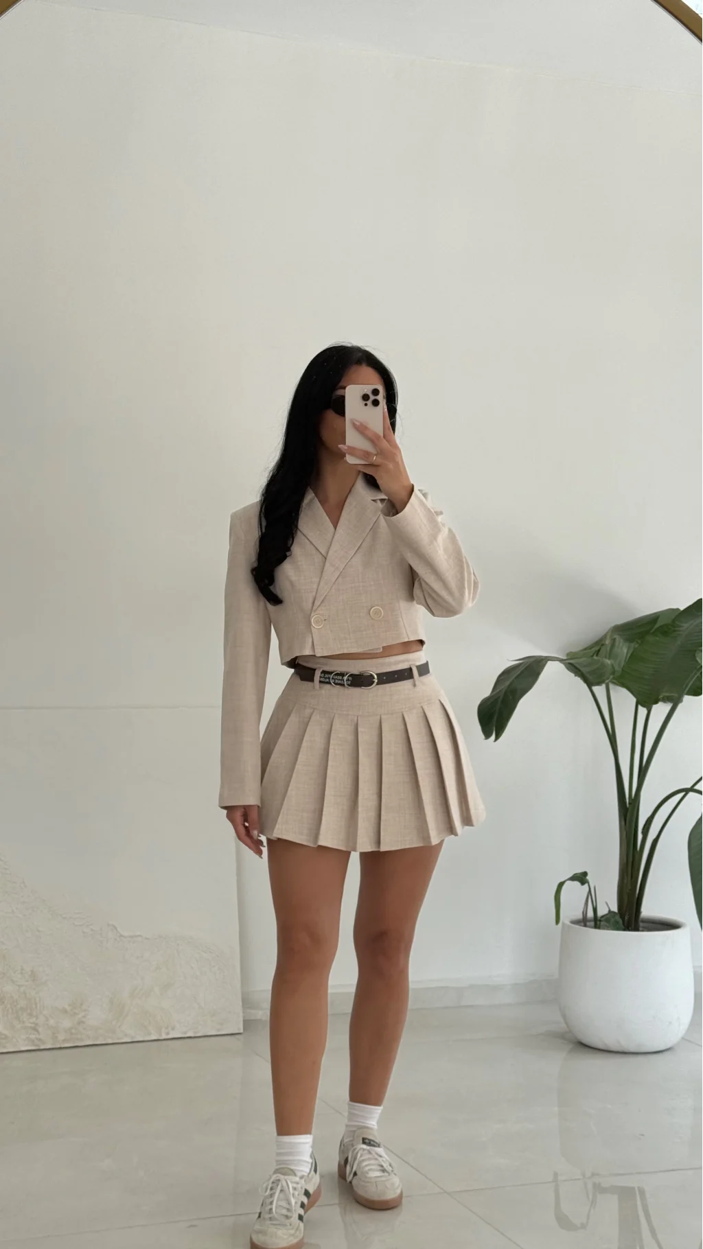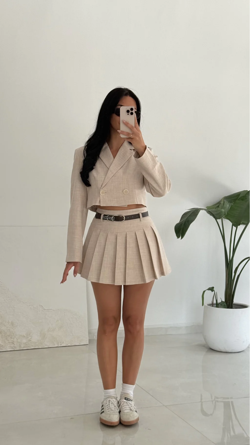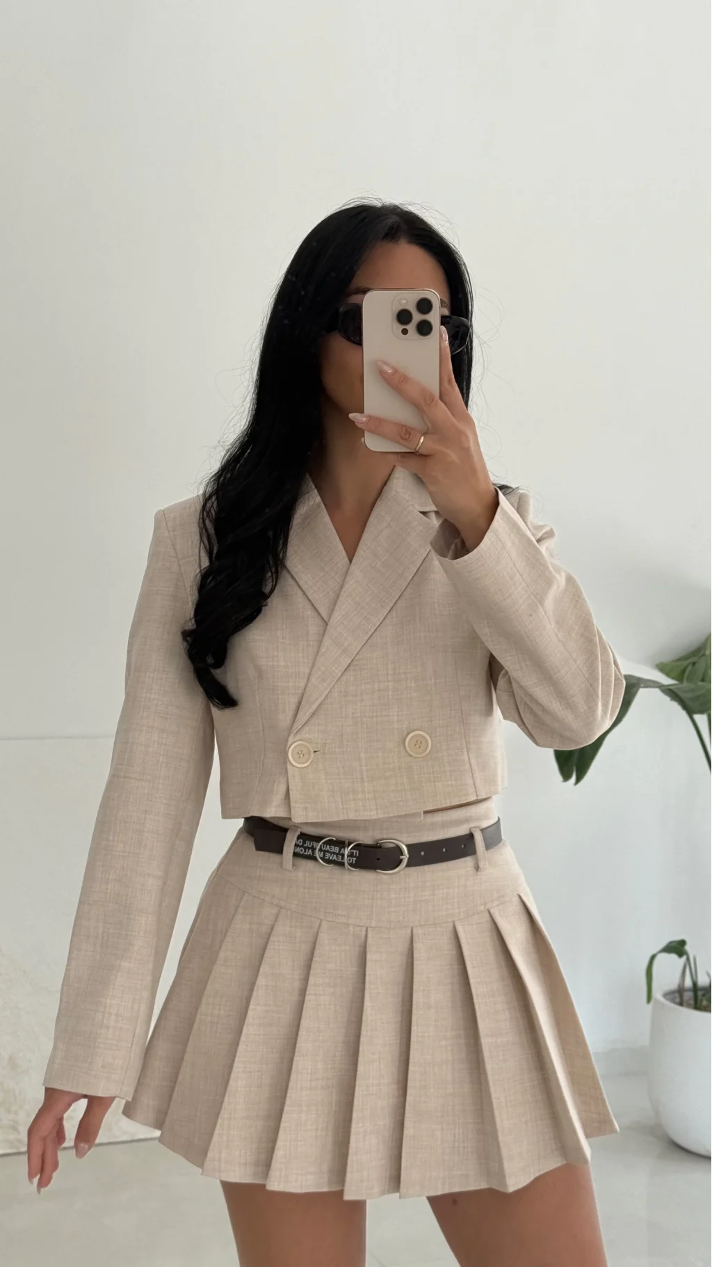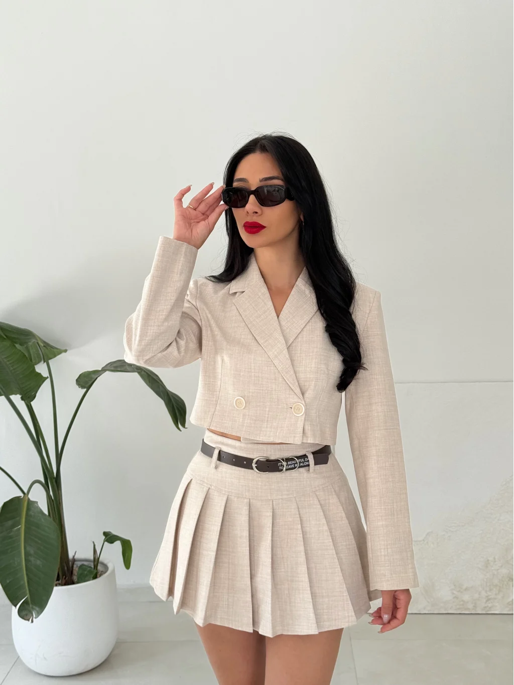 Kemer Detaylı Pileli Mini Şort Etek-Bej