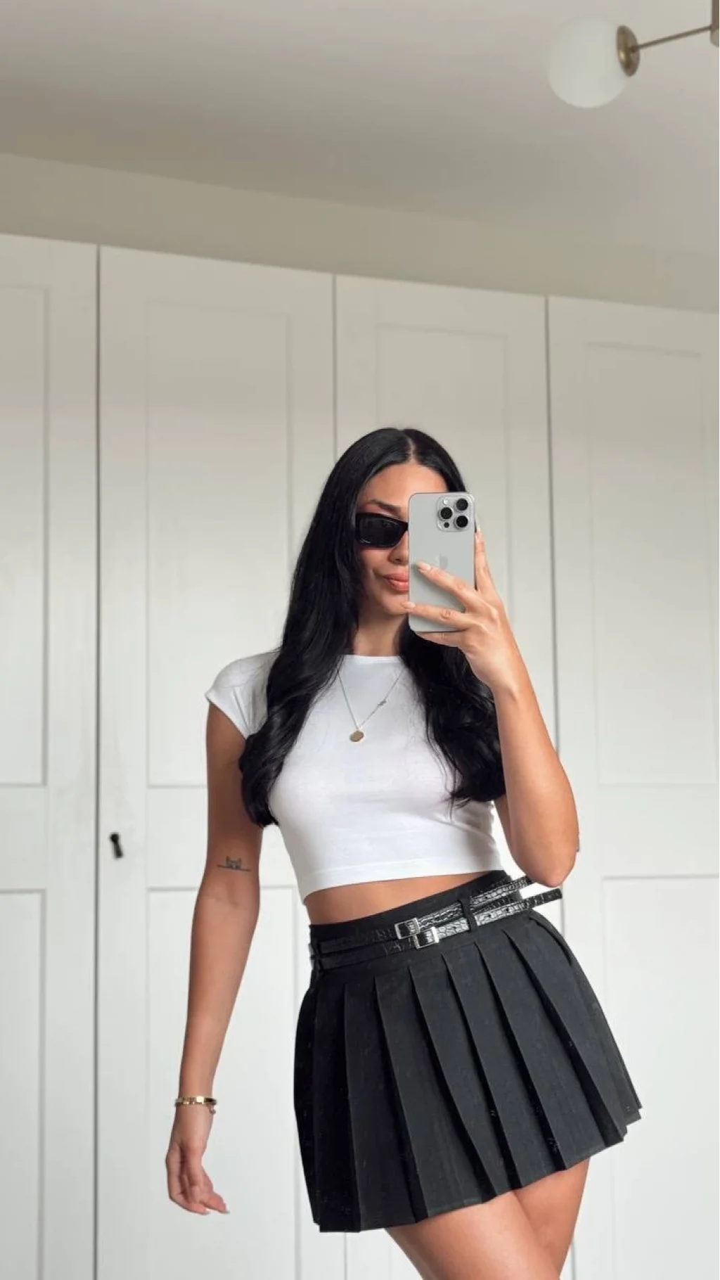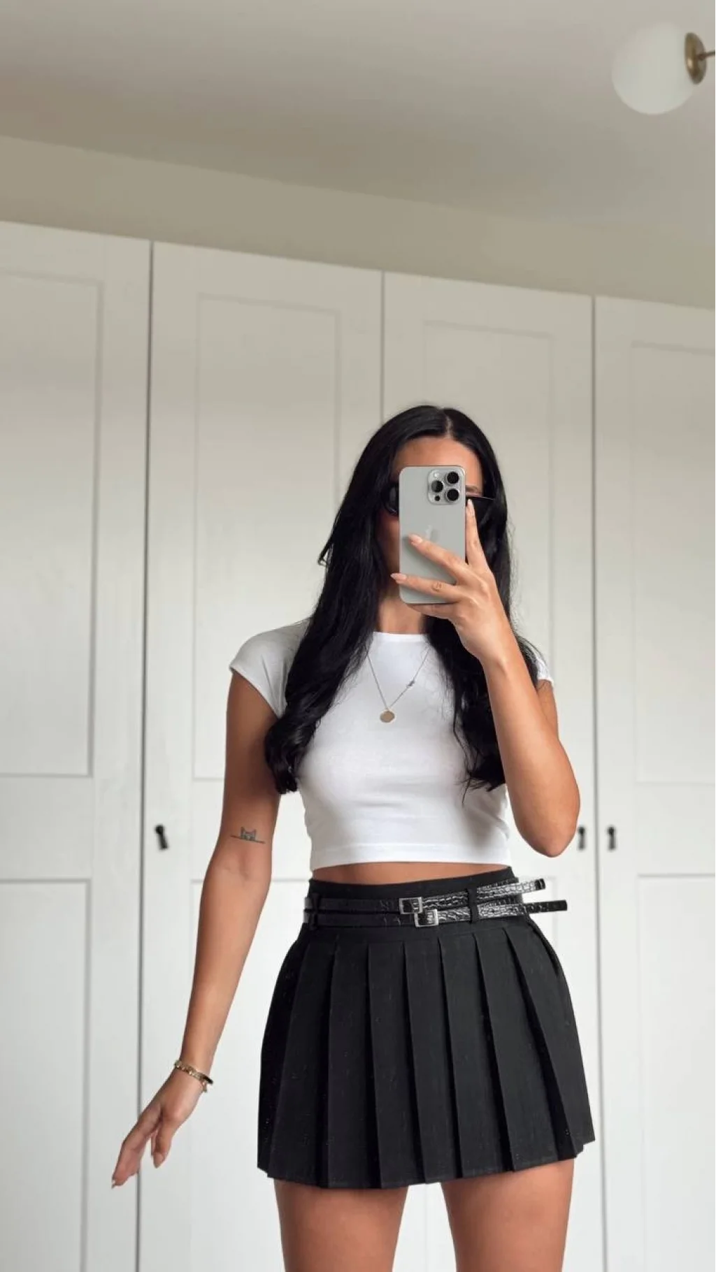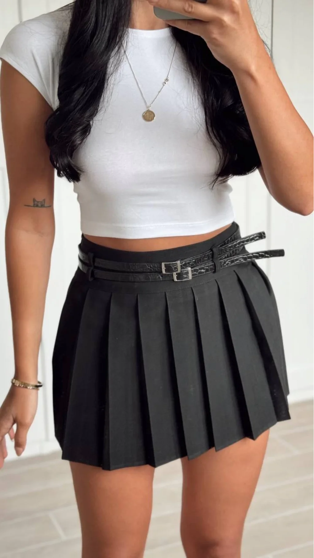 KEMER DETAYLI PİLELİ SİYAH MİNİ ETEK
