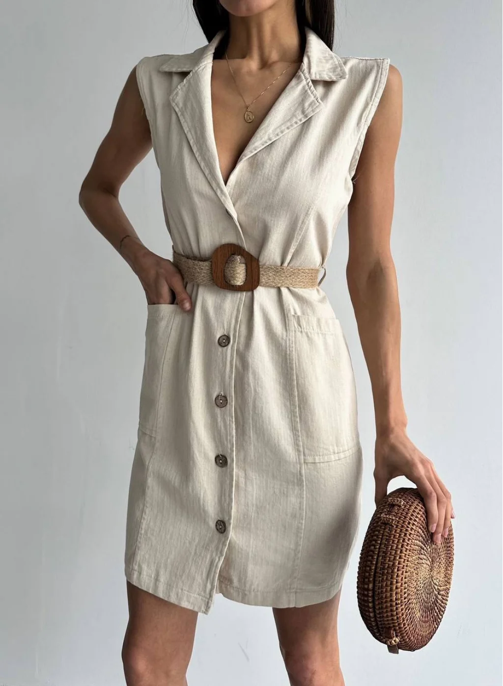 KEMERLİ KOLSUZ KETEN ELBİSE EKRU