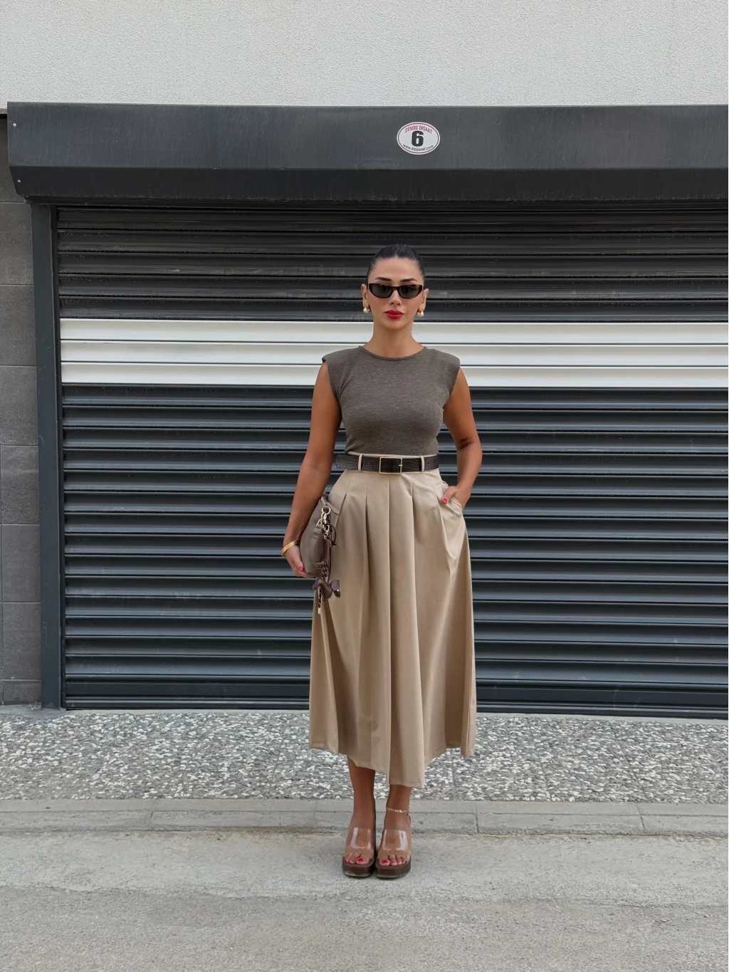 MYRA'nın şık tasarımı ve kontrast kumaşıyla dikkat çeken kahverengi kemerli pileli midi elbise.