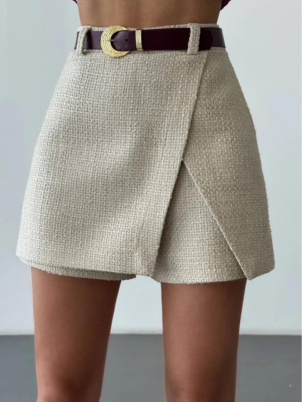 İçi şortlu, kemer detaylı, çapraz kapamalı, yandan fermuar kapamalı, mini boy tüvit şort etek.