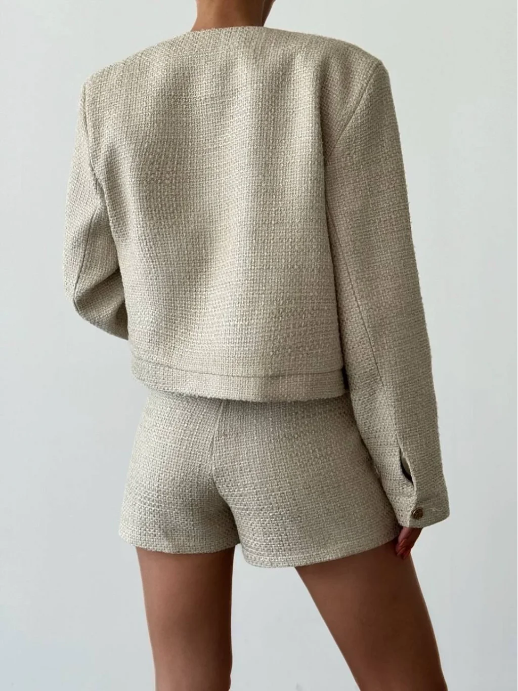 MYRA Kemerli Kruvaze Tüvit Şort Etek Bej, şıklık ve rahatlığı bir arada sunar.