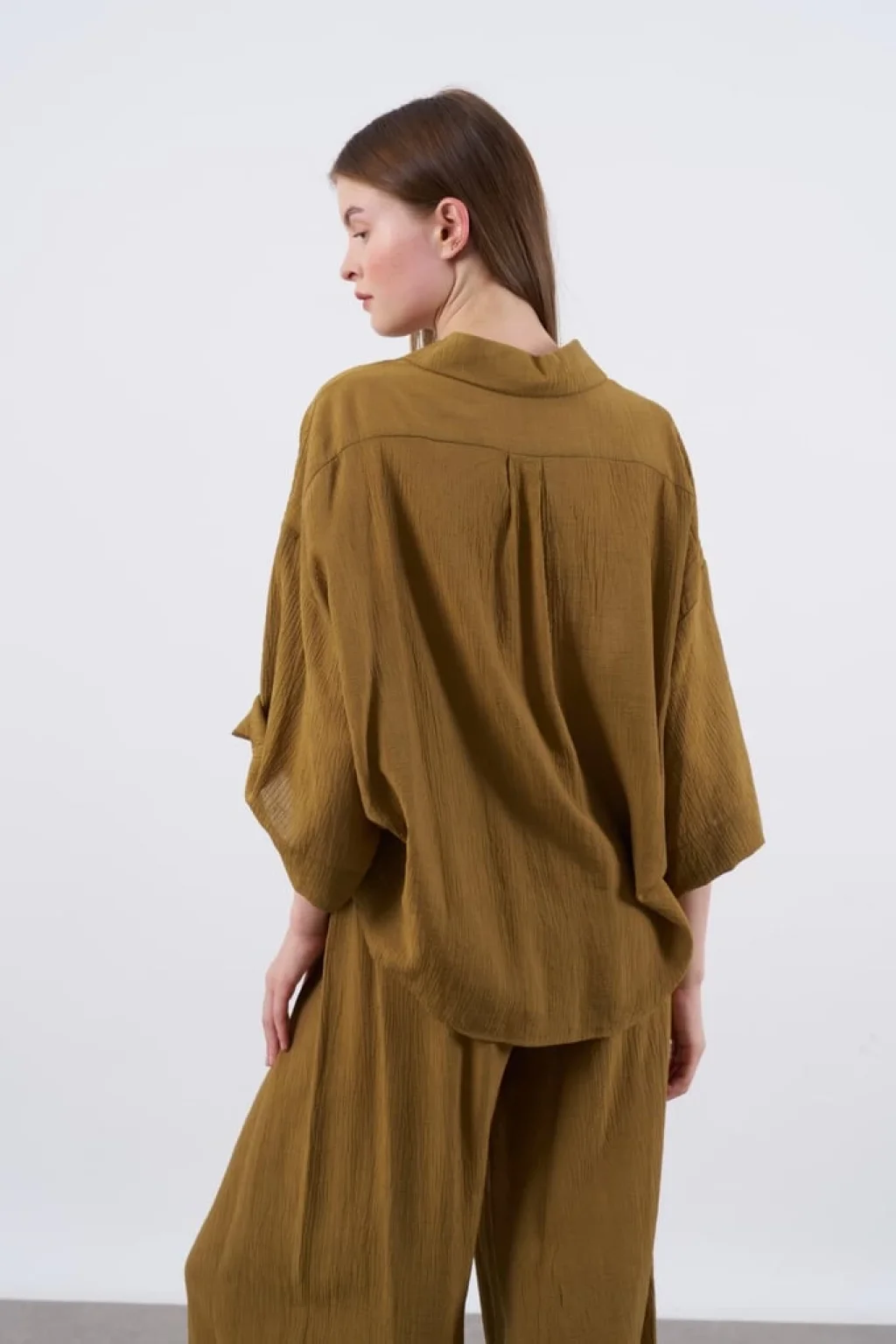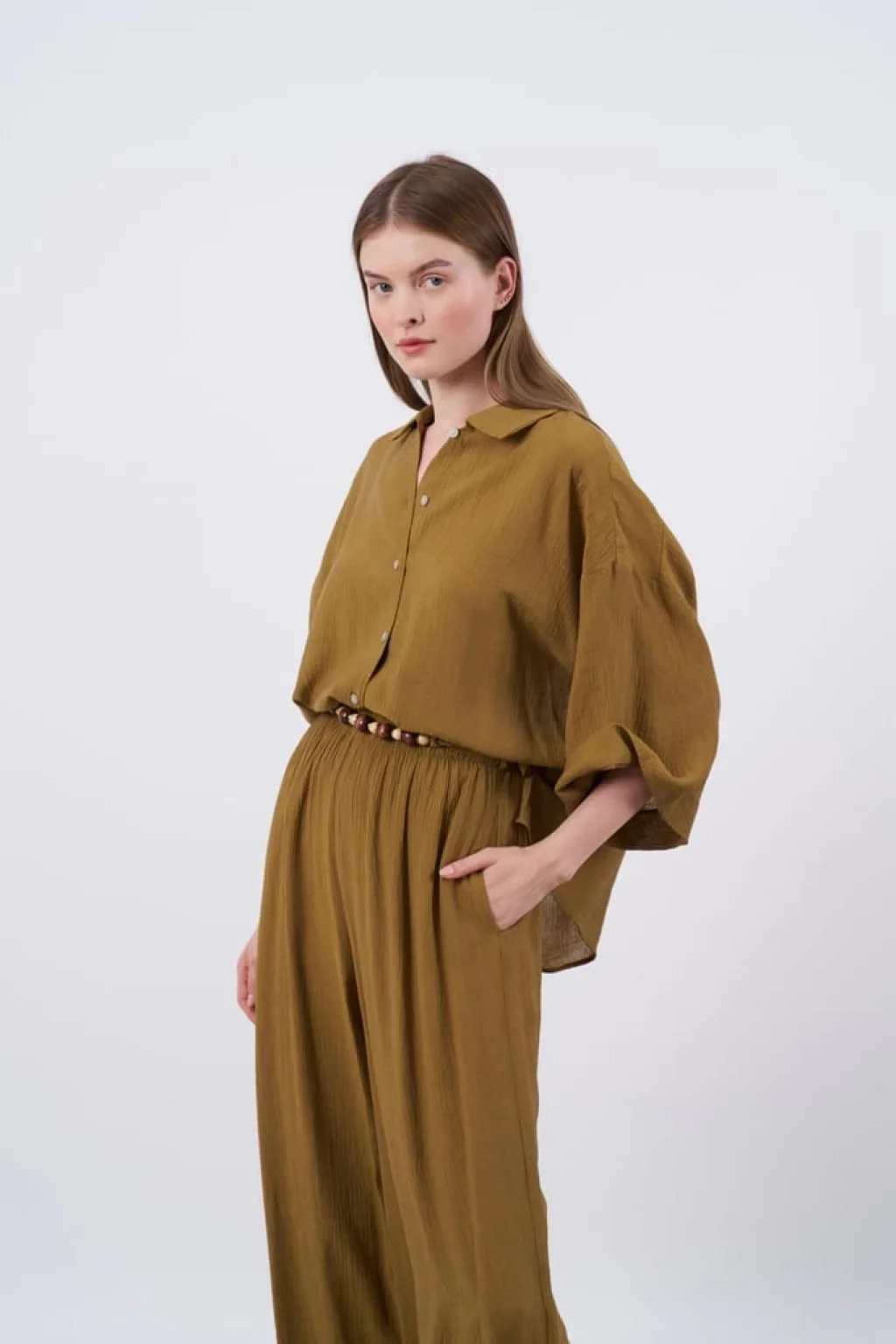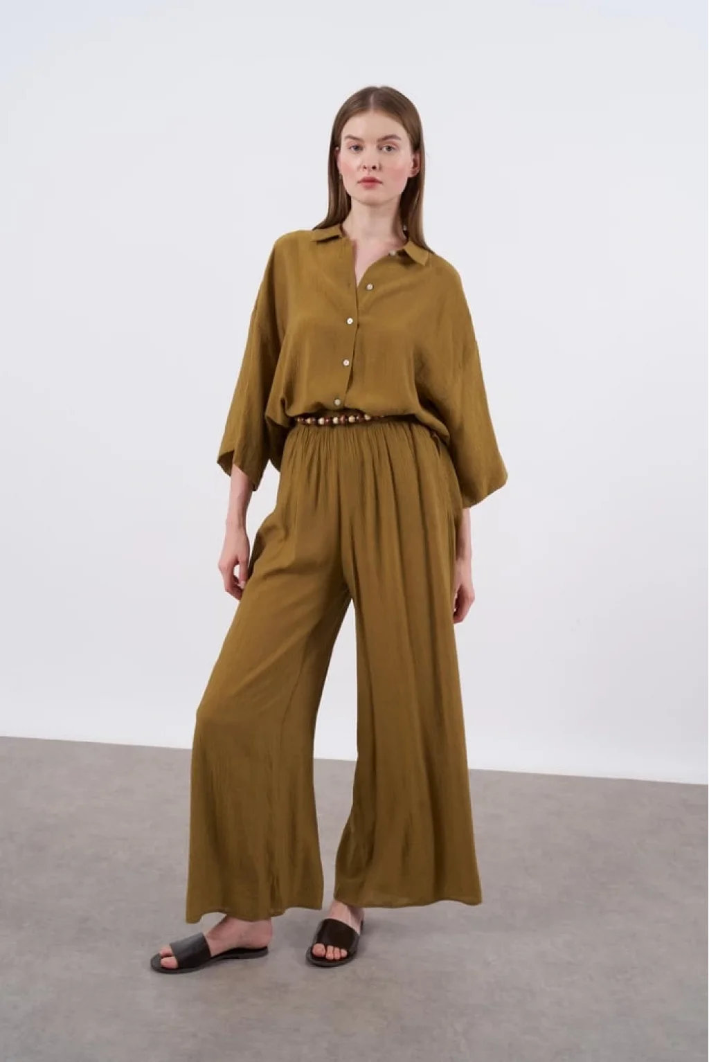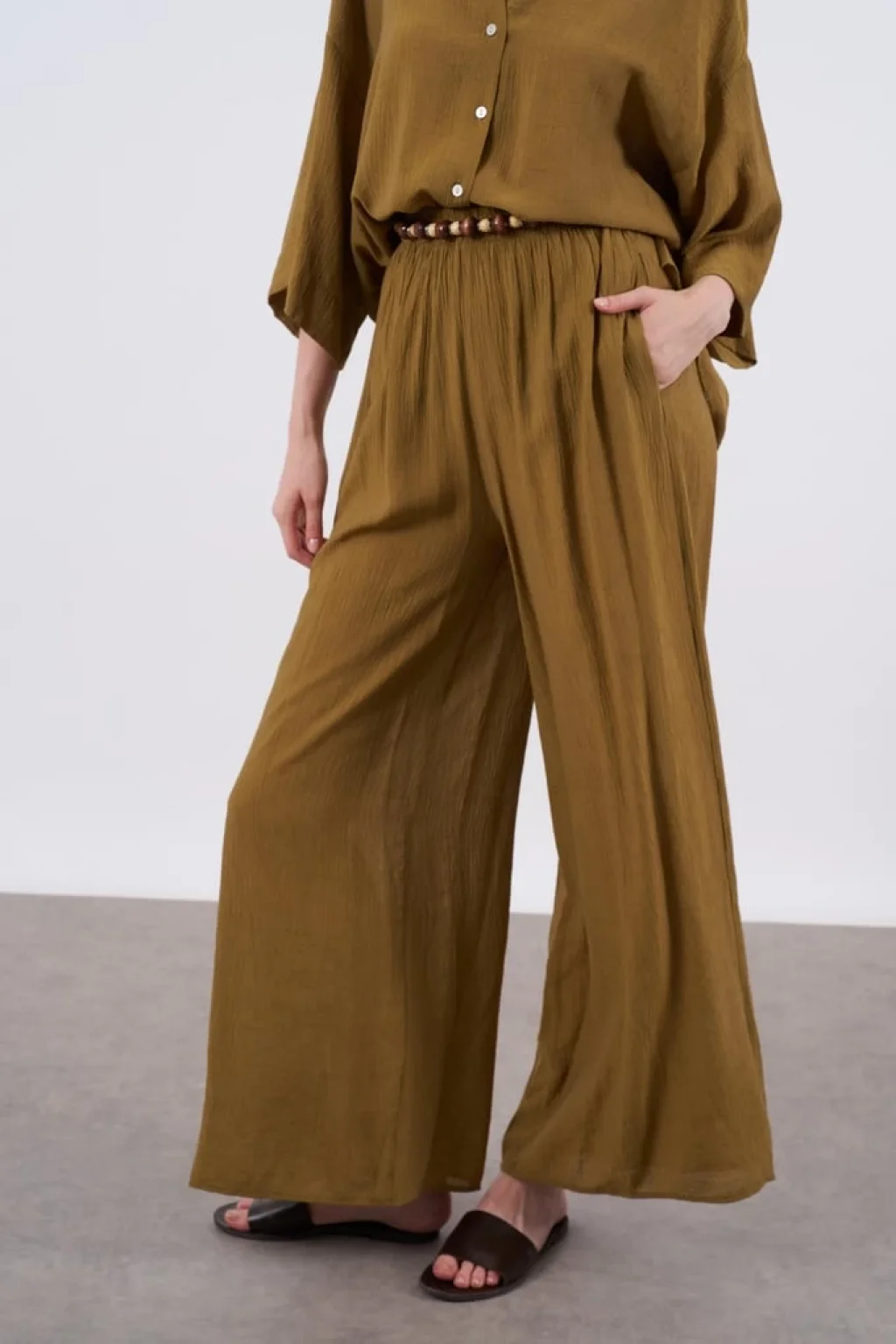 Yan iki Cepli Beli Lastikli İp Kemerli Yüksek Bel Palazzo Pantolon