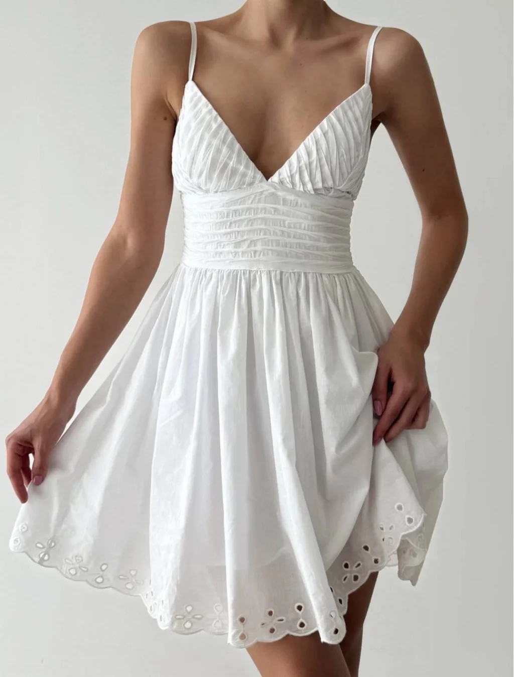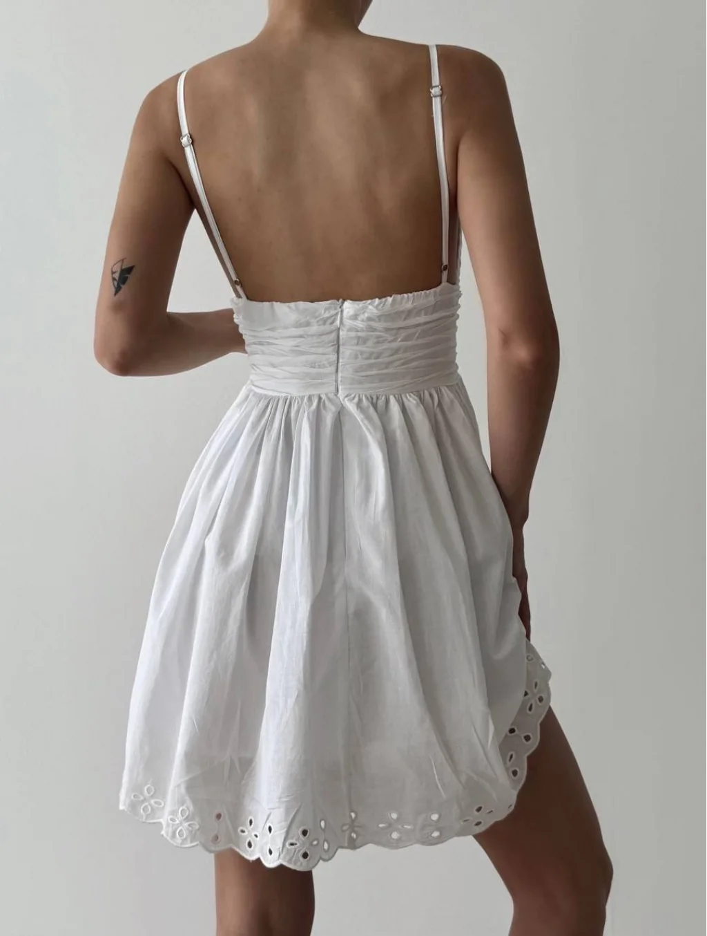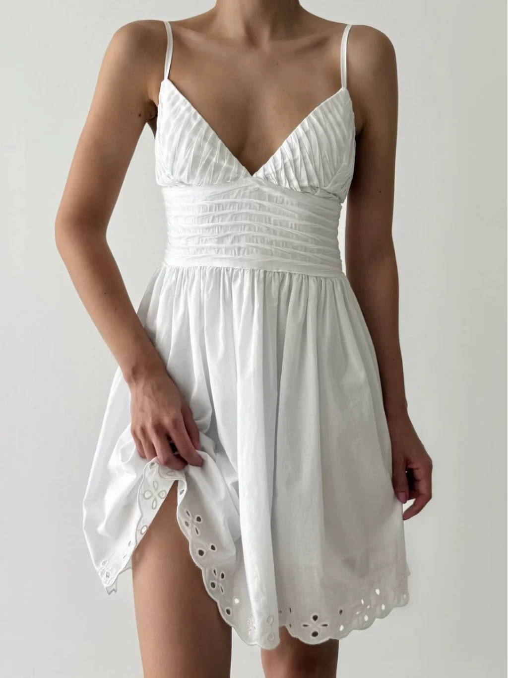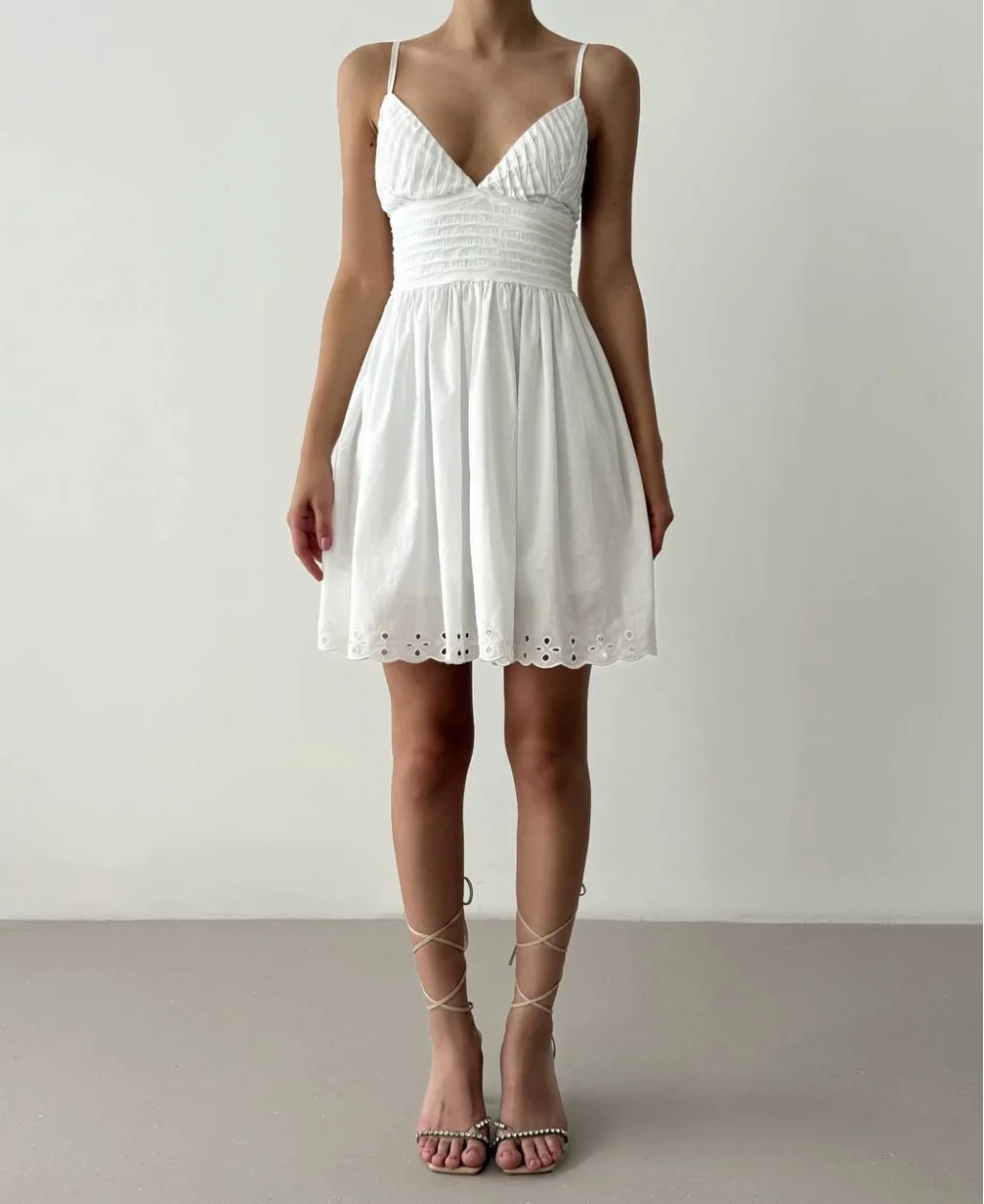 Kırışık Dokulu Brode Detaylı Askılı Mini Elbise Beyaz