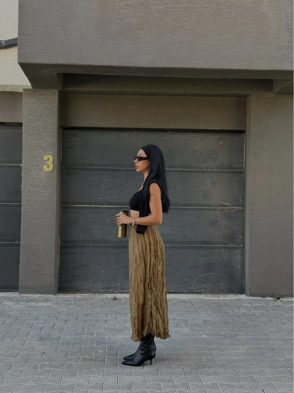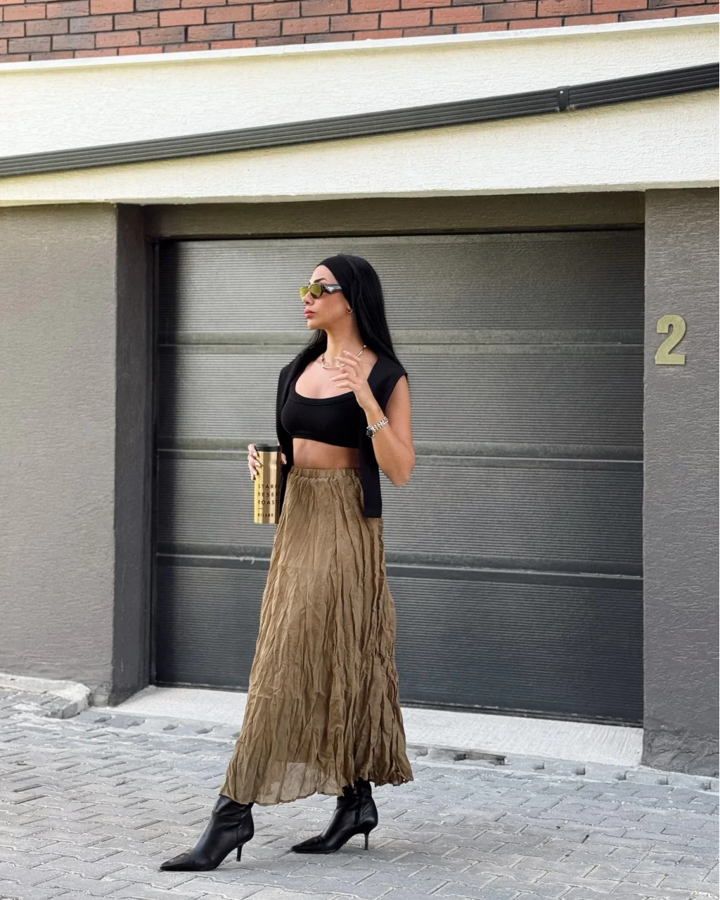 Kırışık Modal Kumaş Uzun Astarlı Etek Olive Yeşil