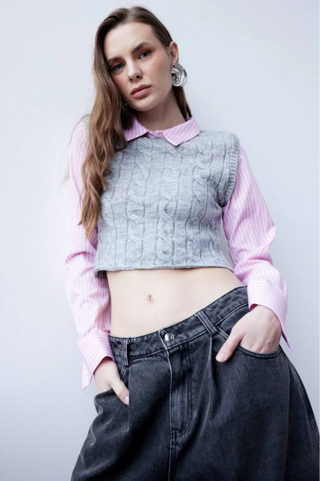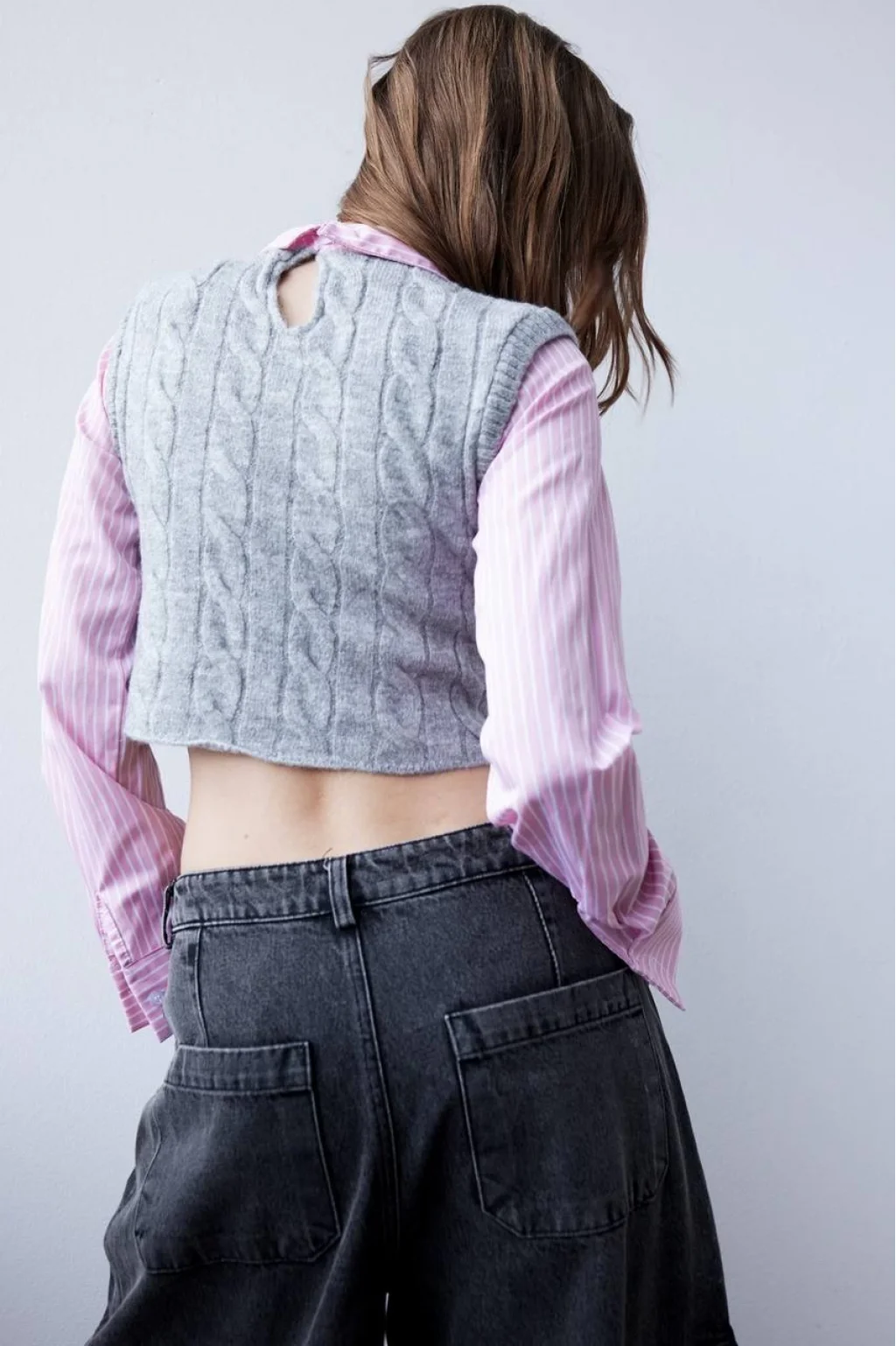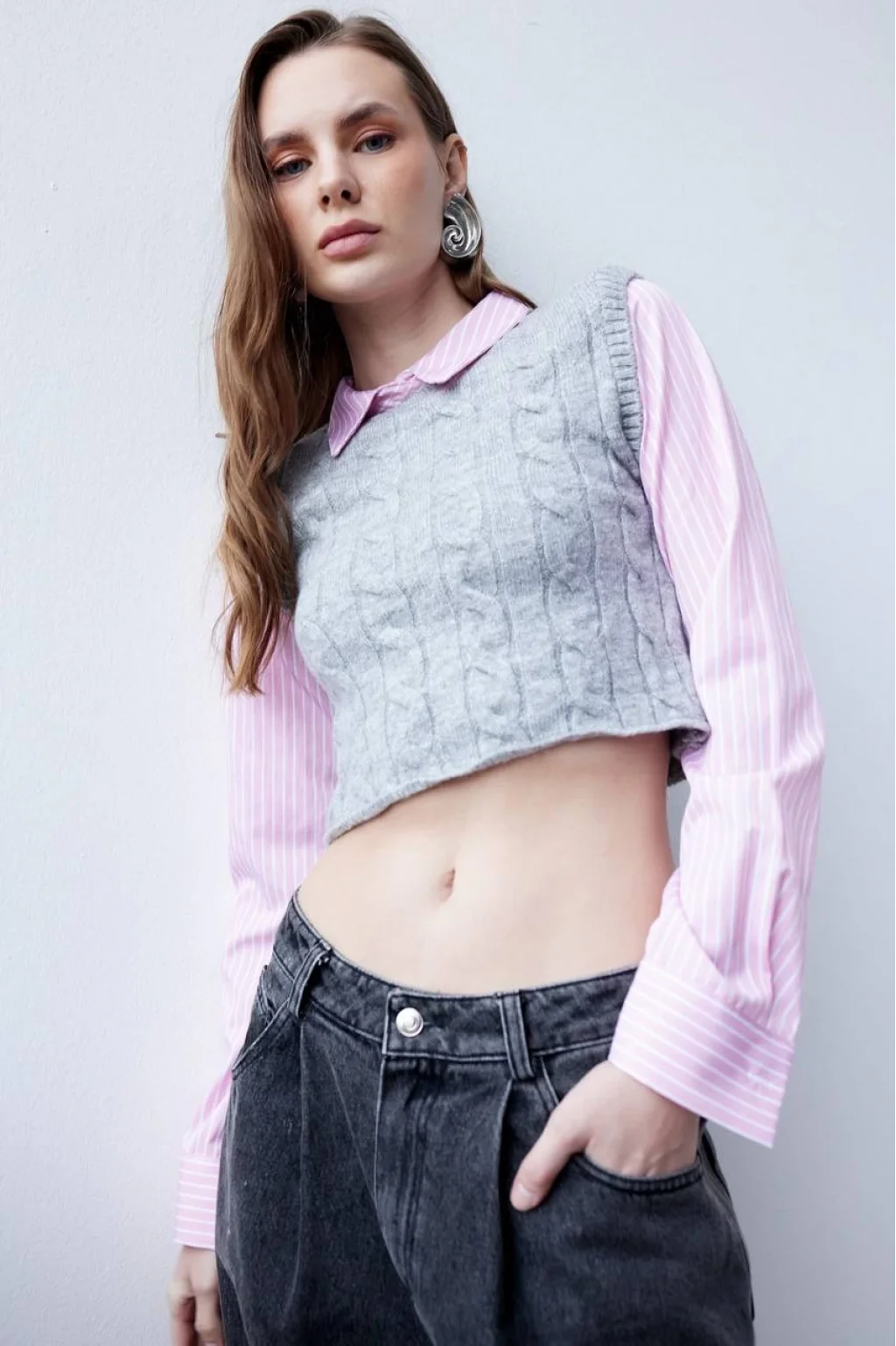 PEMBE ÜZERİNE BEYAZ ÇİZGİLİ KOLLAR VE YAKA GÖMLEK, ÖN VE ARKA TRİKO YELEK