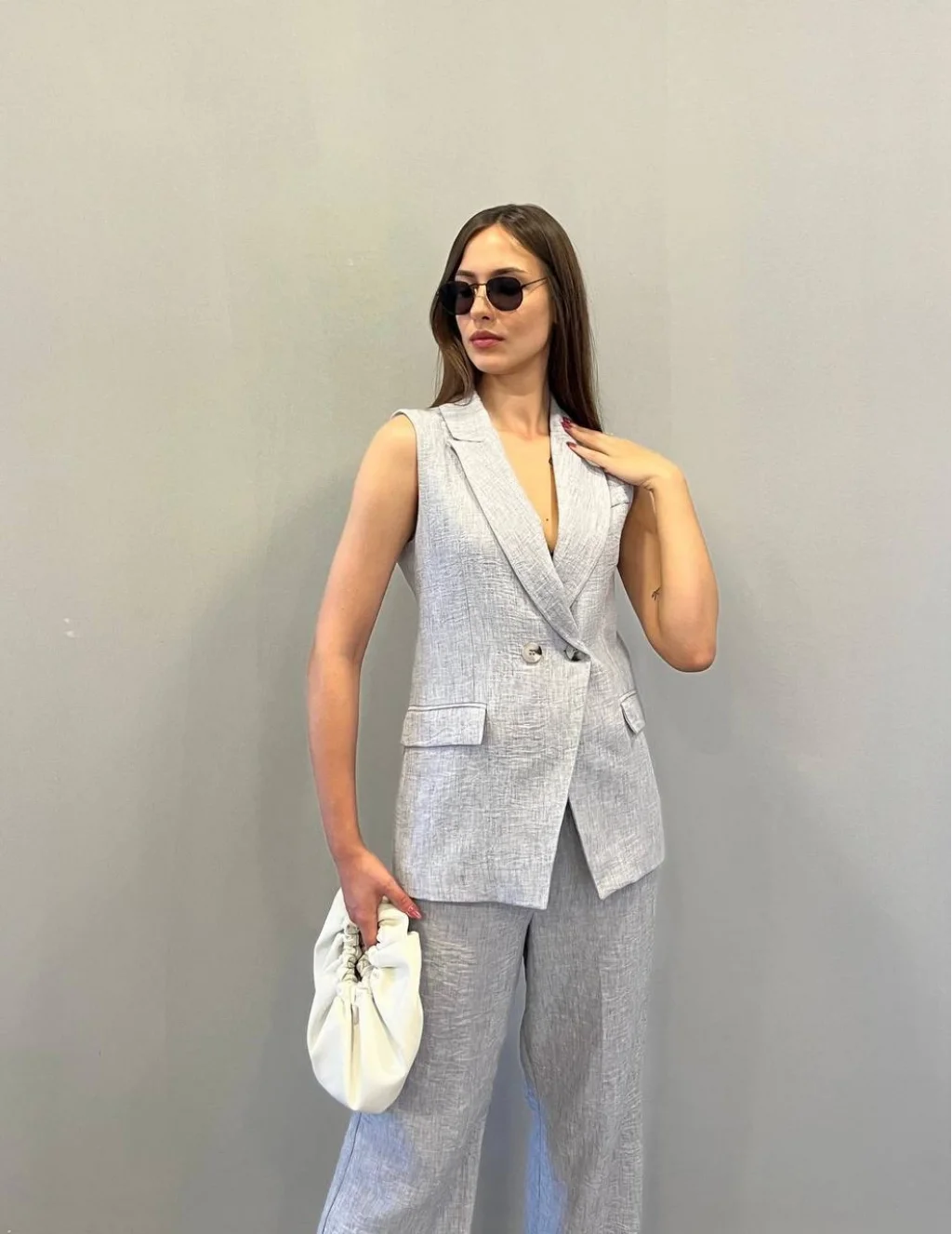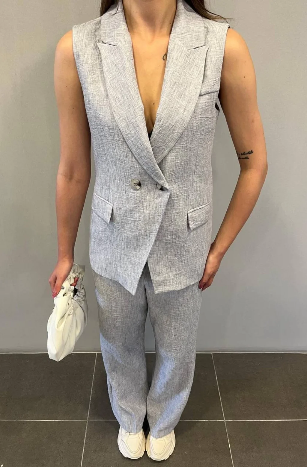 KRUVAZE YAKA KETEN YELEK PANTOLON TAKIM GRİ