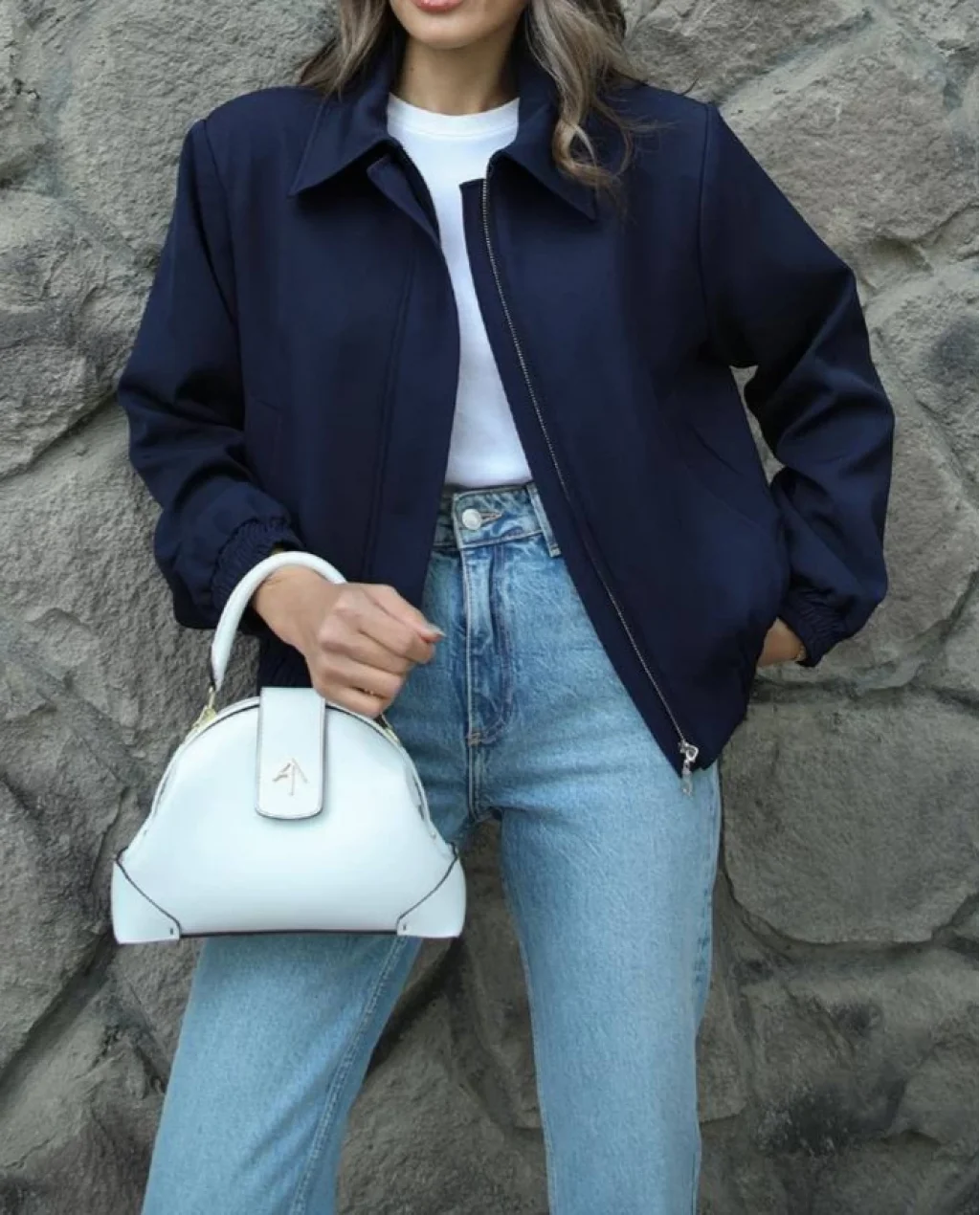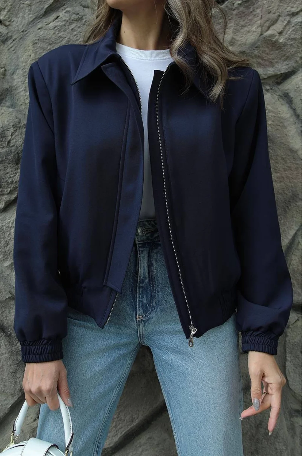 UZUN KOLLU, KATLI YAKALI, KOLU VE BELİ LASTİKLİ, ÖNÜ FERMUARLI, VATKALI BOMBER CEKET