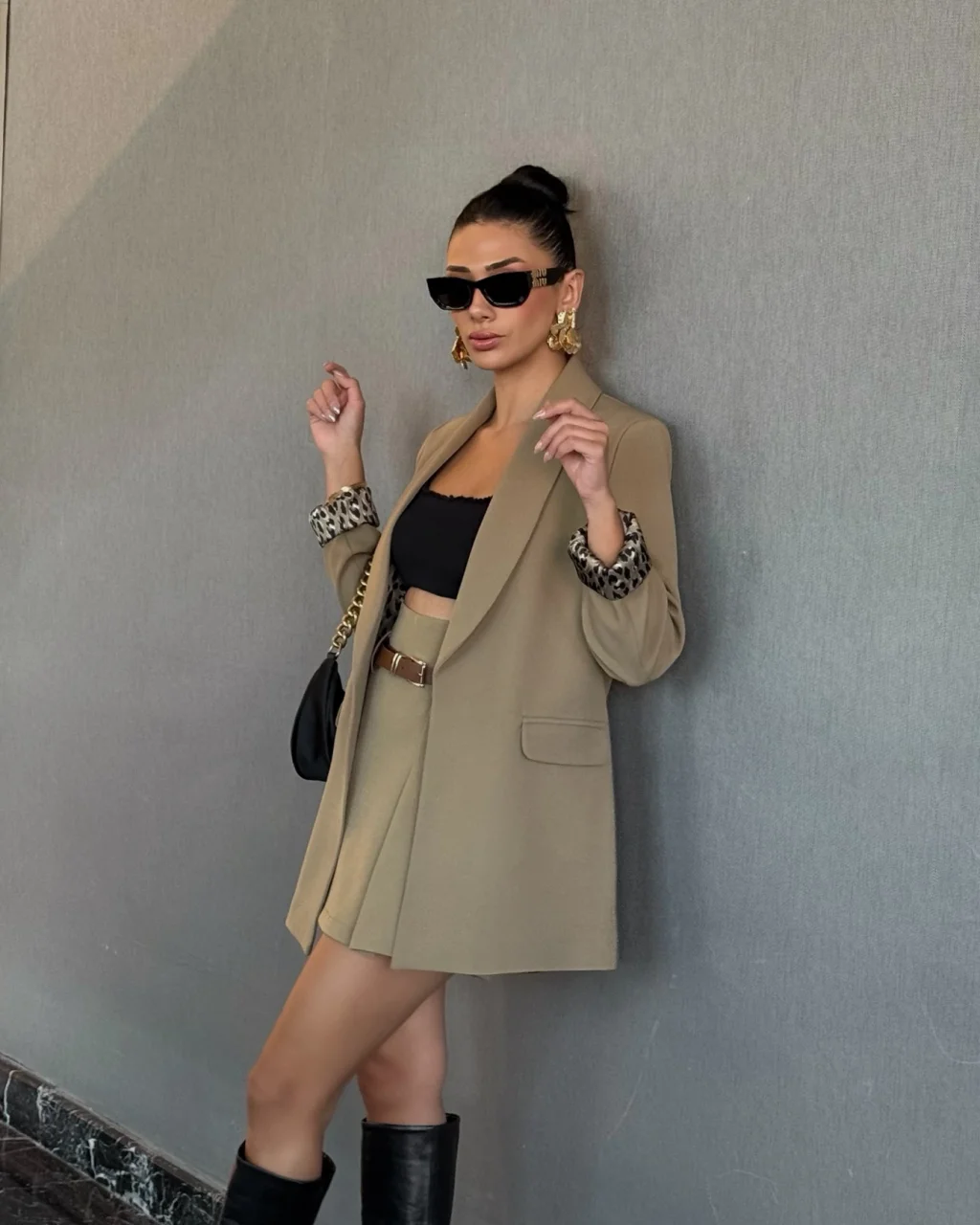 Leopar Astarlı Şal Yaka Blazer Ceket Haki