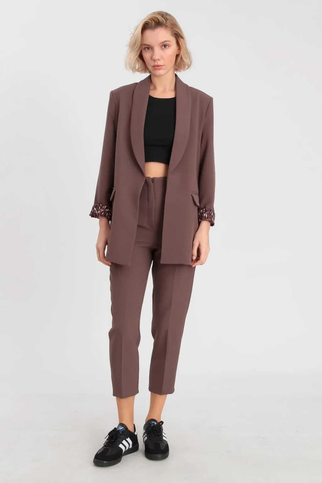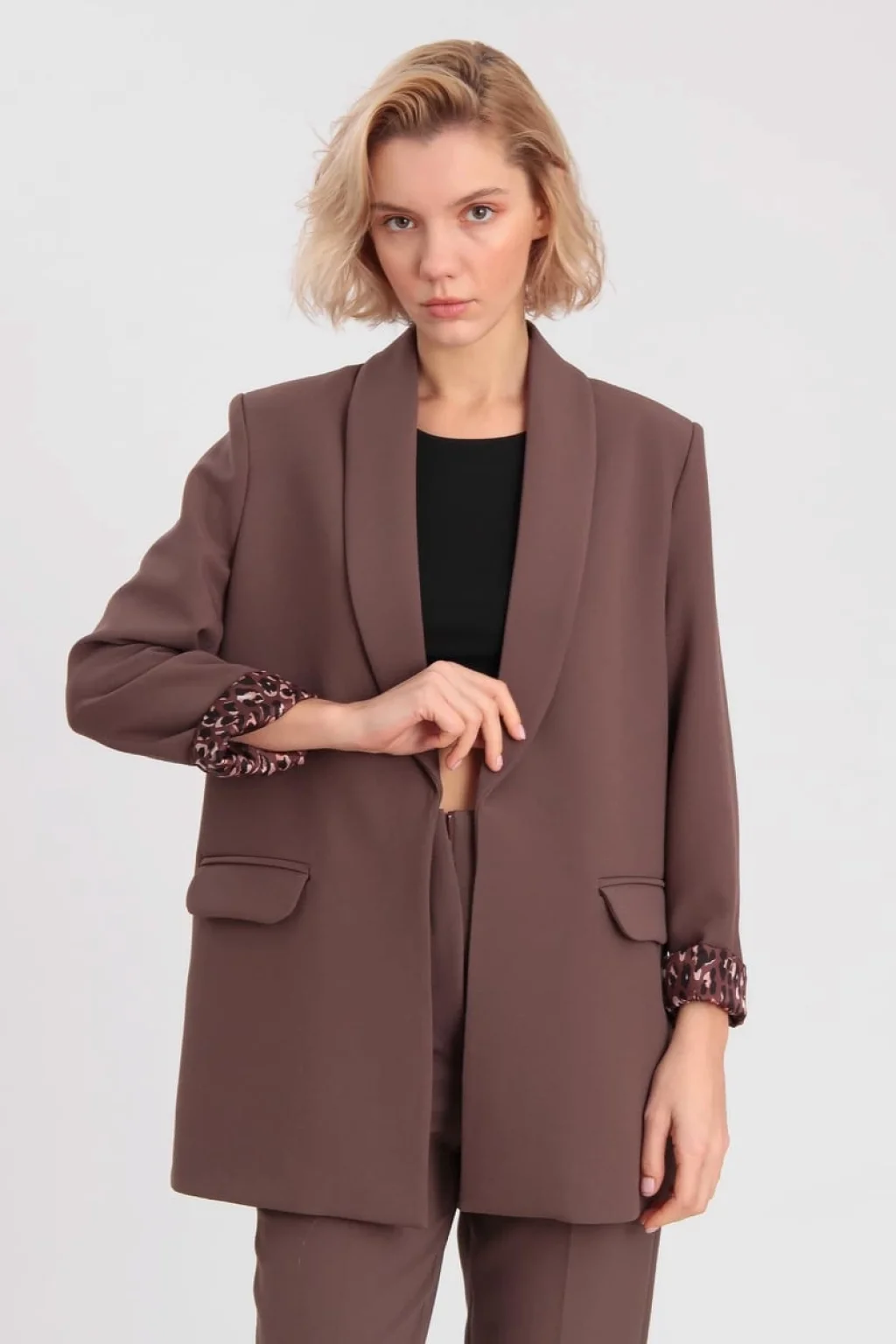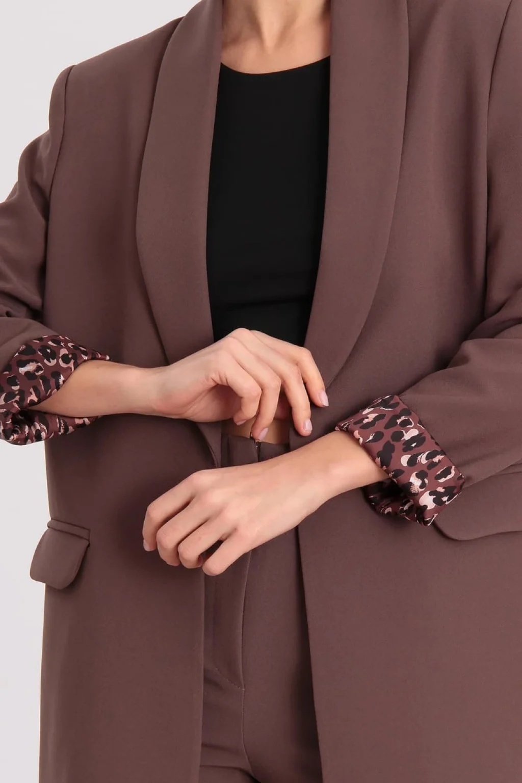 Kol Katlamalı Düğmesiz Premium Kahverengi Blazer Ceket