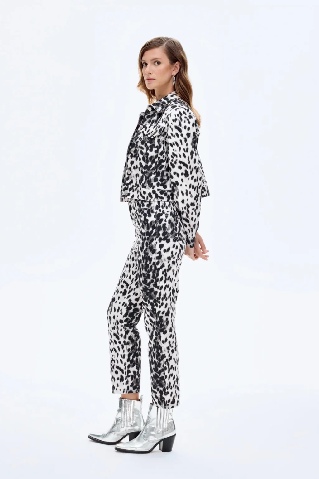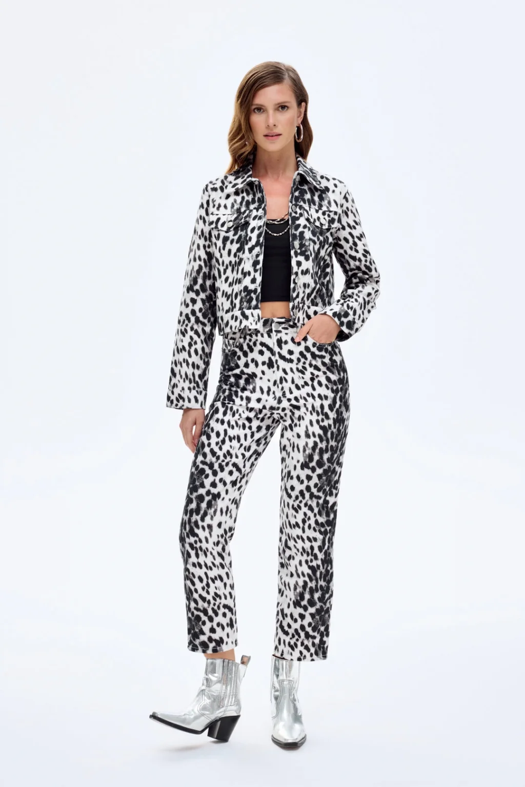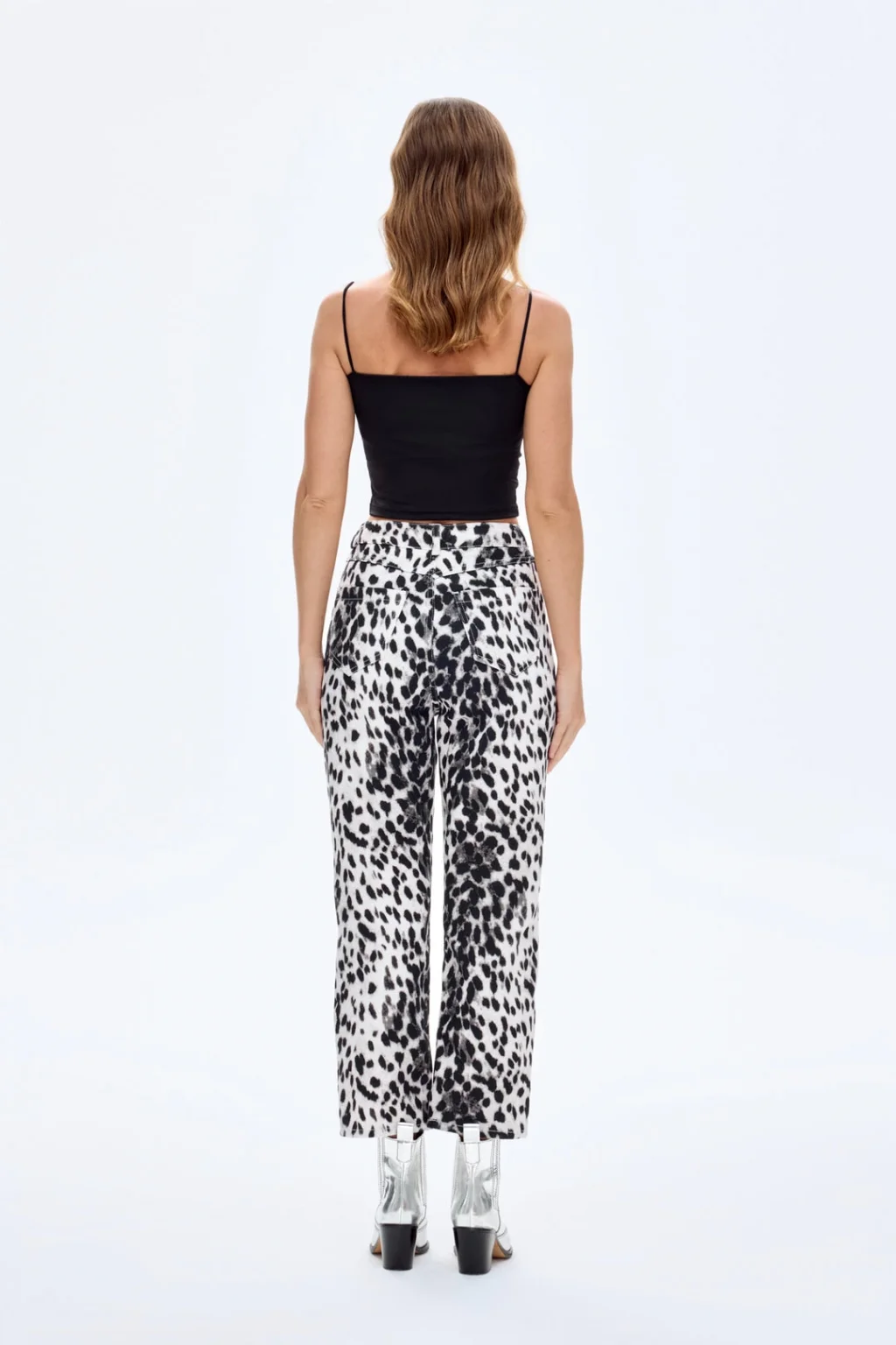 Leopar desenli, cepli, yüksek bel, fermuarlı ve düğmeli kapamalı, düz paça, uzun boy pantolon.