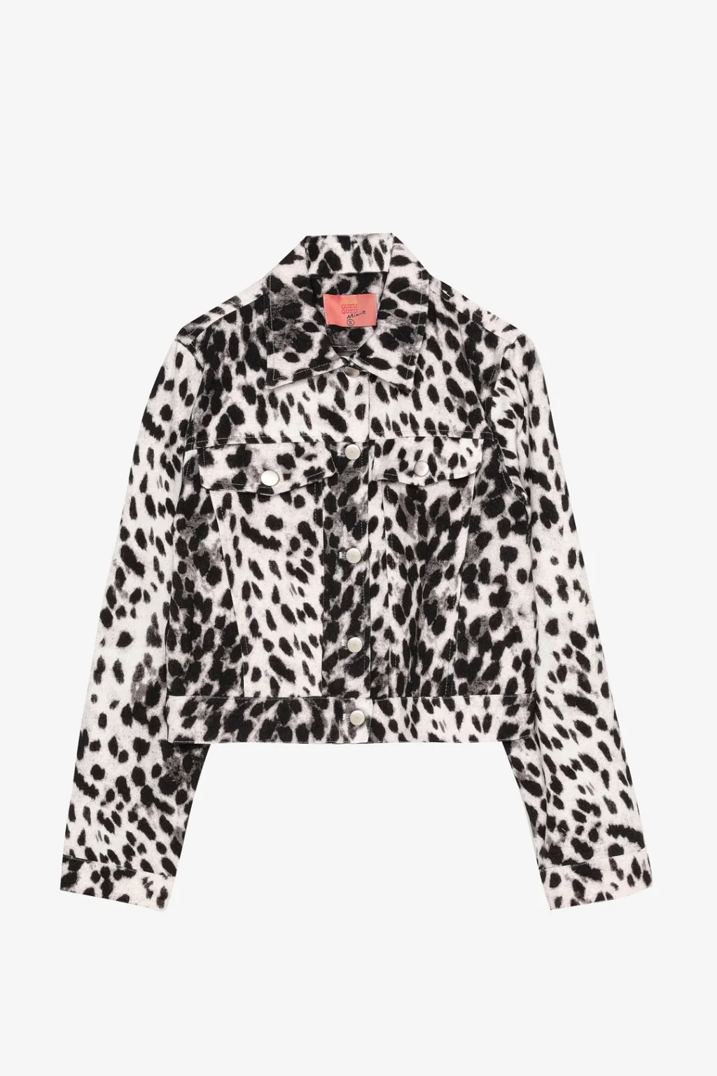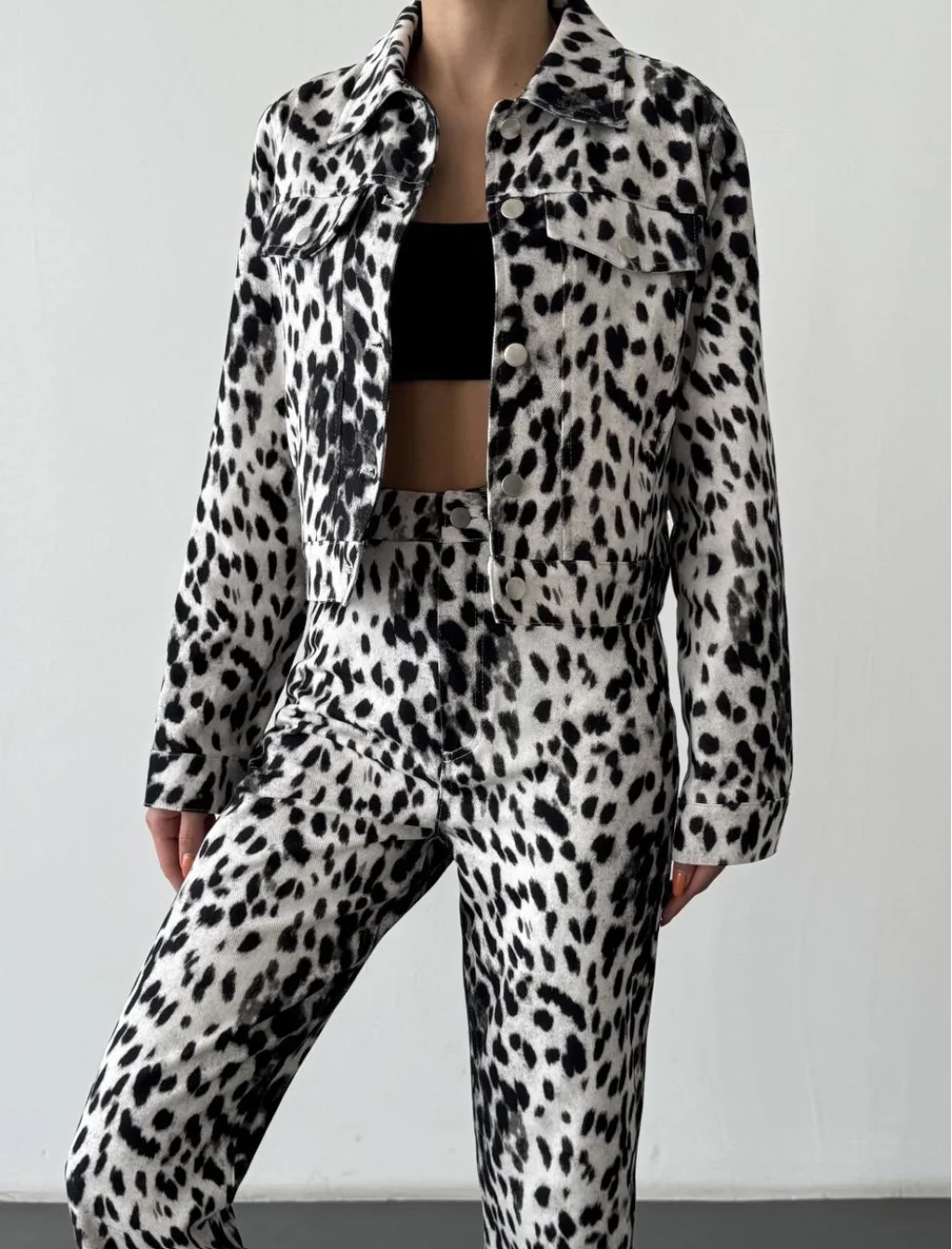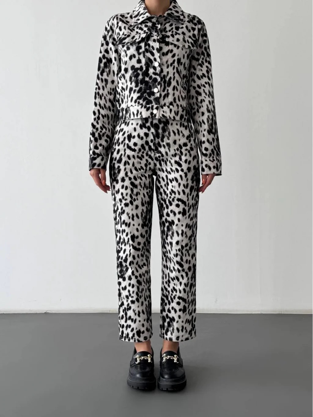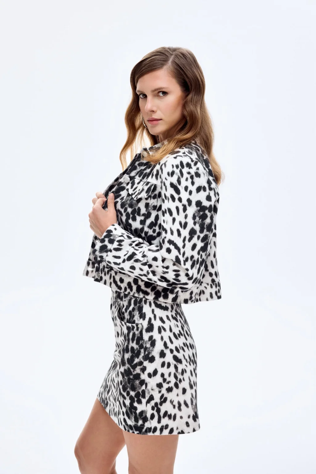 Leopar desenli kumaştan tasarlanmış, önü cep kapak detaylı, içi astarsız, yandan cepli, uzun kollu, düğme kapamalı, gömlek yaka, kısa ceket.