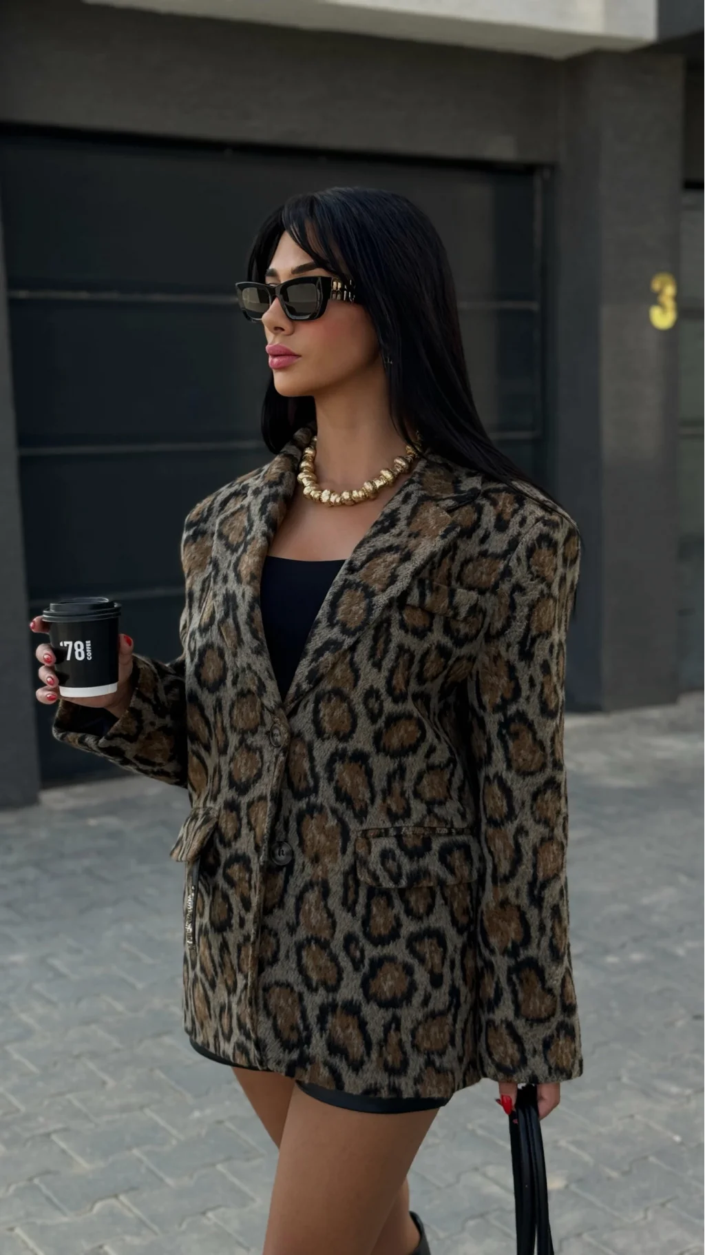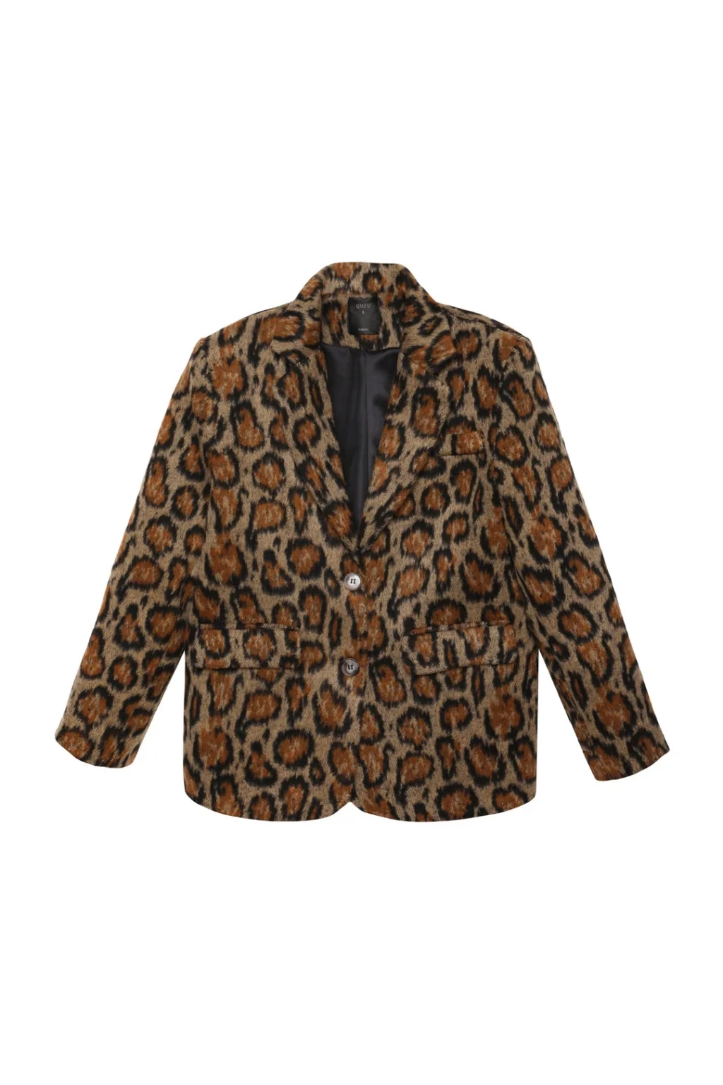 Kruvaze yaka, uzun kollu, çİft cep kapaklı, oversİze, leopar desenli kalın kaşe blazer ceket kaban.