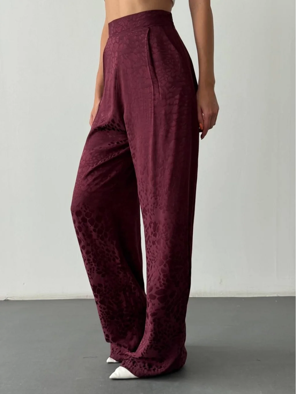 Leopar Desenli Saten Pantolon-Bordo