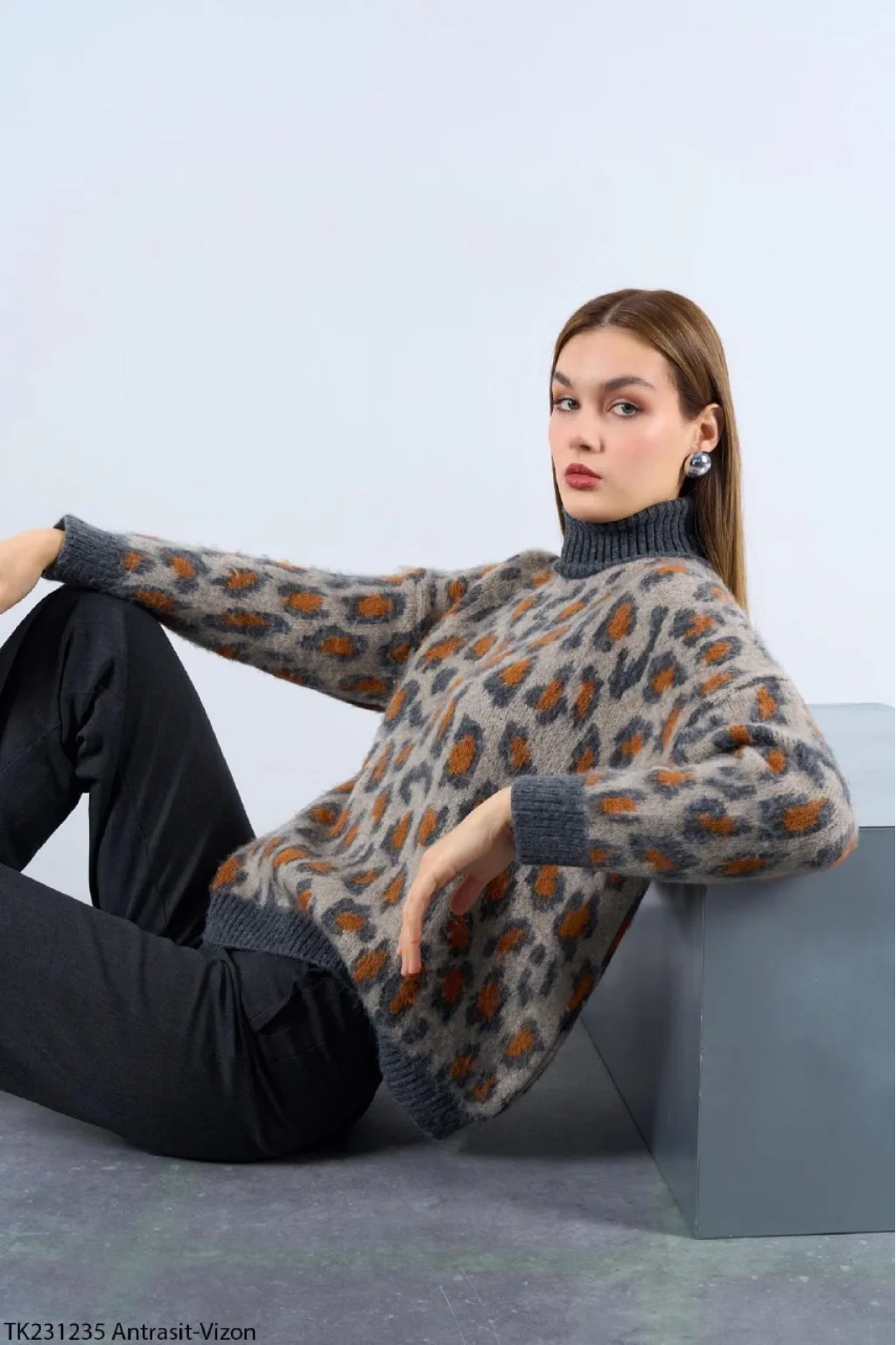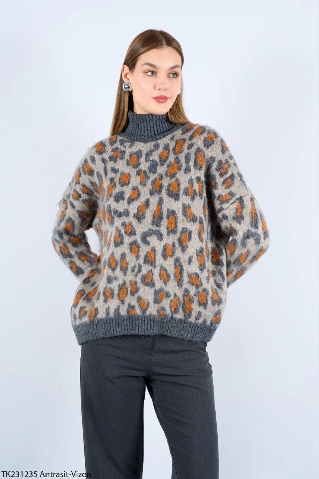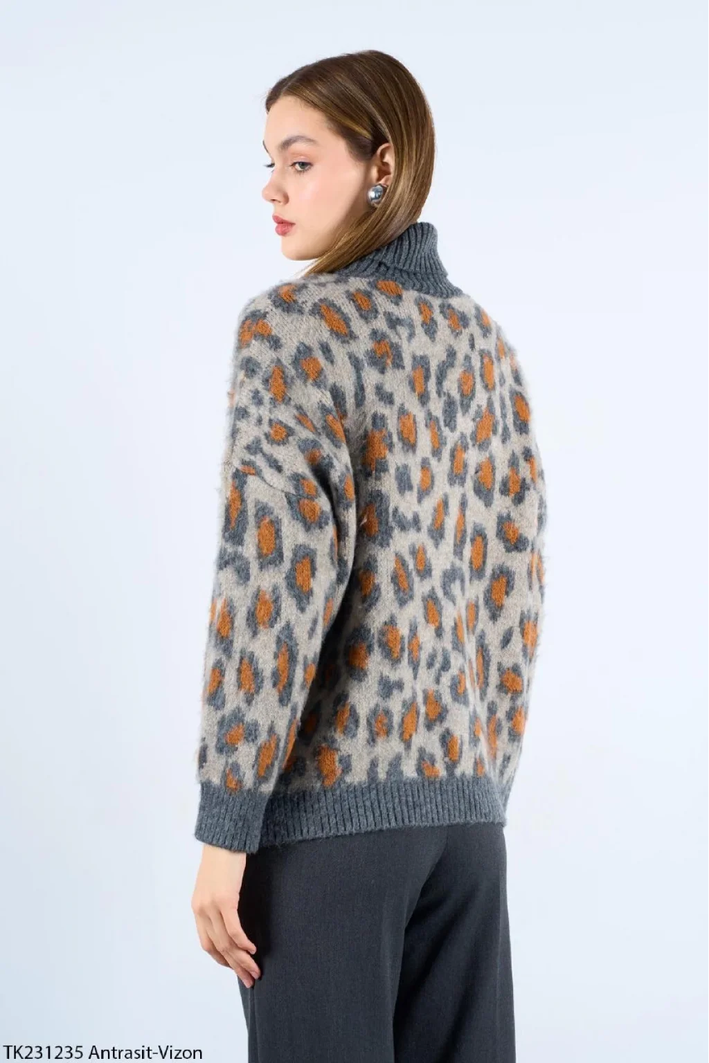 LEOPAR DESENLİ ŞARDONLU BOĞAZLI KAZAK HARDAL GRİ