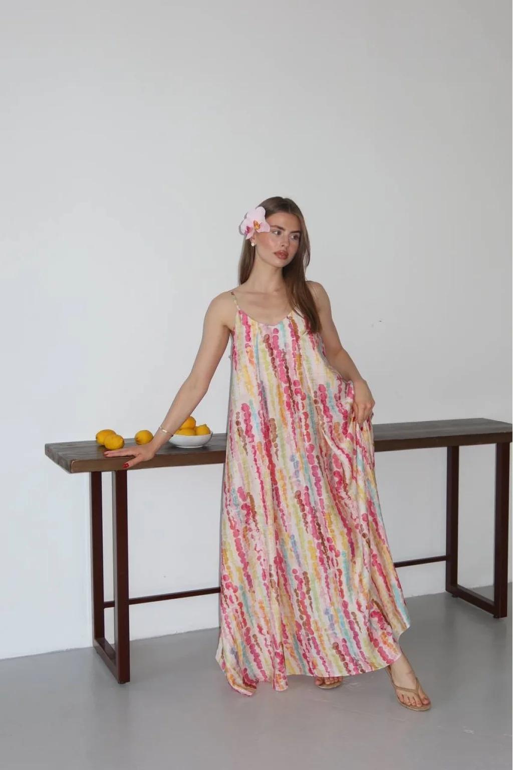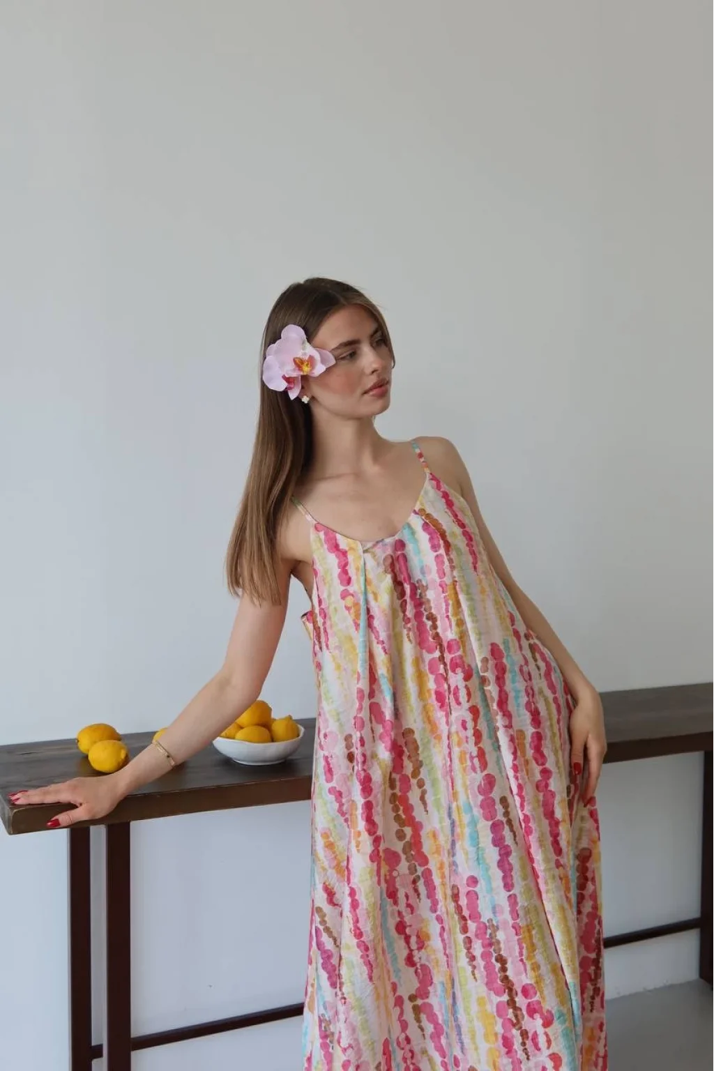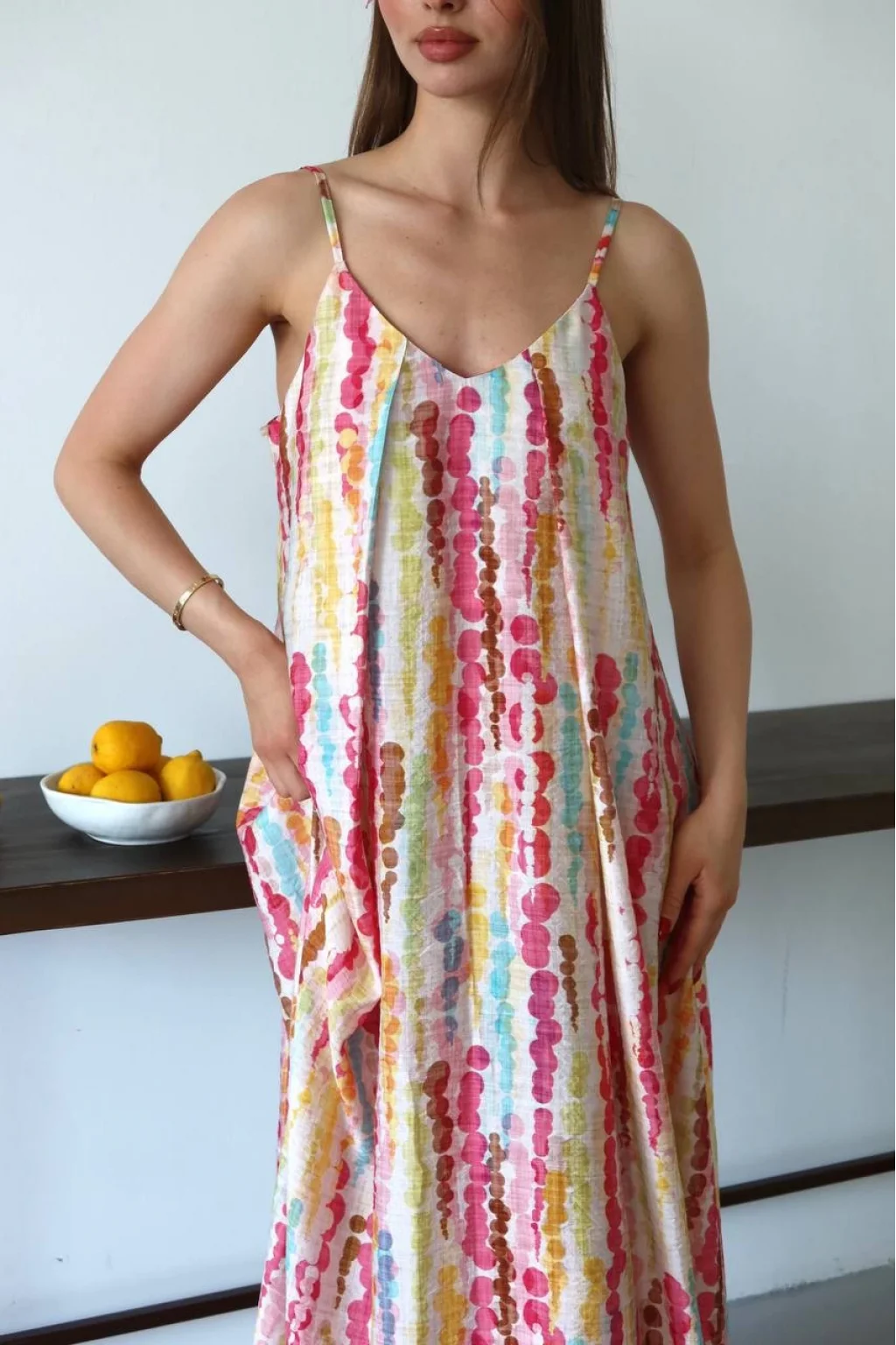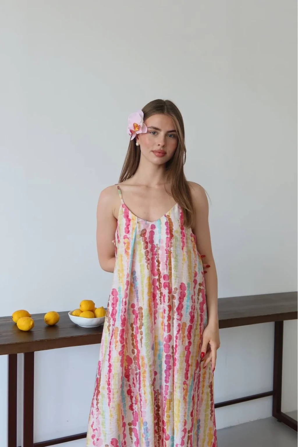 Yazın tazeliğini ve enerjisini üzerinizde taşıyın! "Limonata" elbise, hafif dokusu ve rengârenk çizgili deseniyle hem göz alıcı hem de ferah bir stil sunar. İnce askıları ve dökümlü yapısıyla sahil yürüyüşlerinden şehir gezilerine kadar her anınıza eşlik eder. Çiçekli saç aksesuarları ve sandaletlerle tamamlayarak tropik bir dokunuş katabilirsiniz.