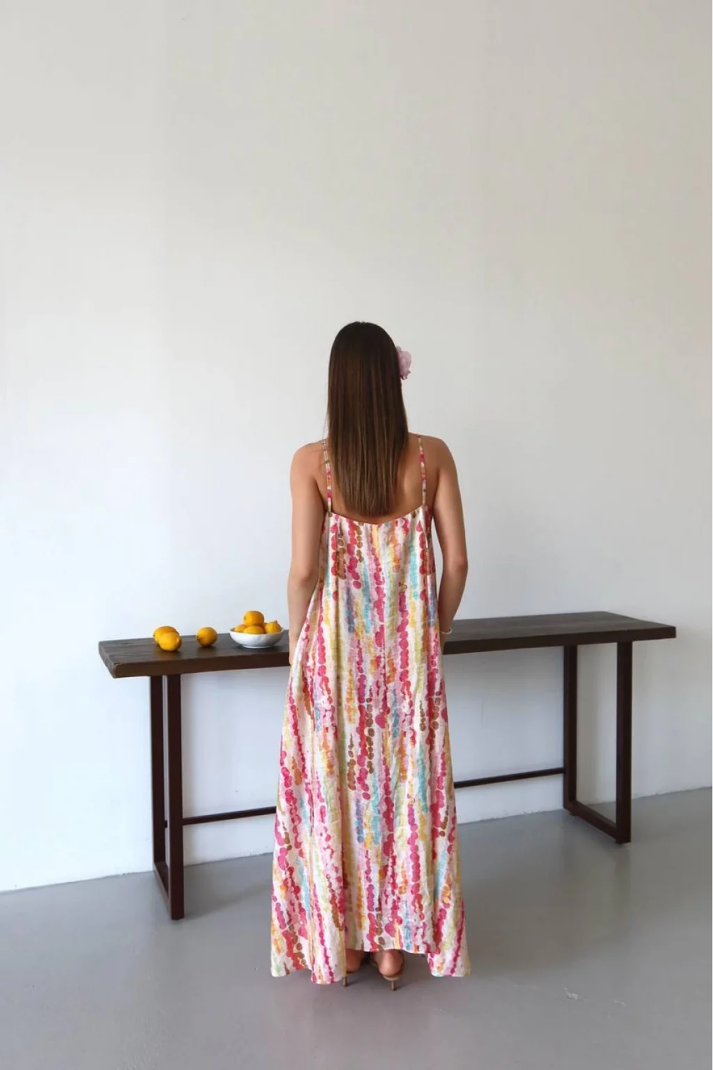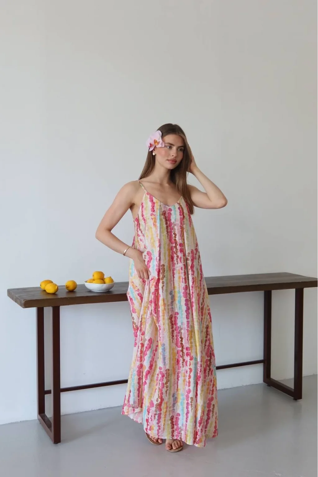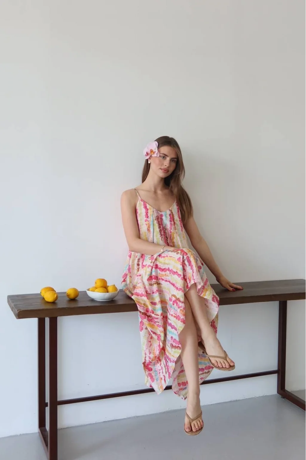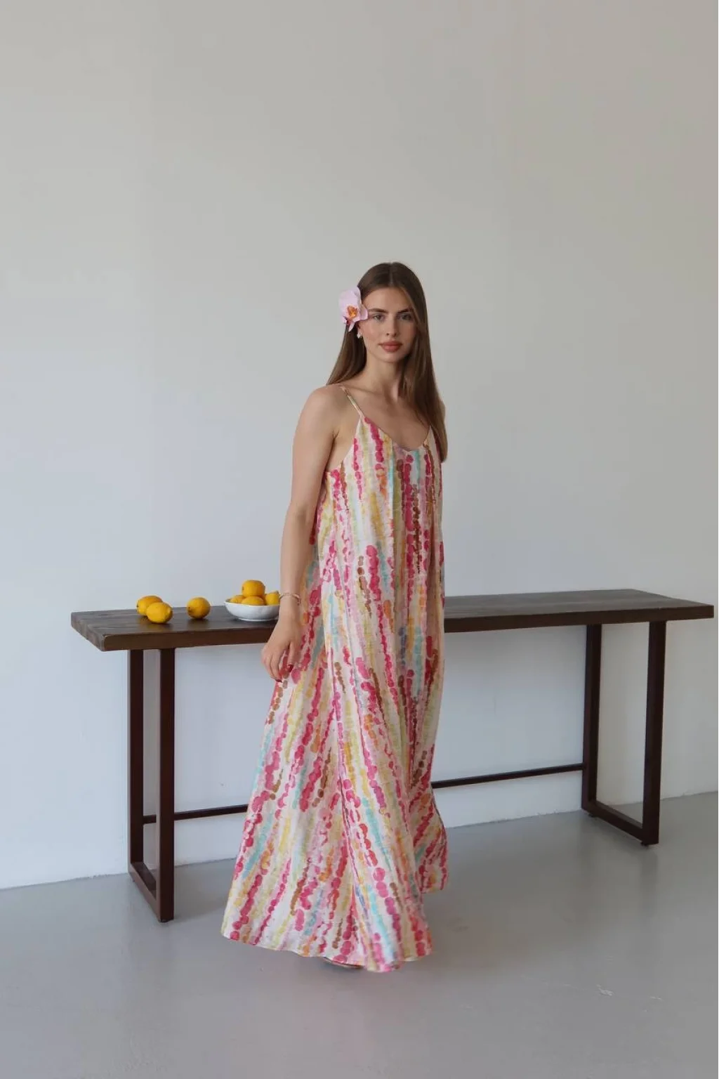 Yazın tazeliğini ve enerjisini üzerinizde taşıyın! "Limonata" elbise, hafif dokusu ve rengârenk çizgili deseniyle hem göz alıcı hem de ferah bir stil sunar. İnce askıları ve dökümlü yapısıyla sahil yürüyüşlerinden şehir gezilerine kadar her anınıza eşlik eder. Çiçekli saç aksesuarları ve sandaletlerle tamamlayarak tropik bir dokunuş katabilirsiniz.