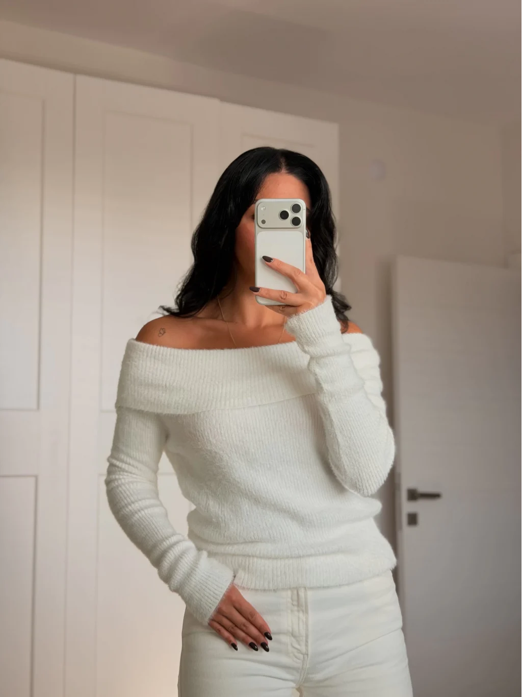 MYRA'nın şık tasarımıyla göz kamaştıran Madonna Yaka Dokulu Beyaz Kazak, kış gardırobunuzun vazgeçilmezi olacak.