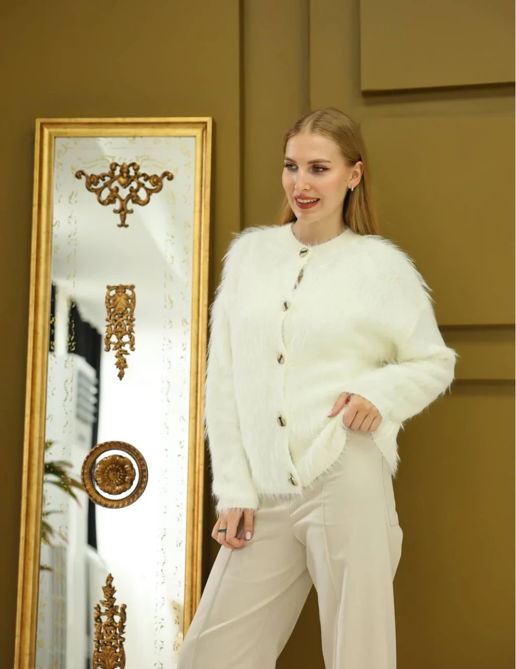 • MYRA'nın Mars Sakallı Düğme Detay Hırka-Ekru'su, şıklığı ve rahatlığı bir arada sunar.