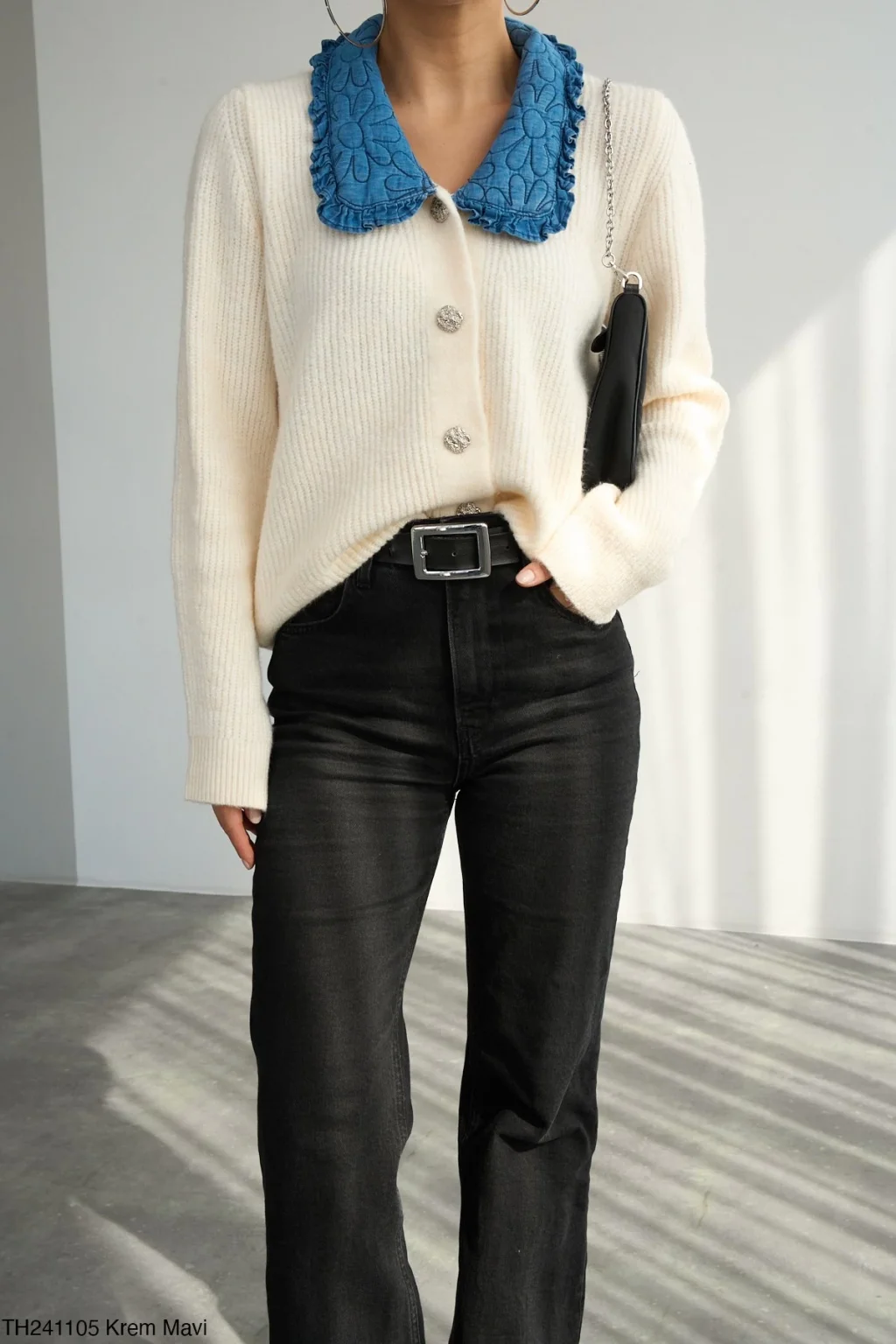 MYRA Mavi Bebe Yaka Hırka-Krem ile şıklığı ve rahatlığı bir arada yaşayın.