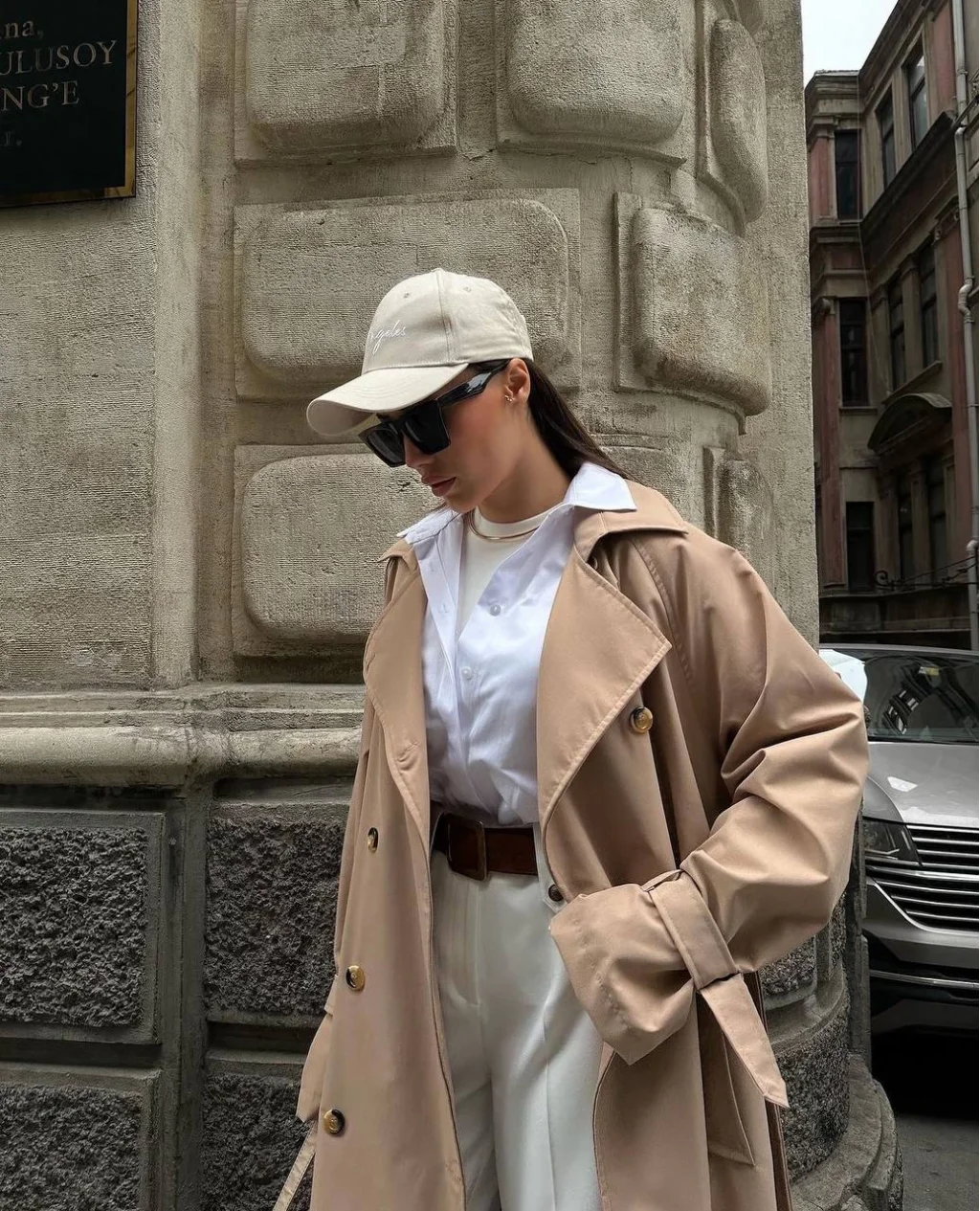 UZUN KOLLU, KRUVAZE YAKA, ÖNÜ DÜĞMELİ, YANLARI CEPLİ, KOLU VE BELİ KEMERLİ TRENÇKOT