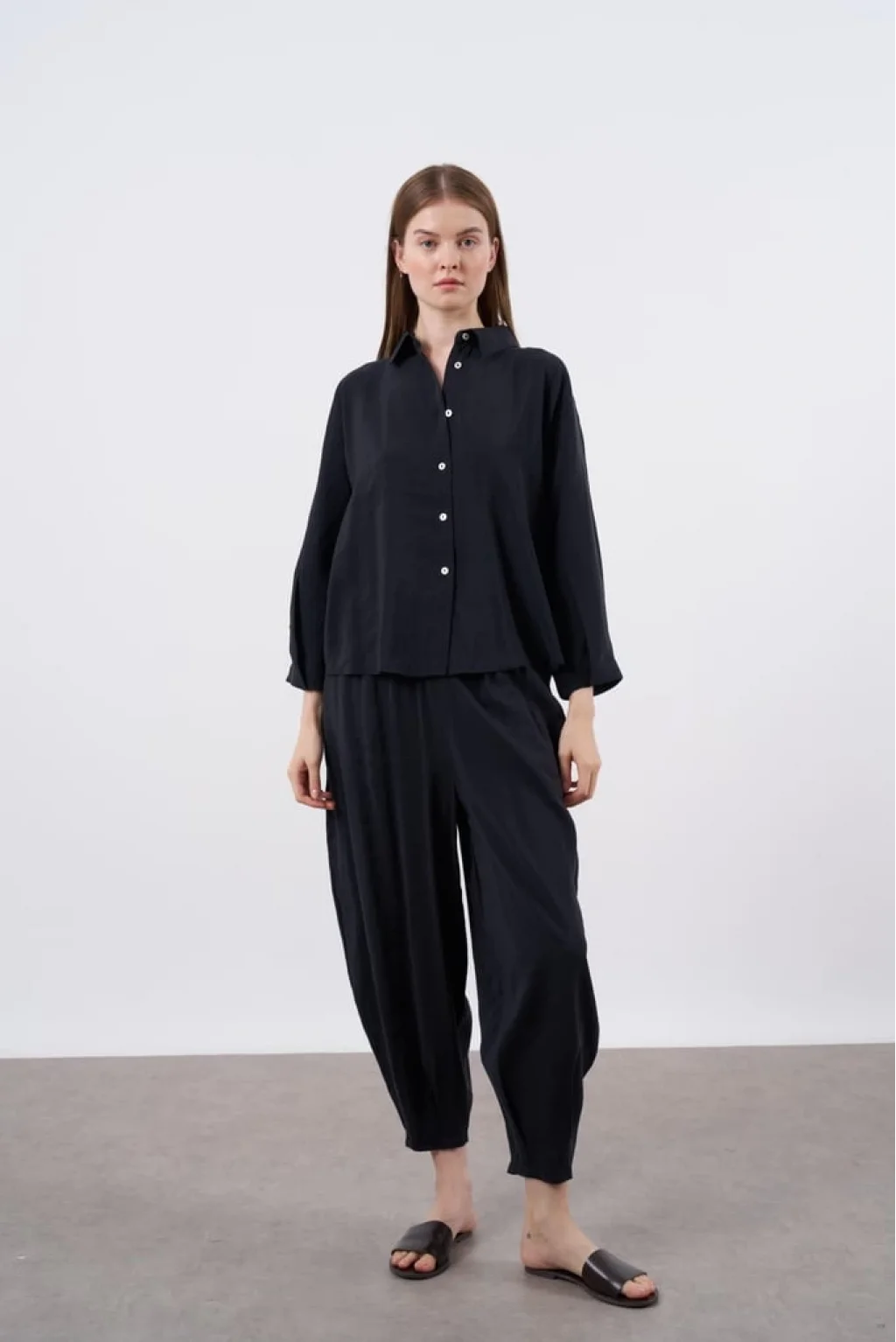 MYRA modal kumaş siyah gömlek pantolon ikili takım, şıklığı ve rahatlığı bir arada sunar.