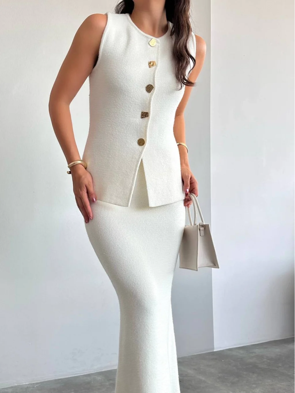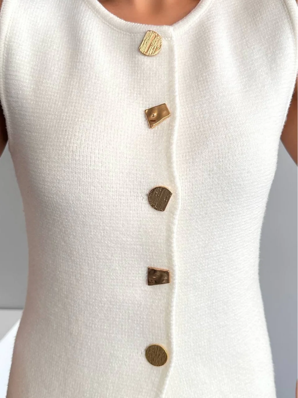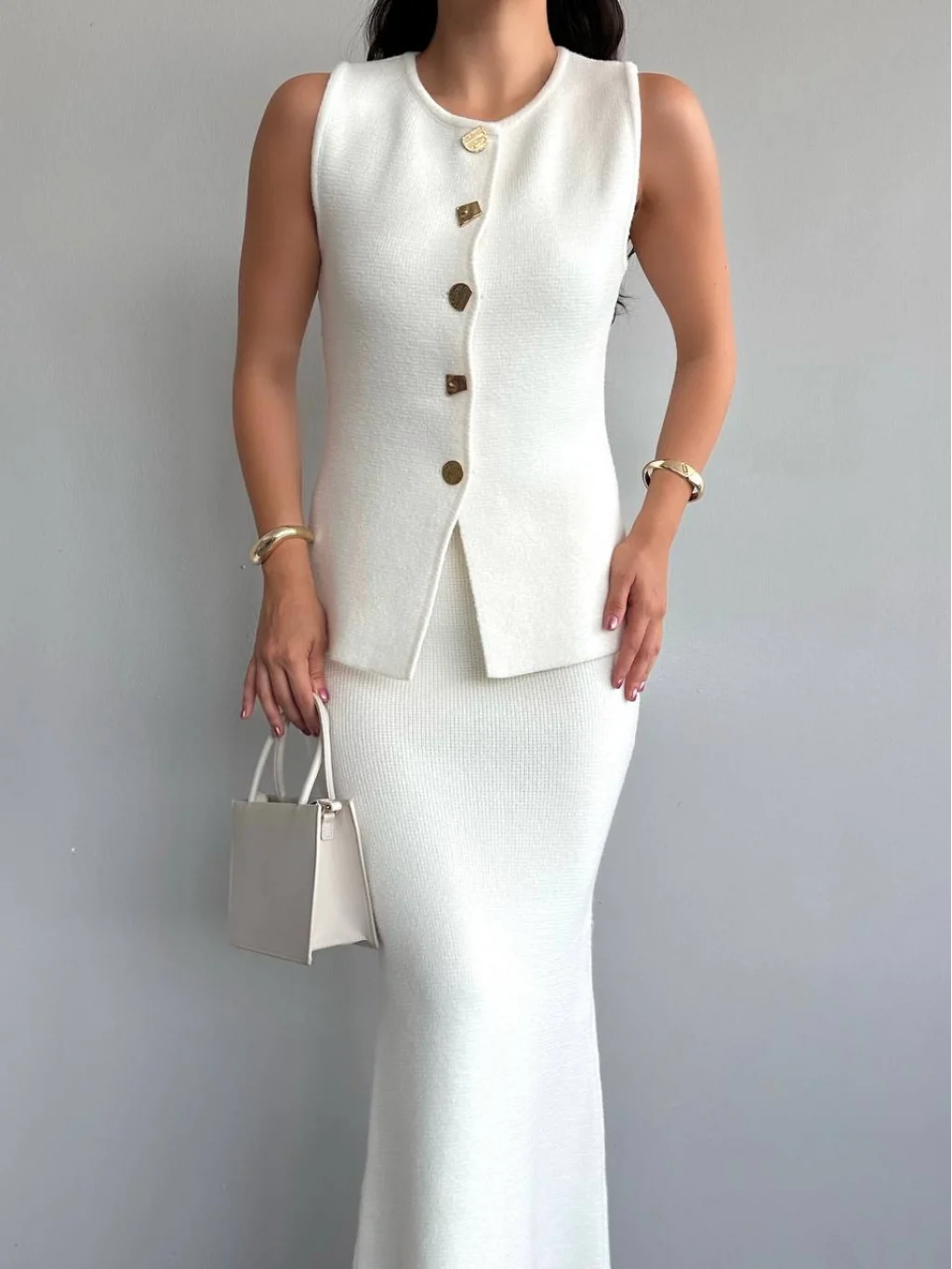 Myra Gold Düğmeli Yelek Etek Takım-Ekru