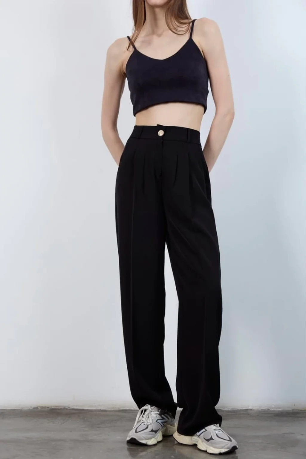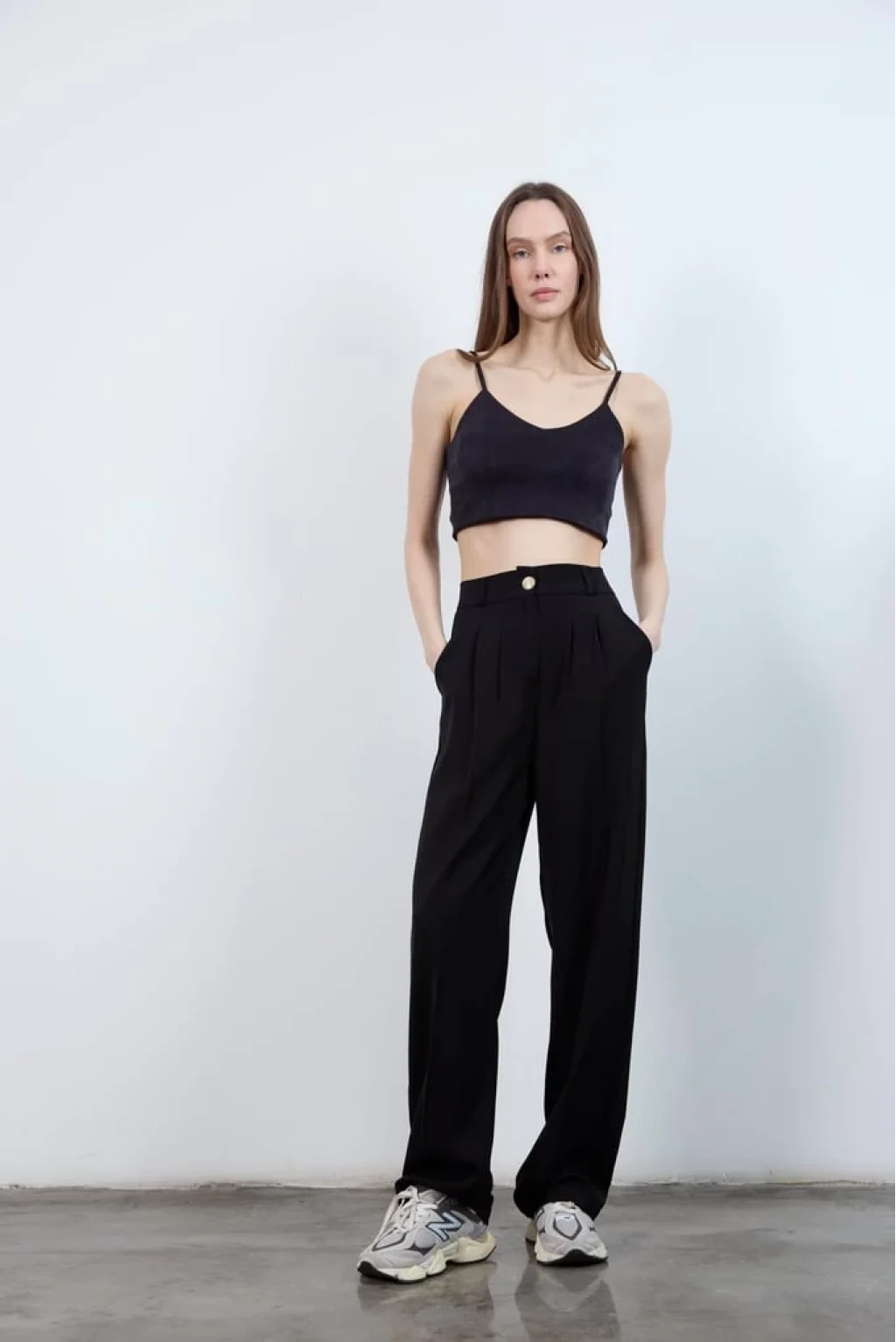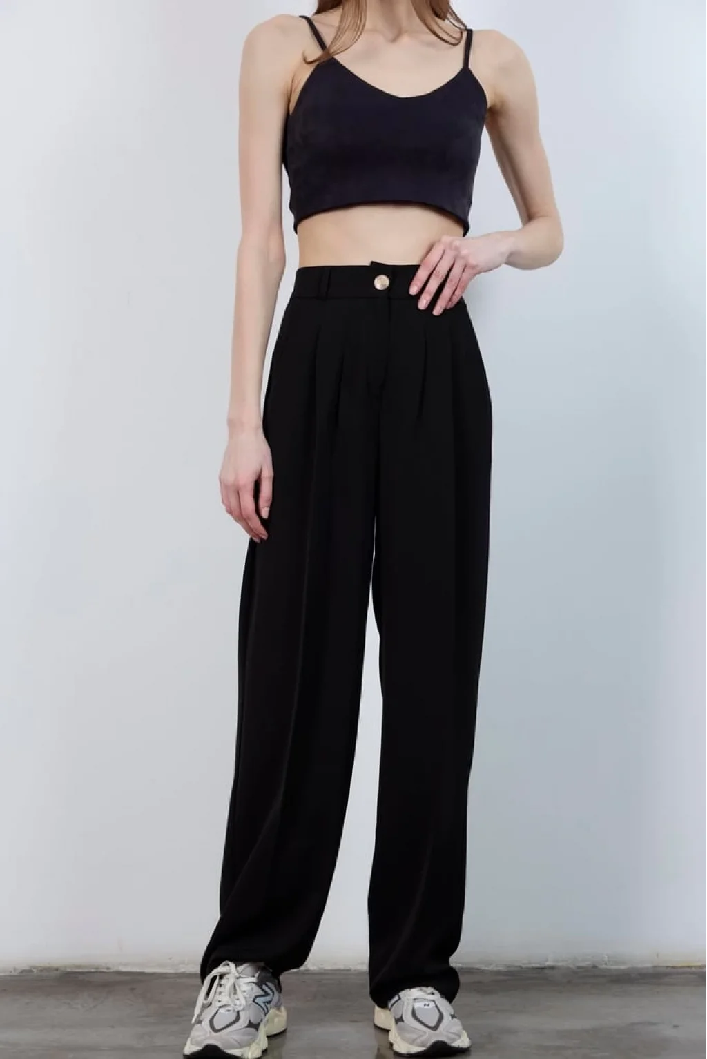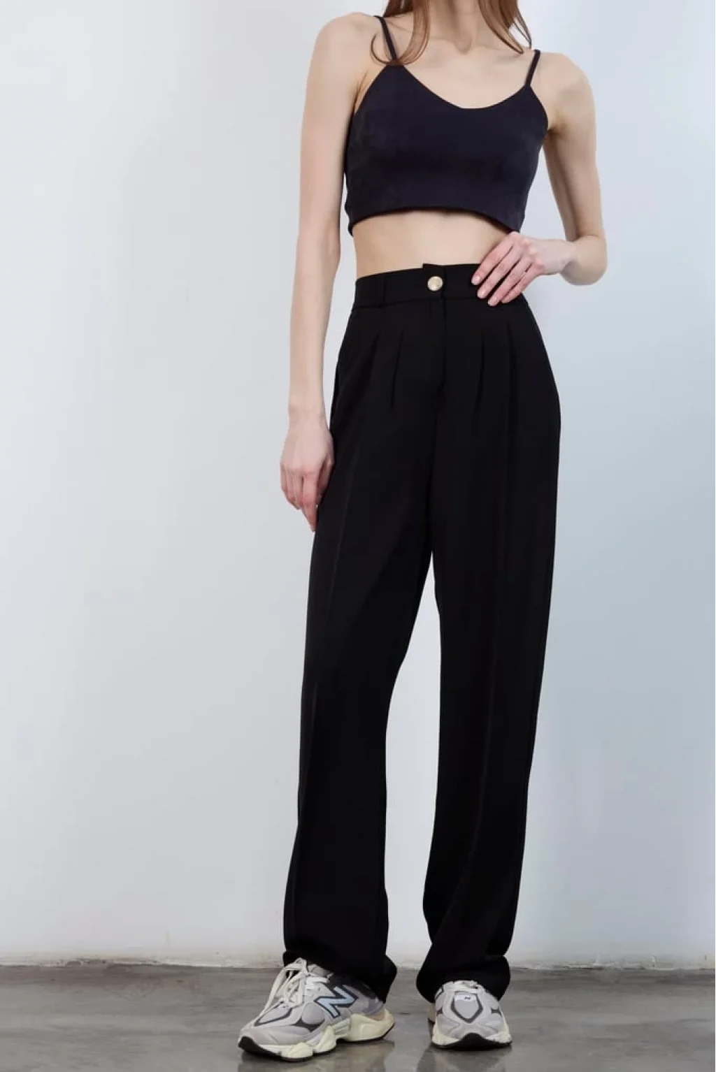 Myra Pileli Gold Düğme Palazzo Pantolon - Siyah