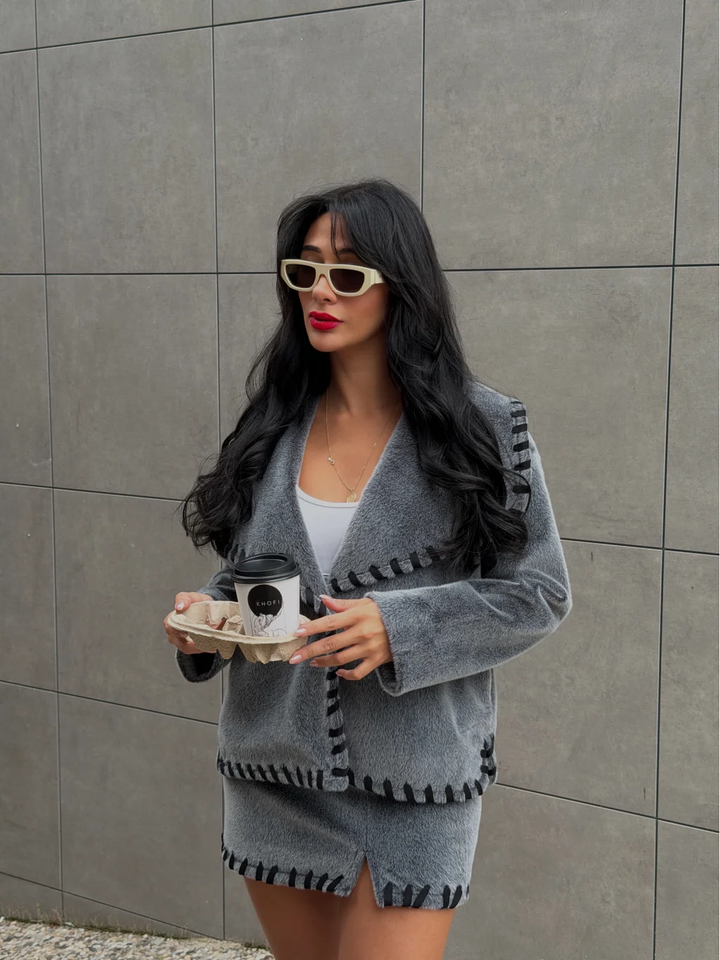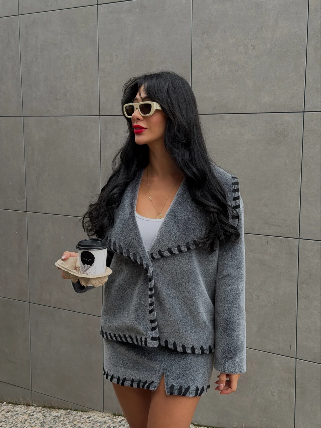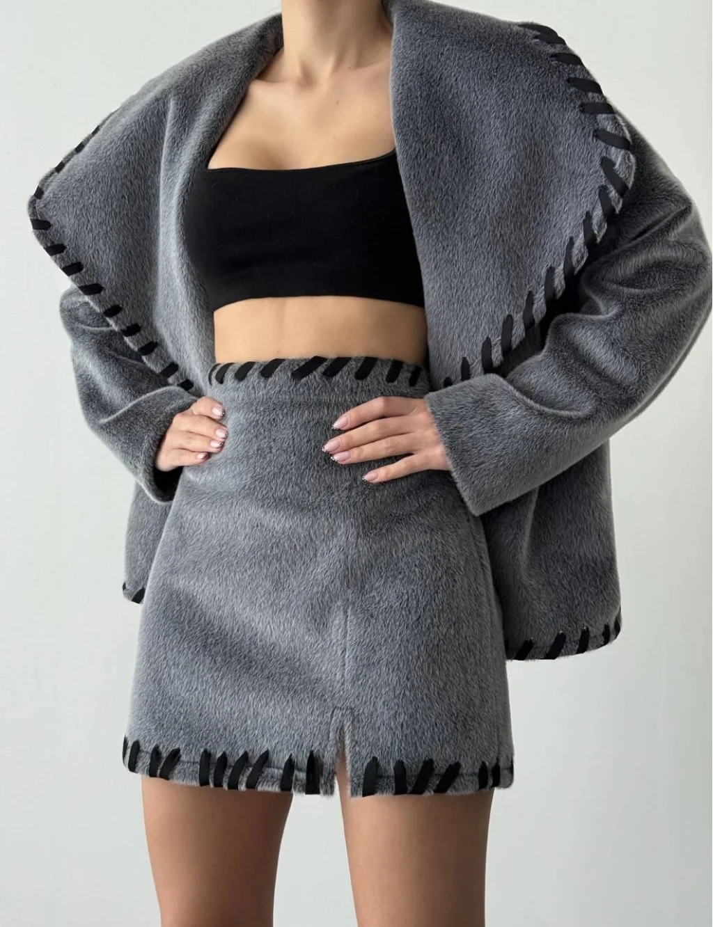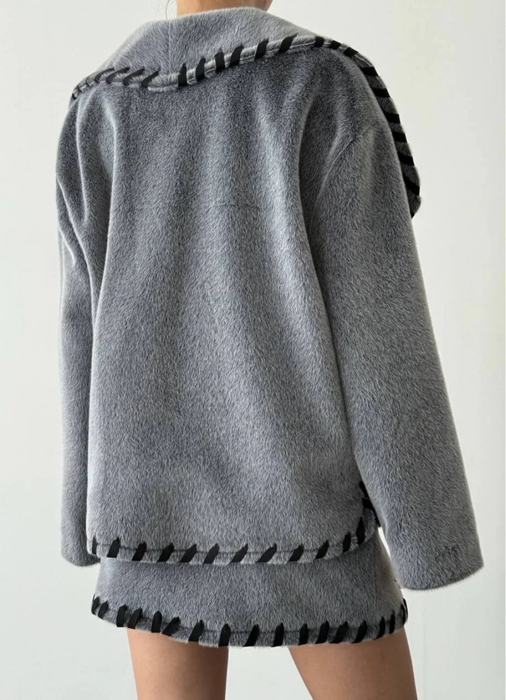 Nakış Detaylı Kürk Ceket Etek Takım-Gri