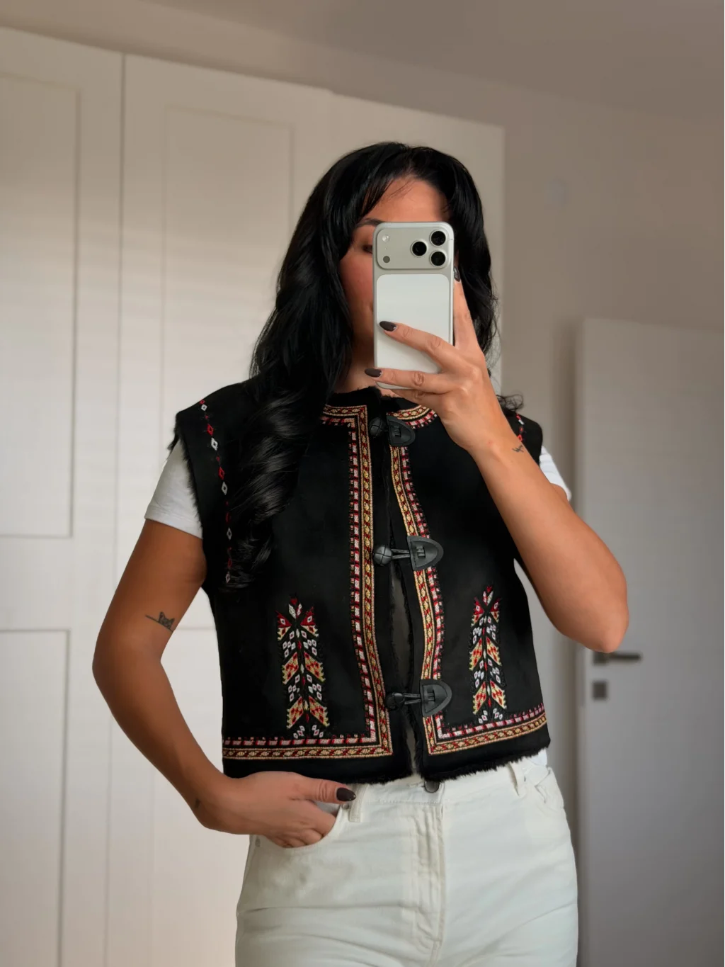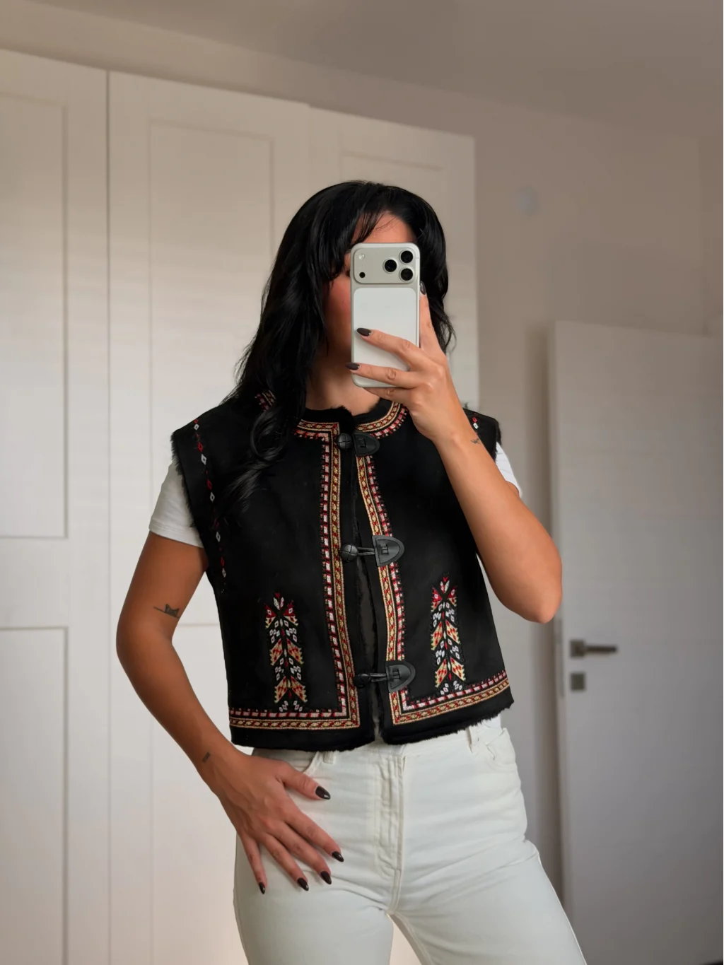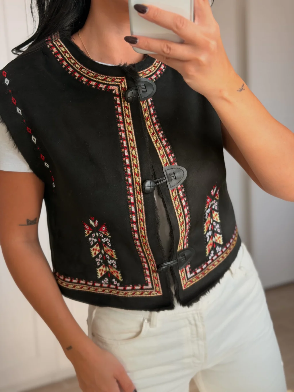 • MYRA'nın zarif nakış işlemeli siyah süet yeleği, gardırobunuzu şıklıkla tamamlamak için ideal bir seçimdir.