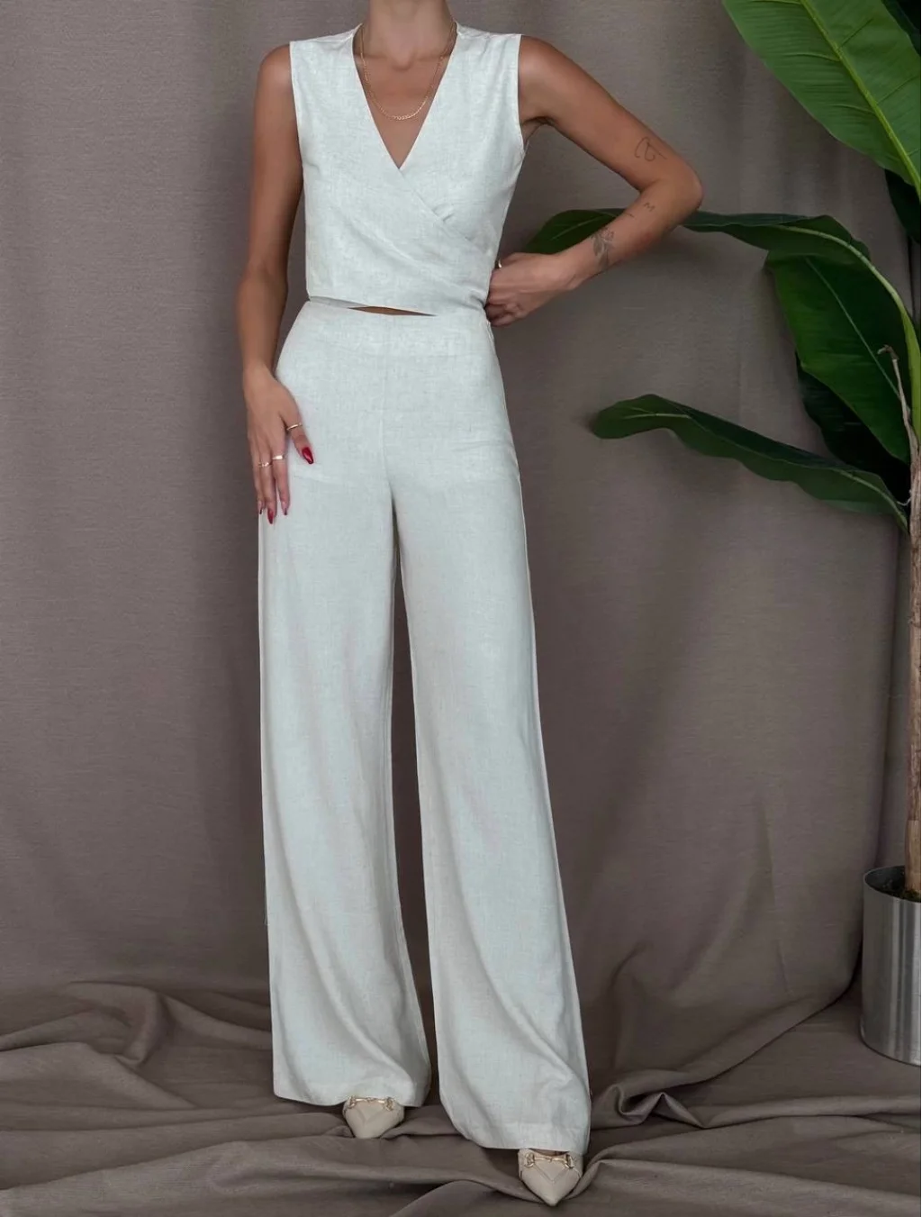 ÖNDEN BAĞLAMALI KETEN BLUZ PANTOLON TAKIM EKRU