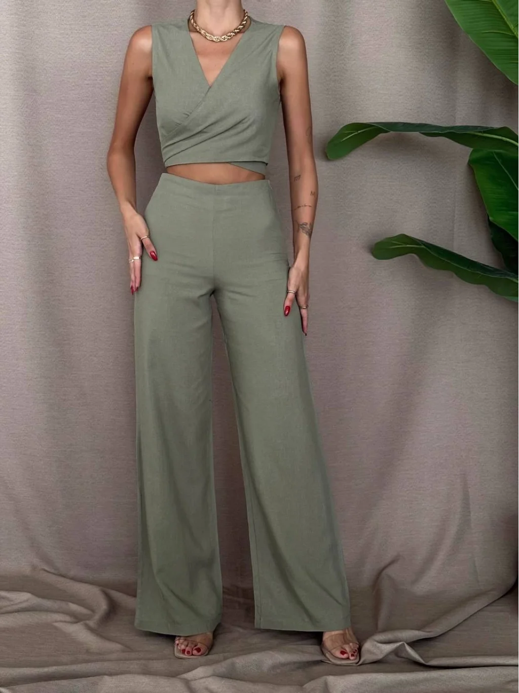 ÖNDEN BAĞLAMALI KETEN BLUZ PANTOLON TAKIM HAKİ