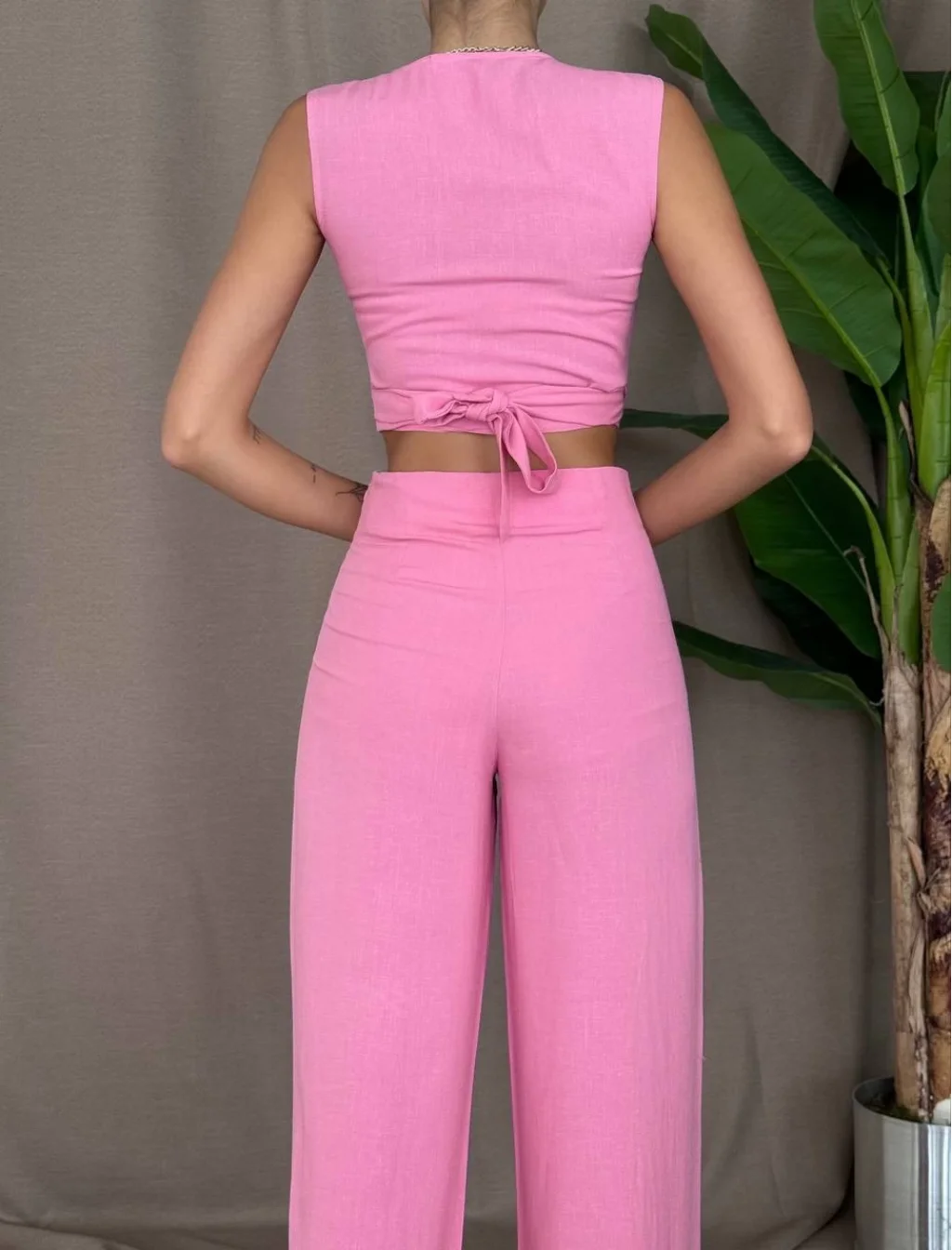 ÖNDEN BAĞLAMALI KETEN BLUZ PANTOLON TAKIM PEMBE