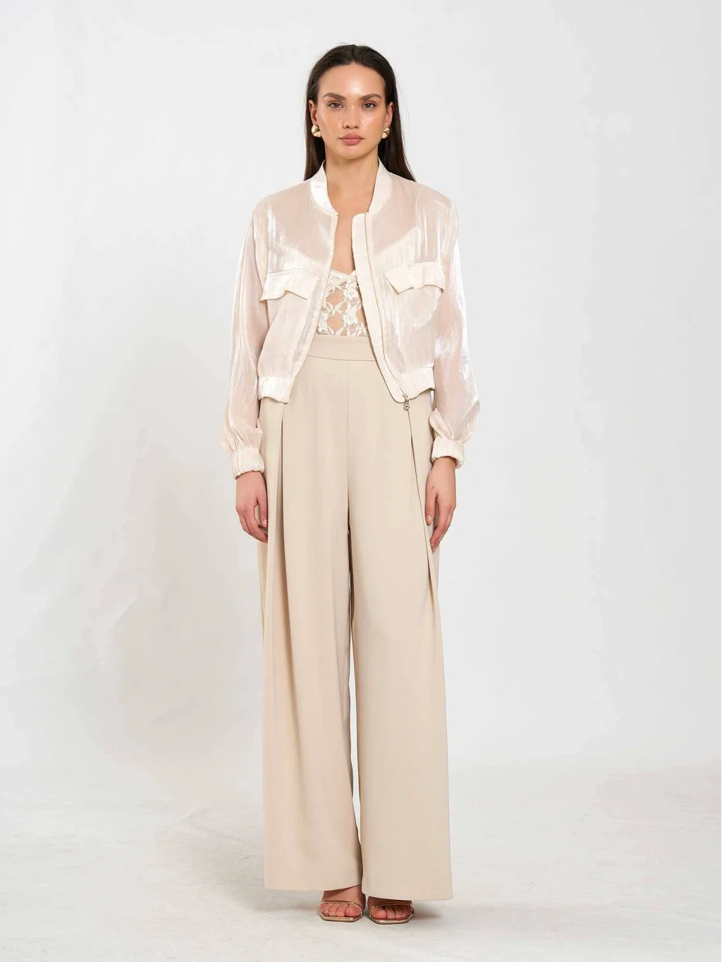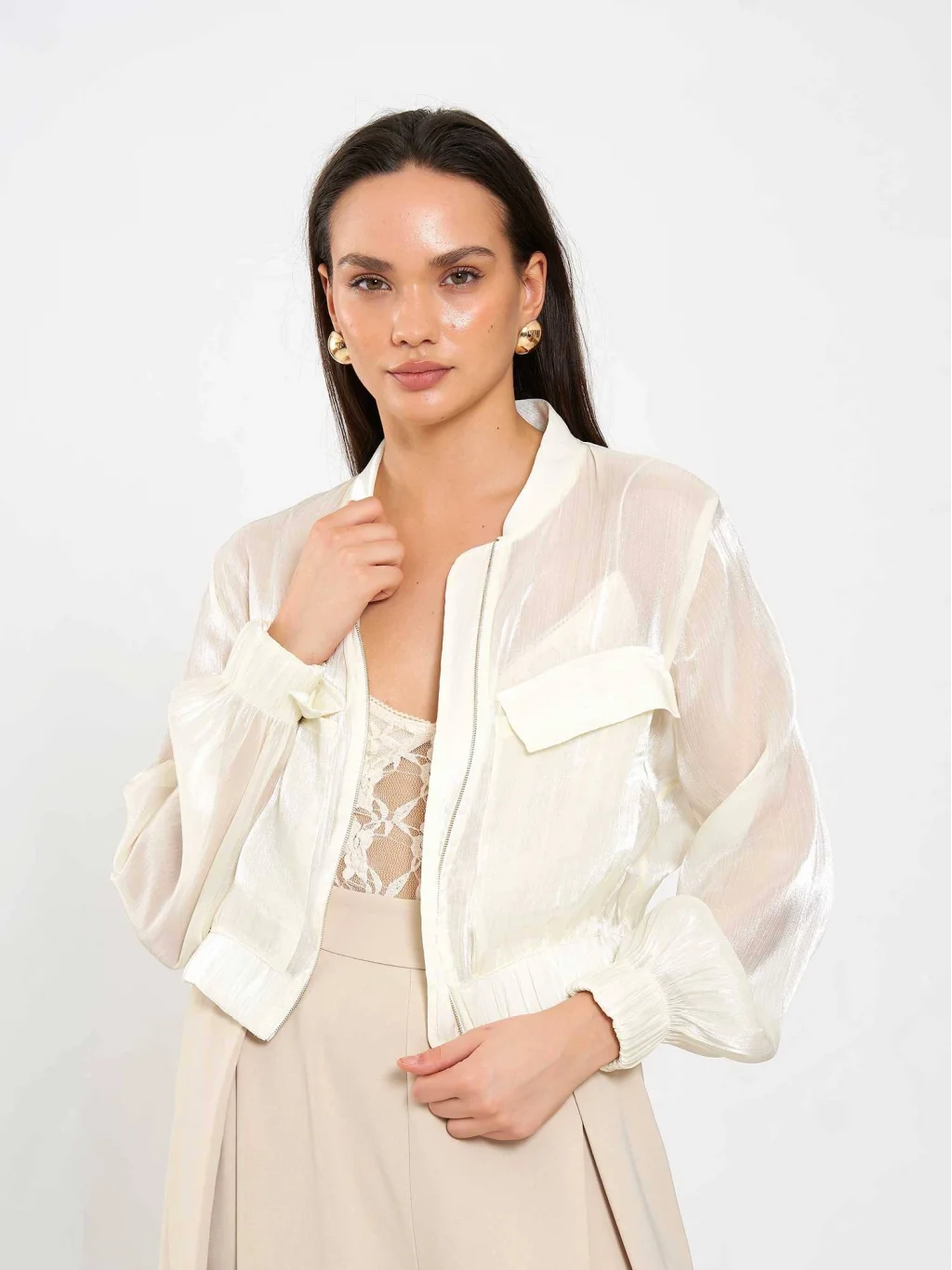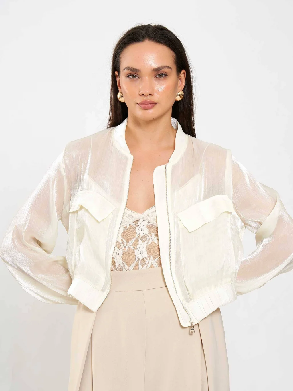 Ön iki cepli, fermuar kapamalı organze bej bomber ceket.