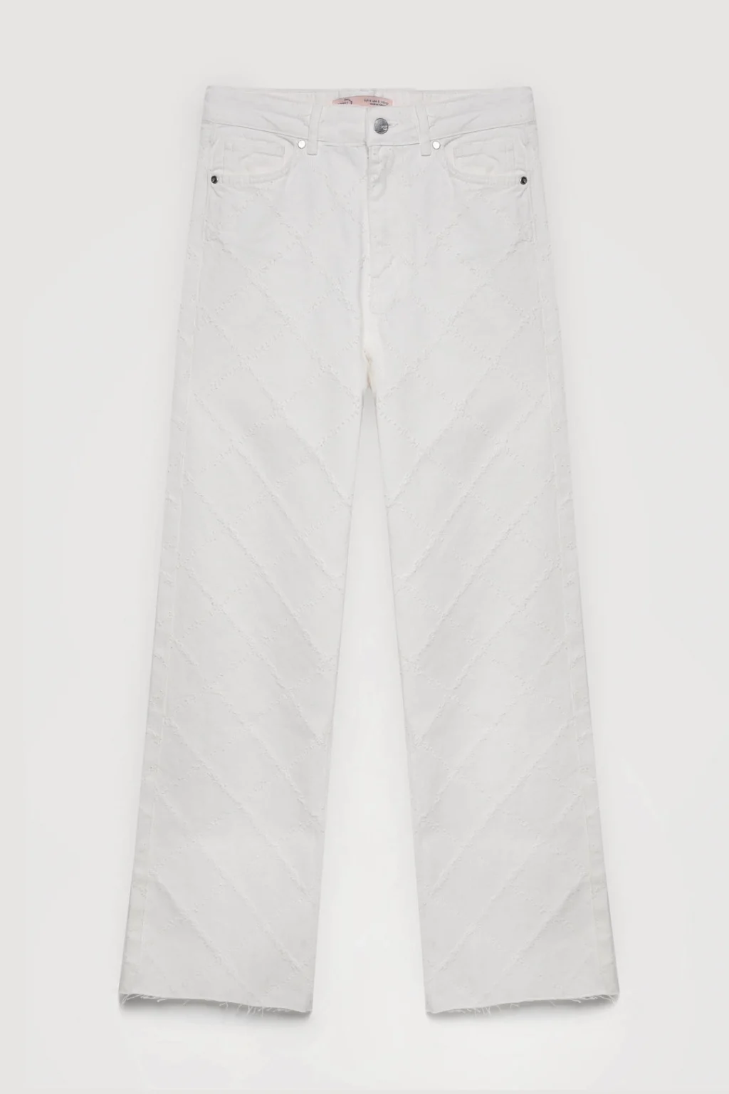 Çapraz örgü dikiş detaylı, yüksek bel, düz paça tasarımlı, paçaları kesik, yüksek bel, çift cepli, fermuar ve düğme kapamalı kot pantolon.
