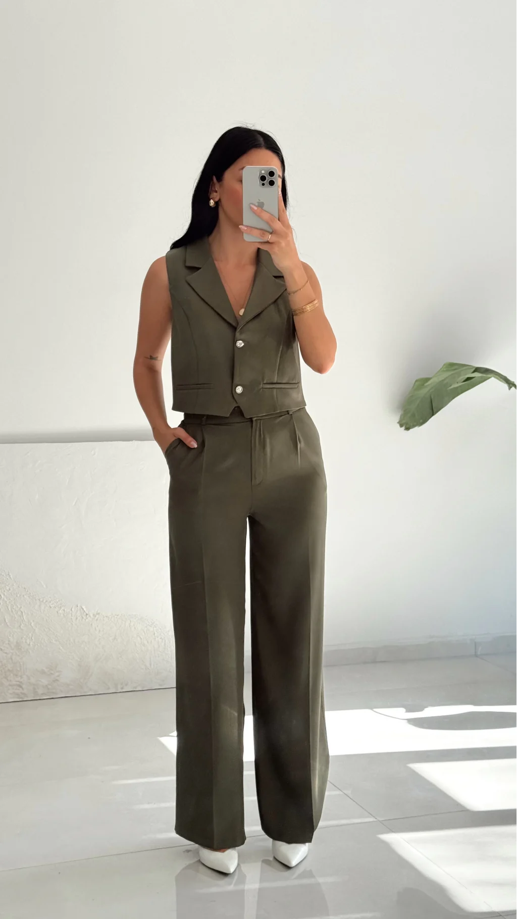 Yüksek Bel tek piliseli çift cepli geniş paça pantolon