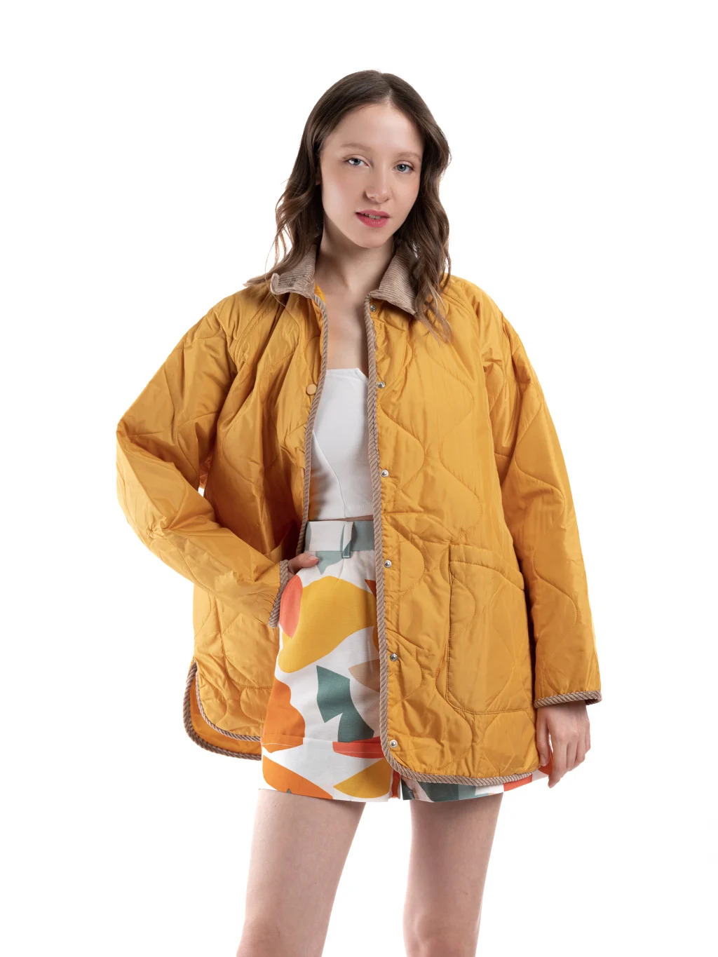 Oversize Kapitone Kadife Yaka Sarı Hardal Ceket Mont