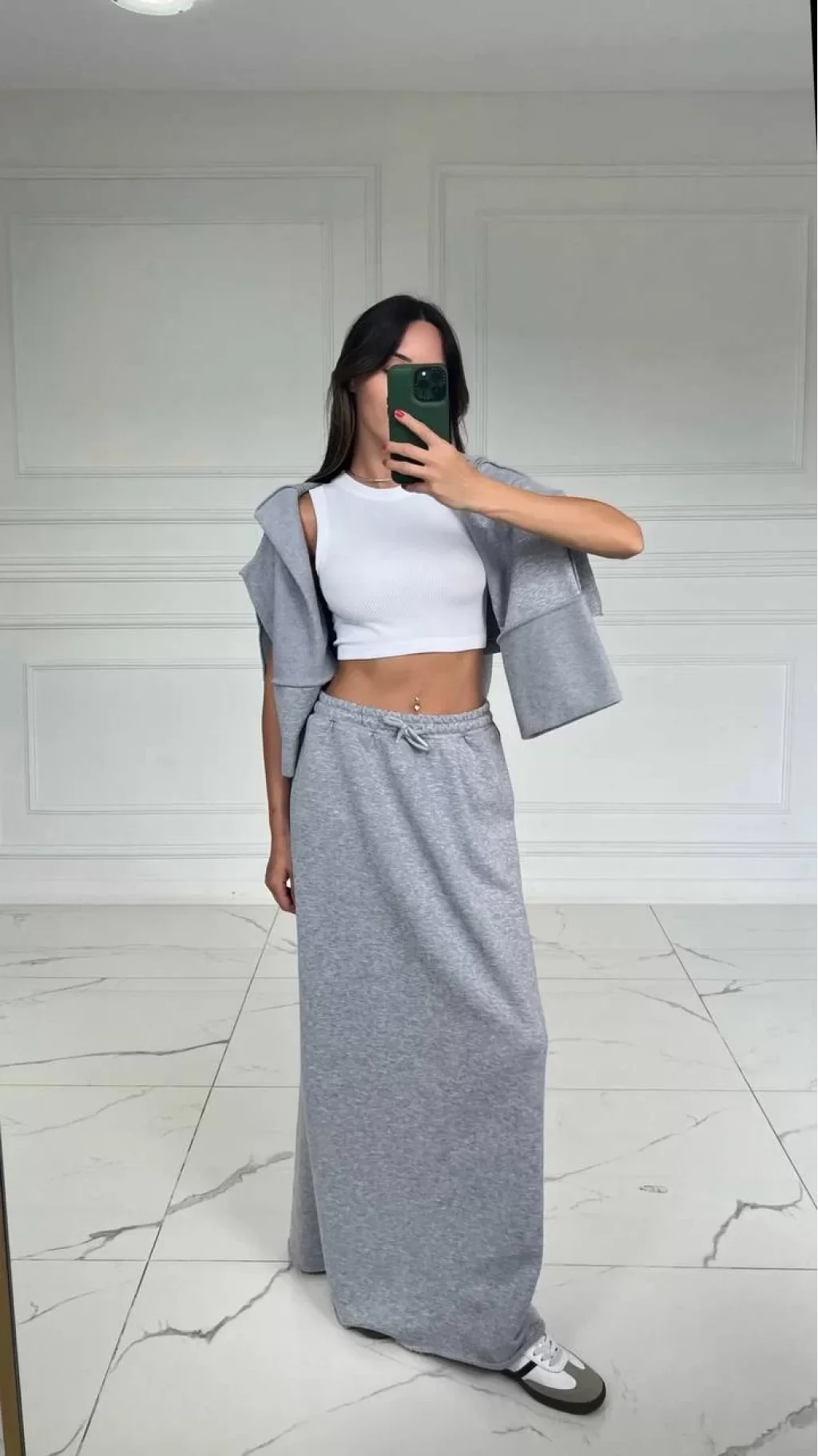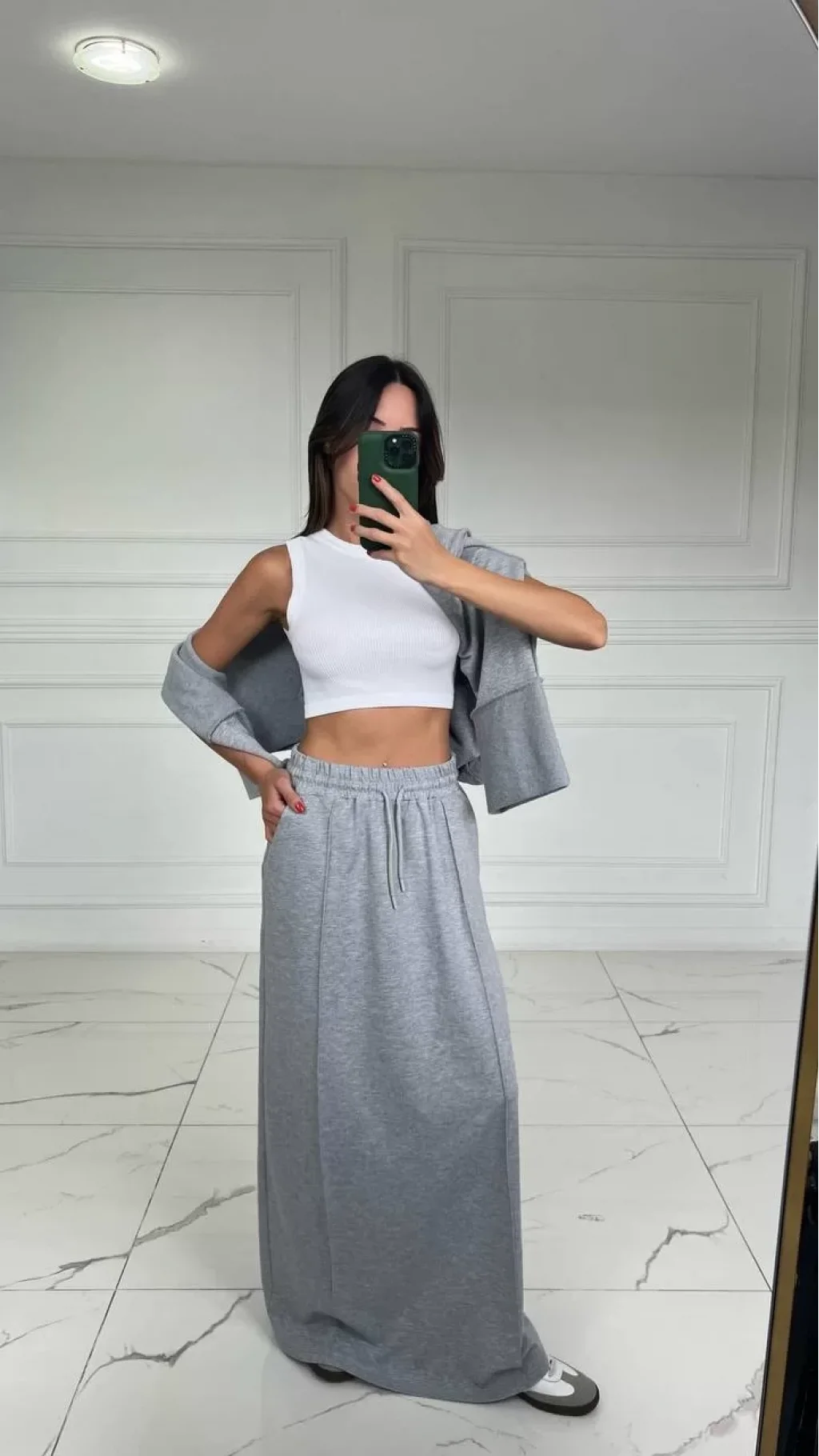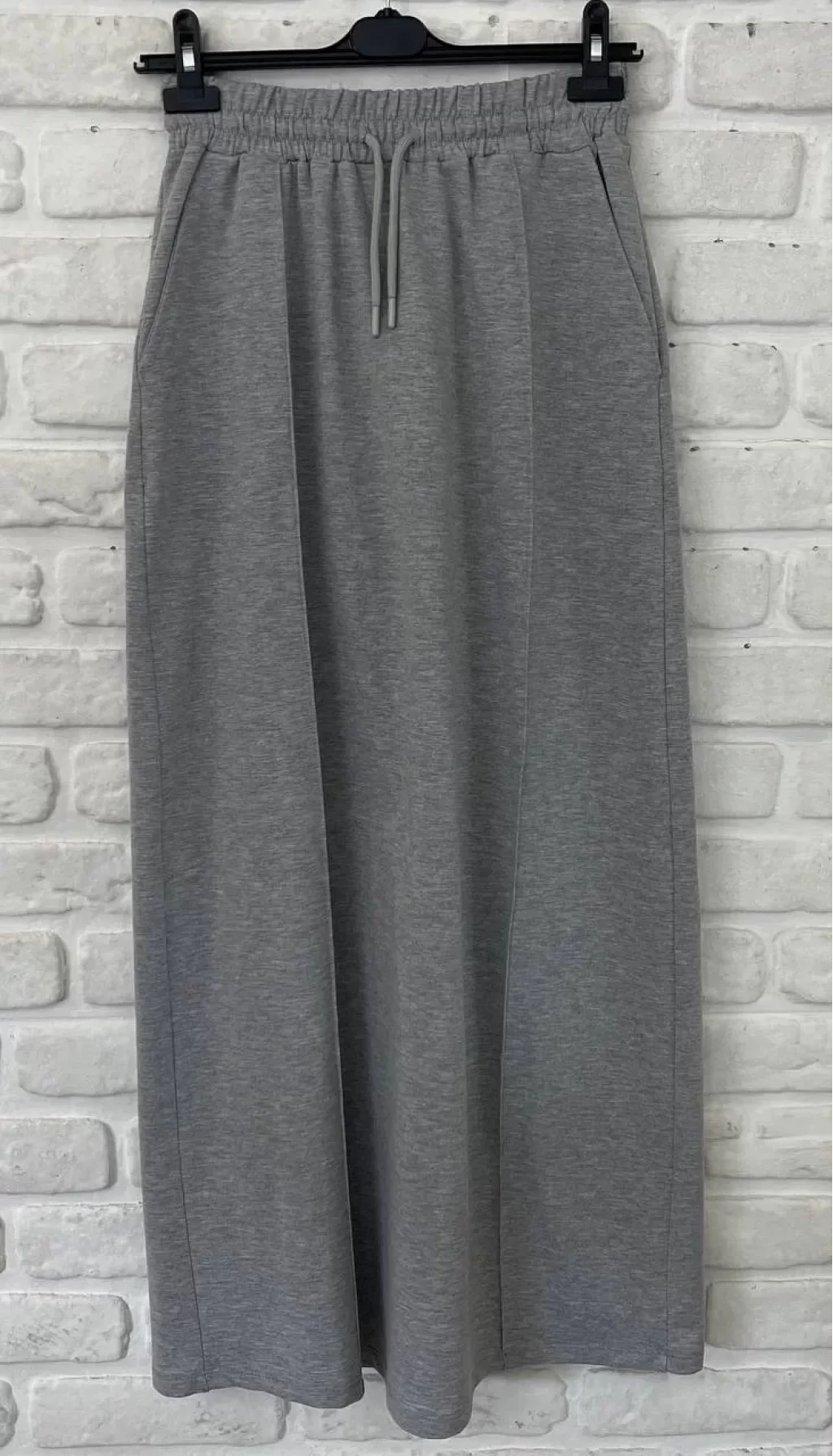 Pamuk Kumaş Yırtmaçlı Uzun Gri Etek